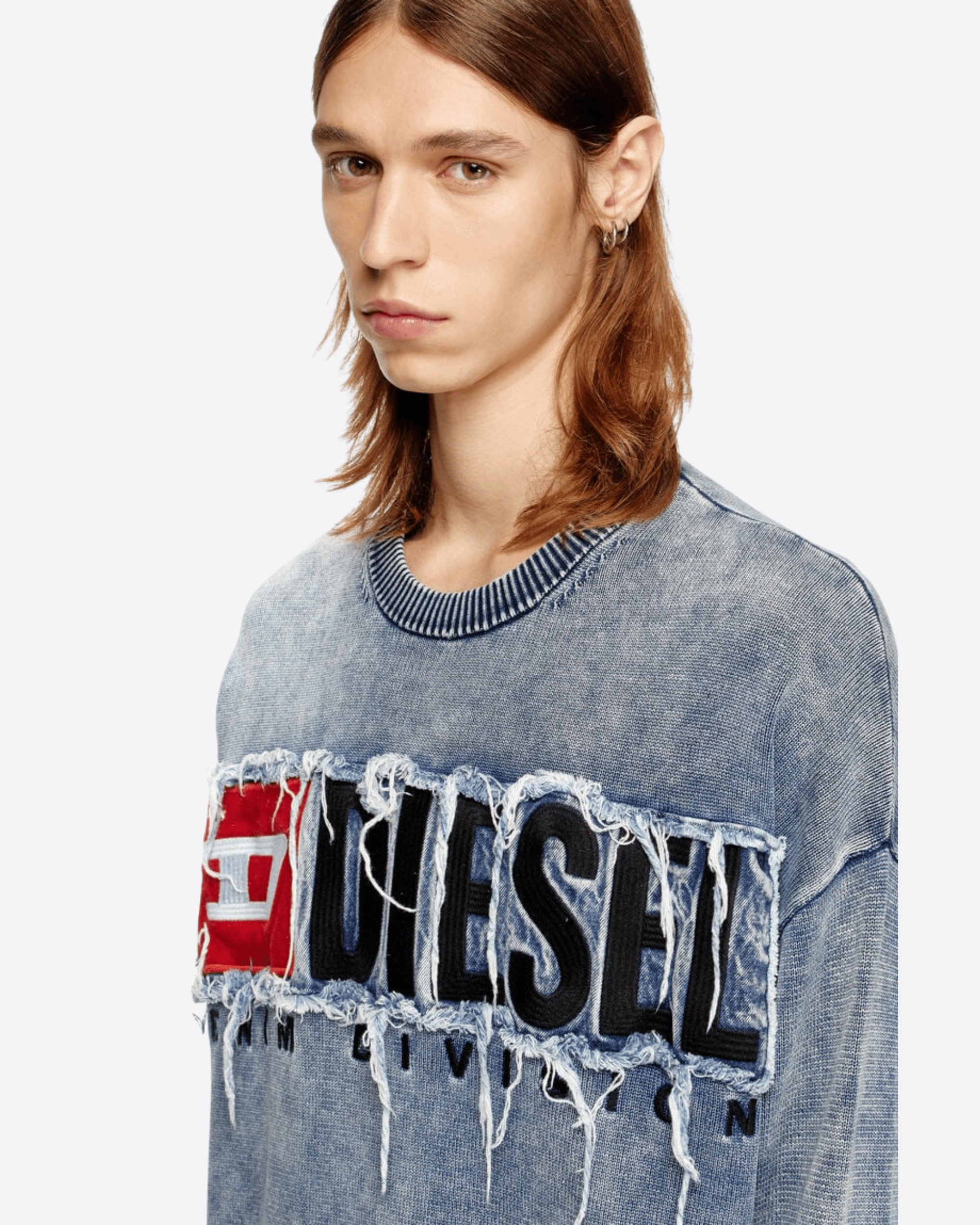 Questa maglia da uomo rappresenta pienamente il DNA del denim Diesel: è caratterizzata da uno stile vissuto, una sfumatura marmorizzata e dalla patch ricamata in denim sfrangiato. Realizzata in cotone biologico color indaco, ha maniche a giro basso e bordi a costine.