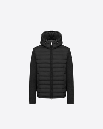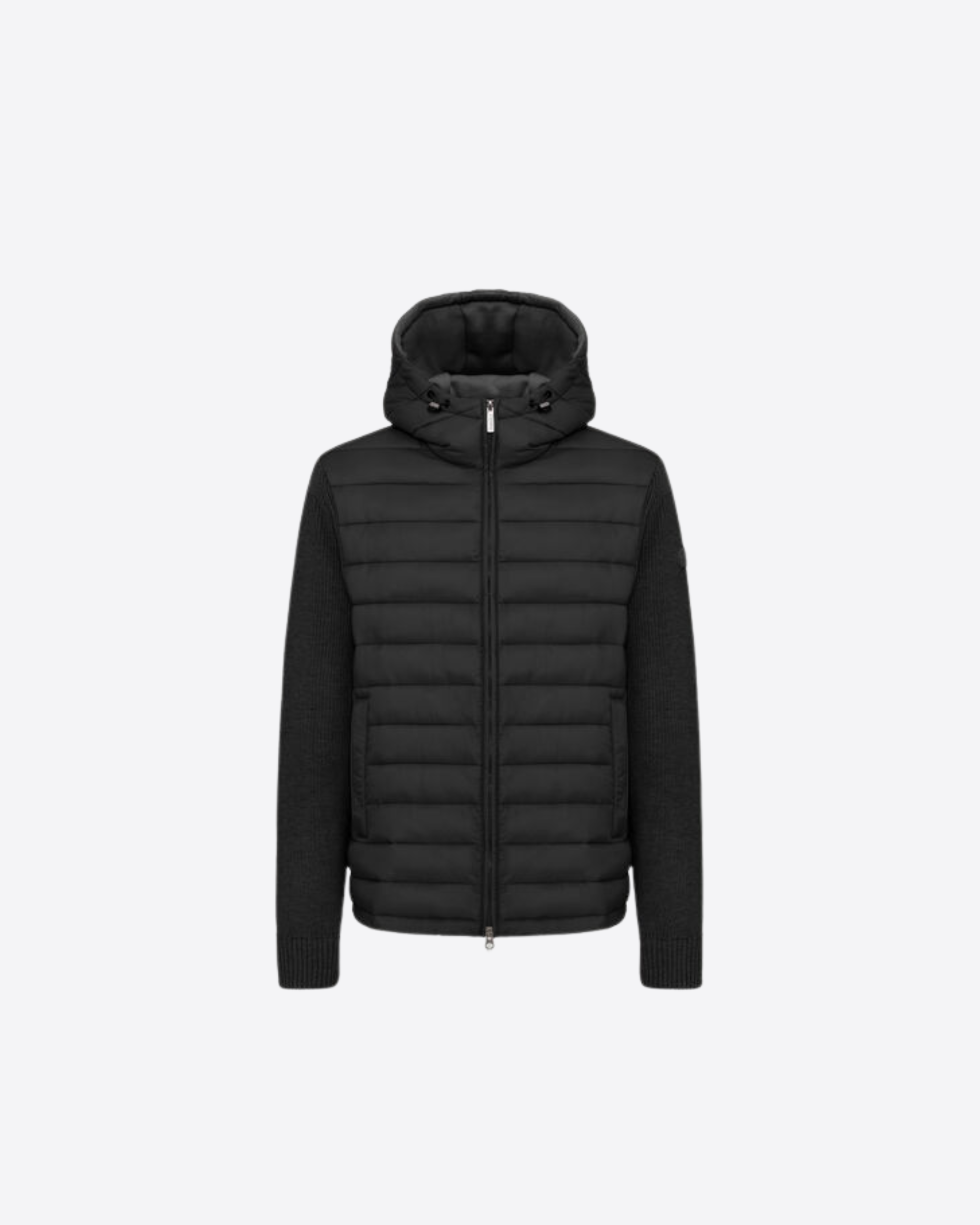 Un perfetto equilibrio, questa giacca unisce un'imbottitura trapuntata frontale a inserti in maglia e felpa. Il cappuccio regolabile, la coulisse sul fondo e le tasche laterali con zip aggiungono un tocco tecnico, mentre le maniche a costine e il retro in felpa ne accentuano l’anima sportiva. Ideale per il quotidiano durante la stagione autunnale.