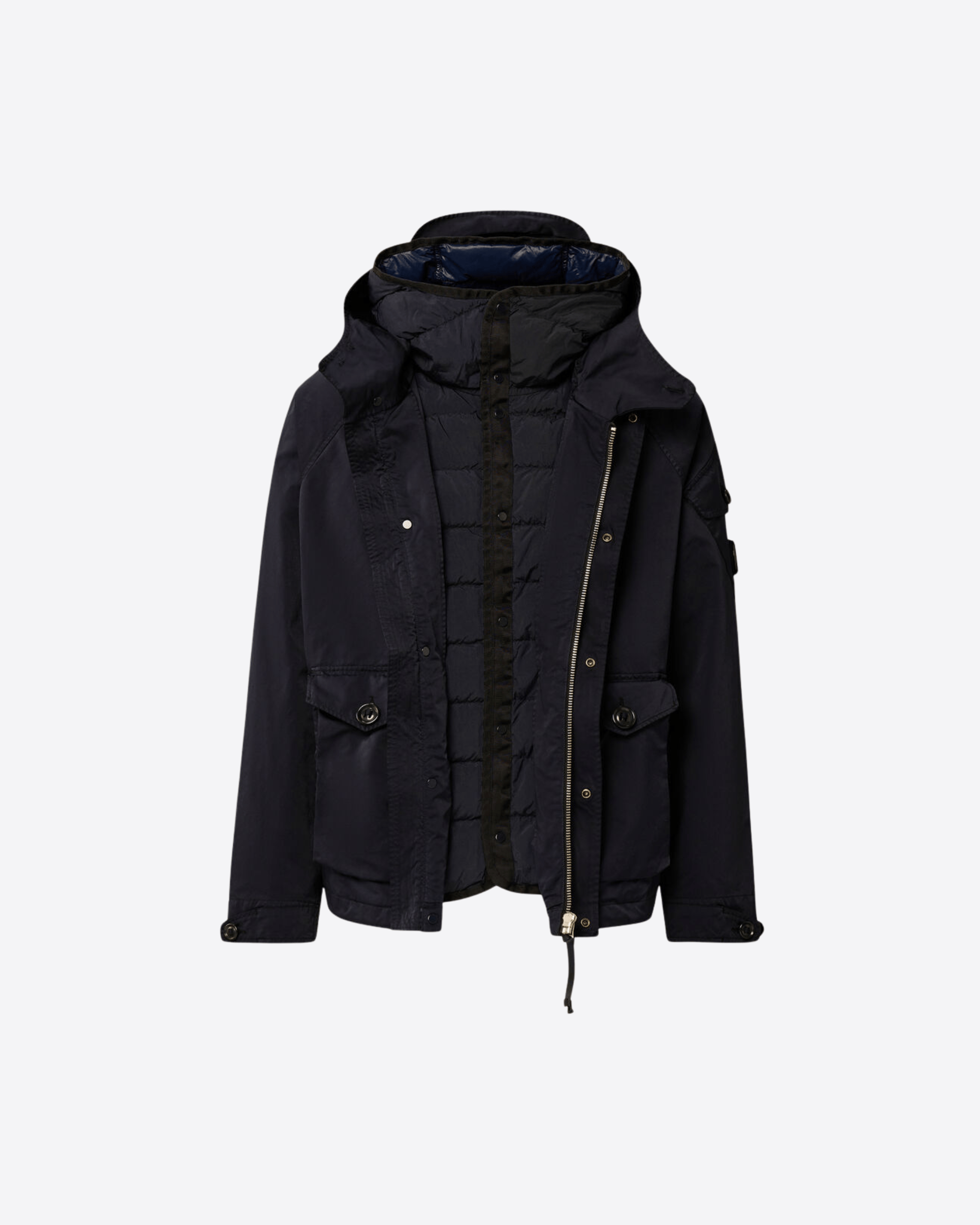 Giacca con cappuccio realizzata in Micro Kei, una microfibra di poliestere/nylon morbida e resistente, progettata per garantire protezione in ogni condizione climatica. Il capo presenta cappuccio con visiera regolabile e protezione per il viso con bottoni, chiusura full zip nascosta con patta e bottoni automatici, tasche applicate frontali con bottoni e apertura laterale con automatico. Completata con tasca applicata a bottoni sulla manica con Lente, polsini regolabili con bottoni e piumino interno staccabile con cappuccio e bottoni automatici. Tinta in capo con trattamento anti-goccia. Regular fit.