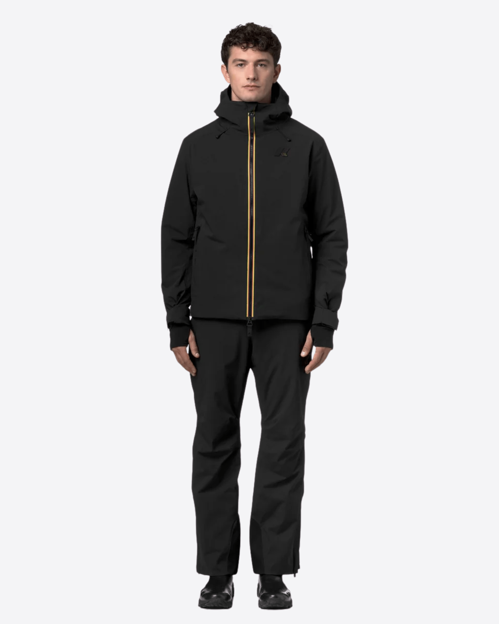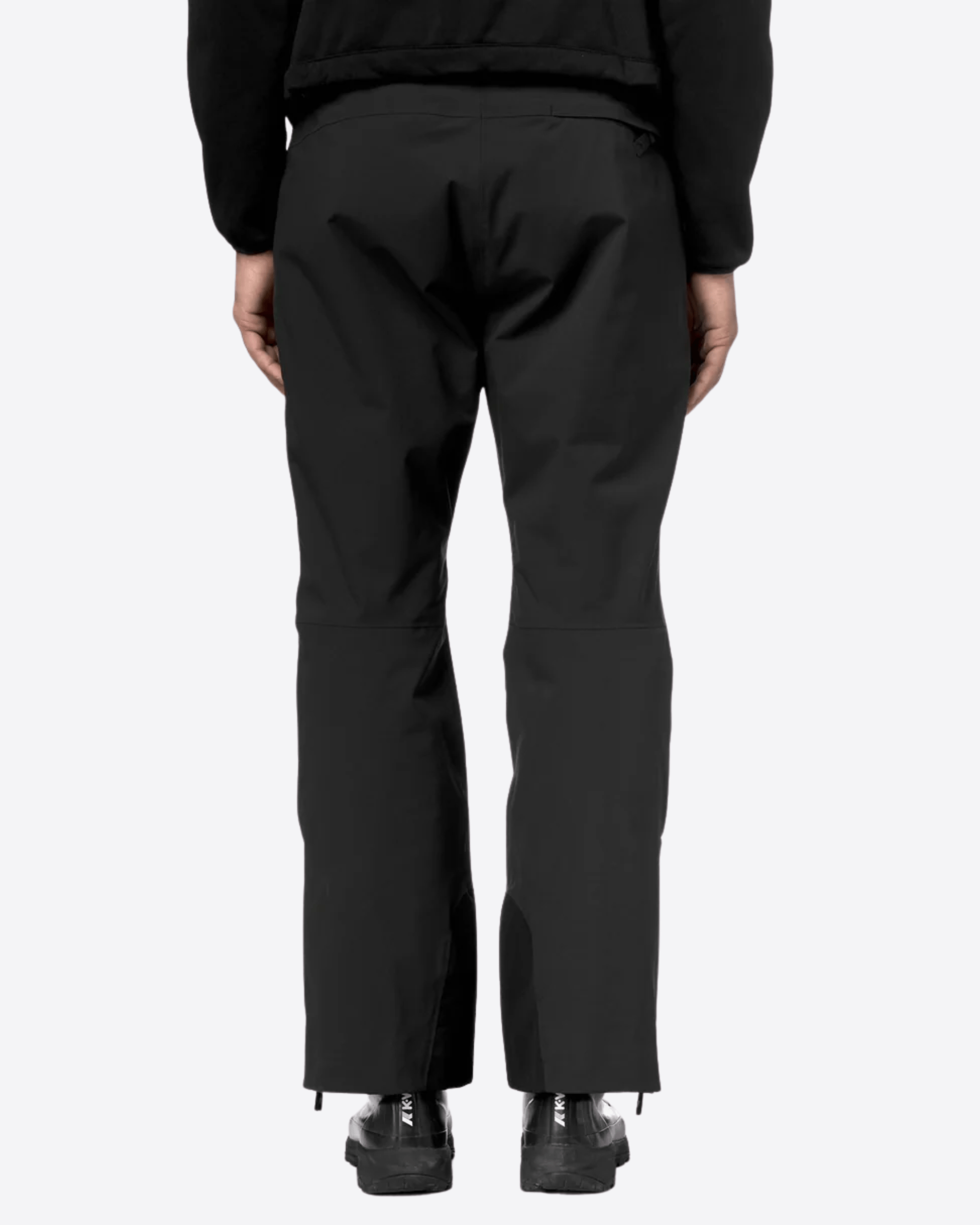 In tessuto a due strati impermeabile e traspirante (20.000 mm/20.000 g/m2/24h), con imbottitura PrimaLoft e fodera in poliestere per un elevato grado di calore. È dotato di cuciture termonastrate, chiusura con zip e bottoni, vita regolabile, anello porta guanti e tasche con zip. Include zip di aerazione interna, ginocchia ergonomiche e fondo gamba con apertura a zip, patta con strap, rinforzo e ghetta interna. Vestibilità regolare e logo in silicone nero.