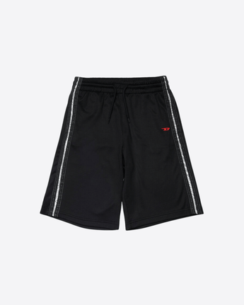 Pantaloncini corti da bambino realizzati in un resistente misto poliestere e cotone, con cintura elastica e coulisse per una vestibilità sicura. Bande laterali con dettagli a contrasto percorrono le gambe, mentre il logo D rosso in gomma sul davanti aggiunge un tocco distintivo.