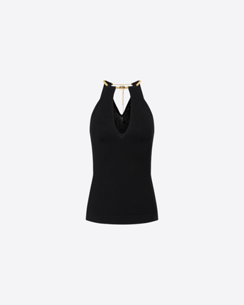 Top in maglia dalla vestibilità aderente. Ha scollo profondo all'americana sul davanti e sul retro. Si distingue per la collana in trama snake con logo, amovibile e flessibile per sperimentare molteplici opzioni di styling.