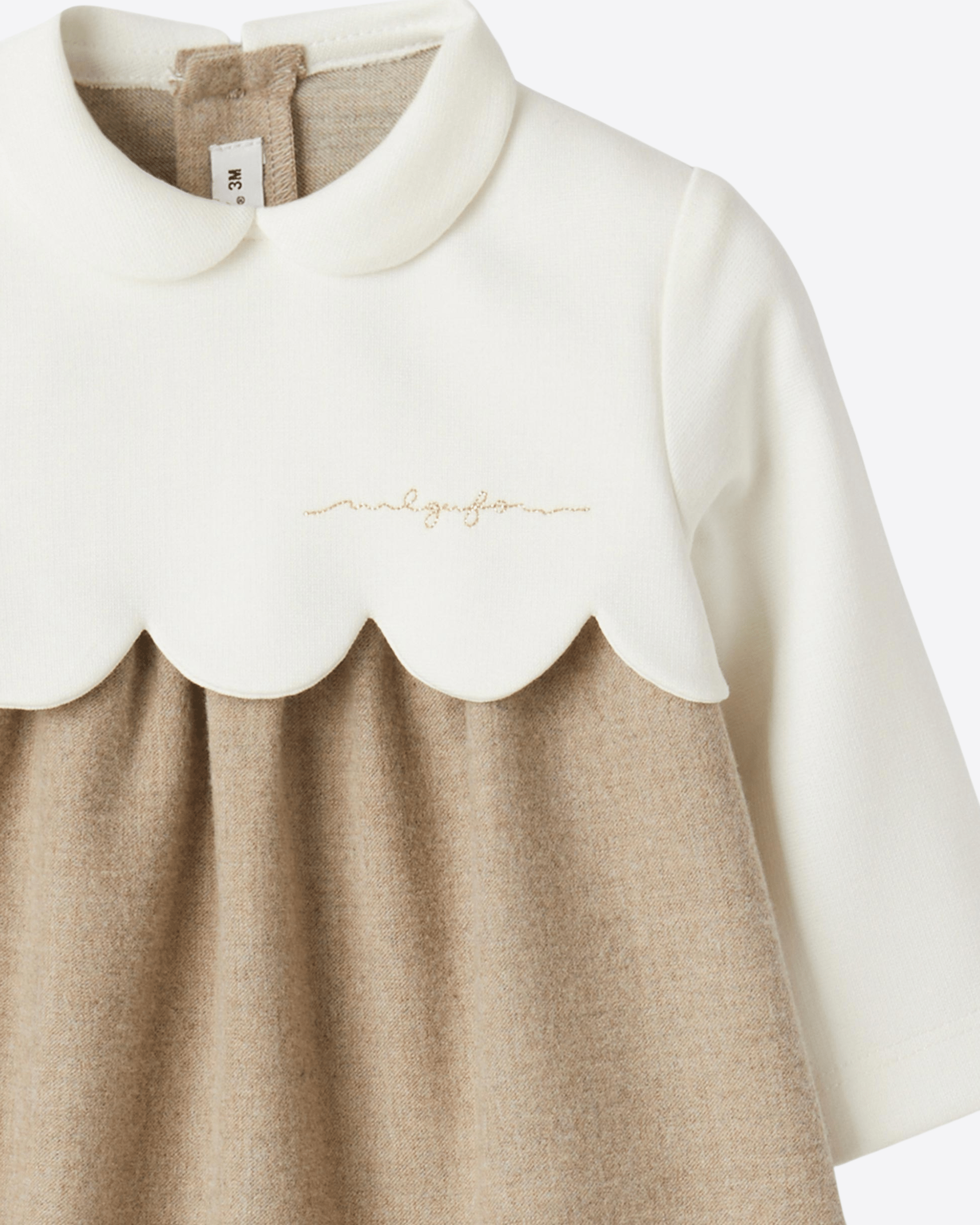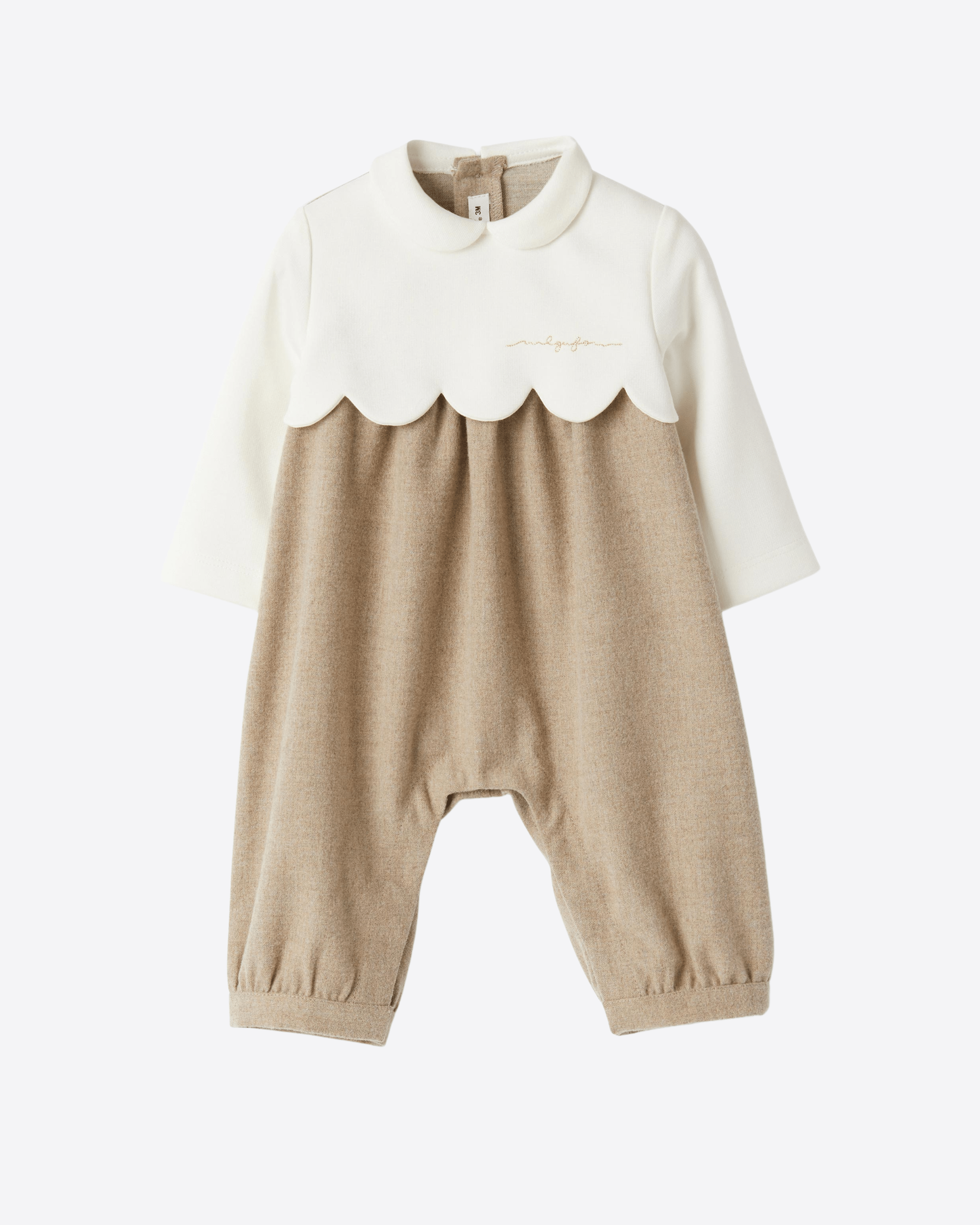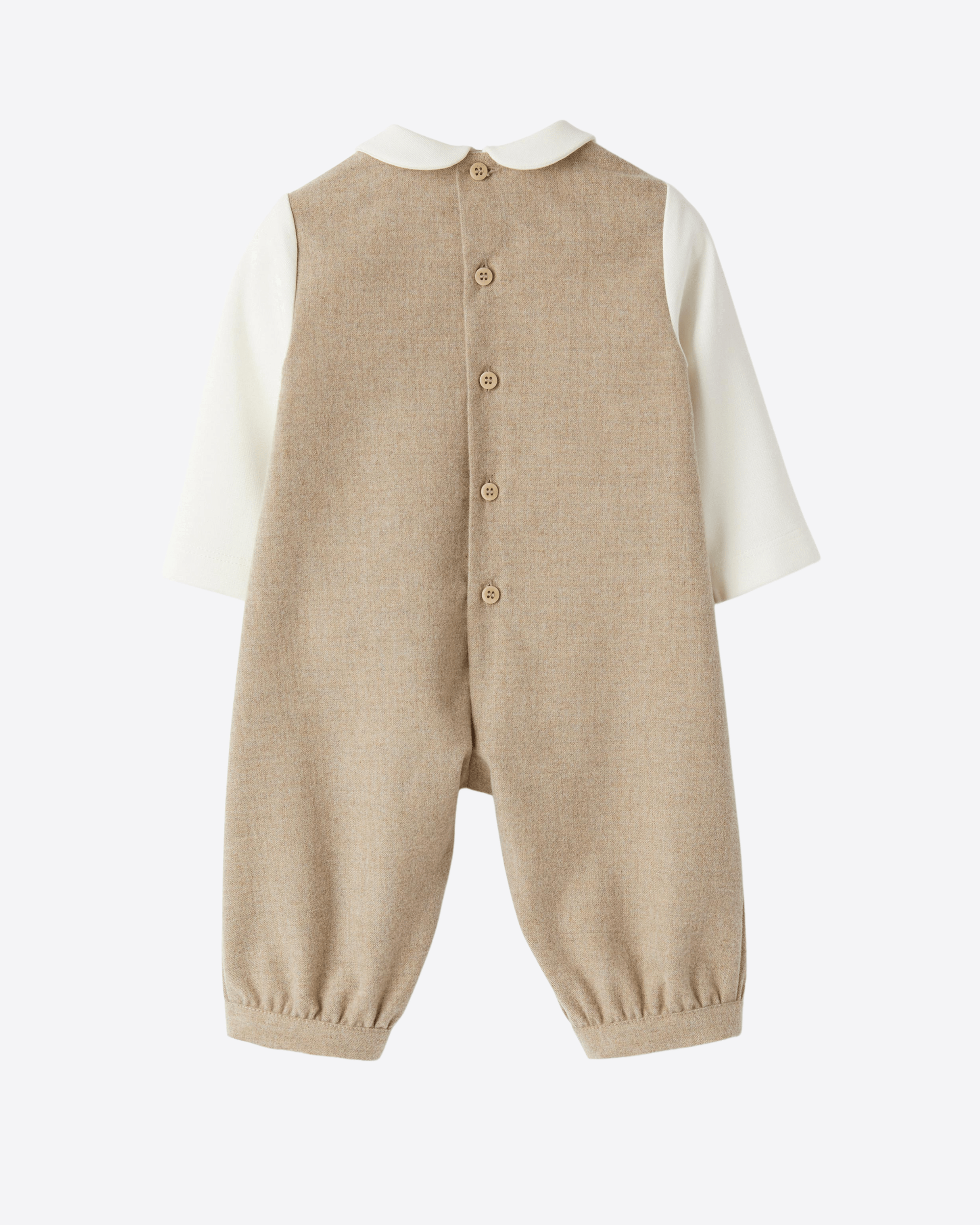 Tutina in punto milano e tecno lana con colletto tondo e motivo di cappe. Il capo presenta apertura con bottoni a pressione sul fondo e bottoni sul retro.