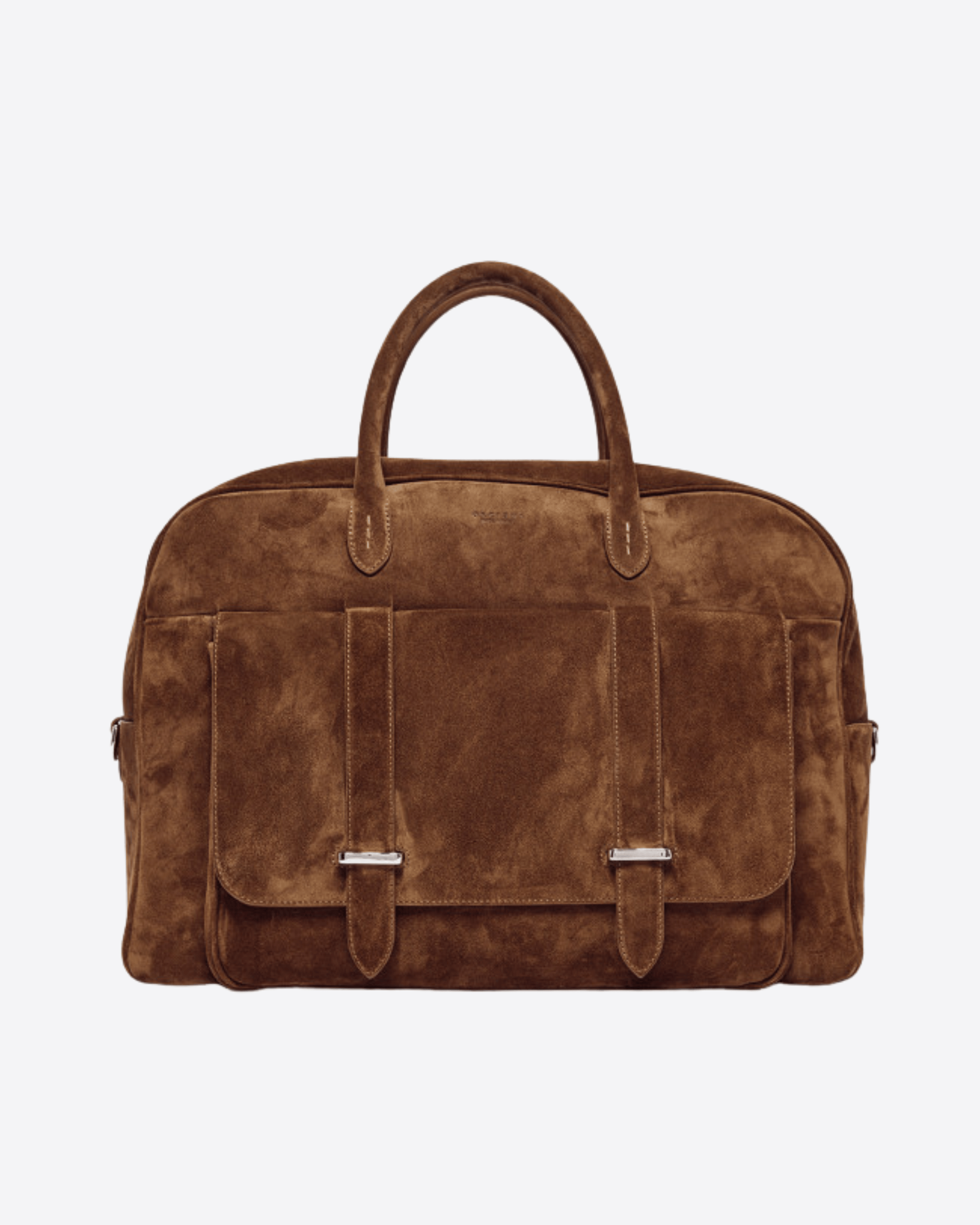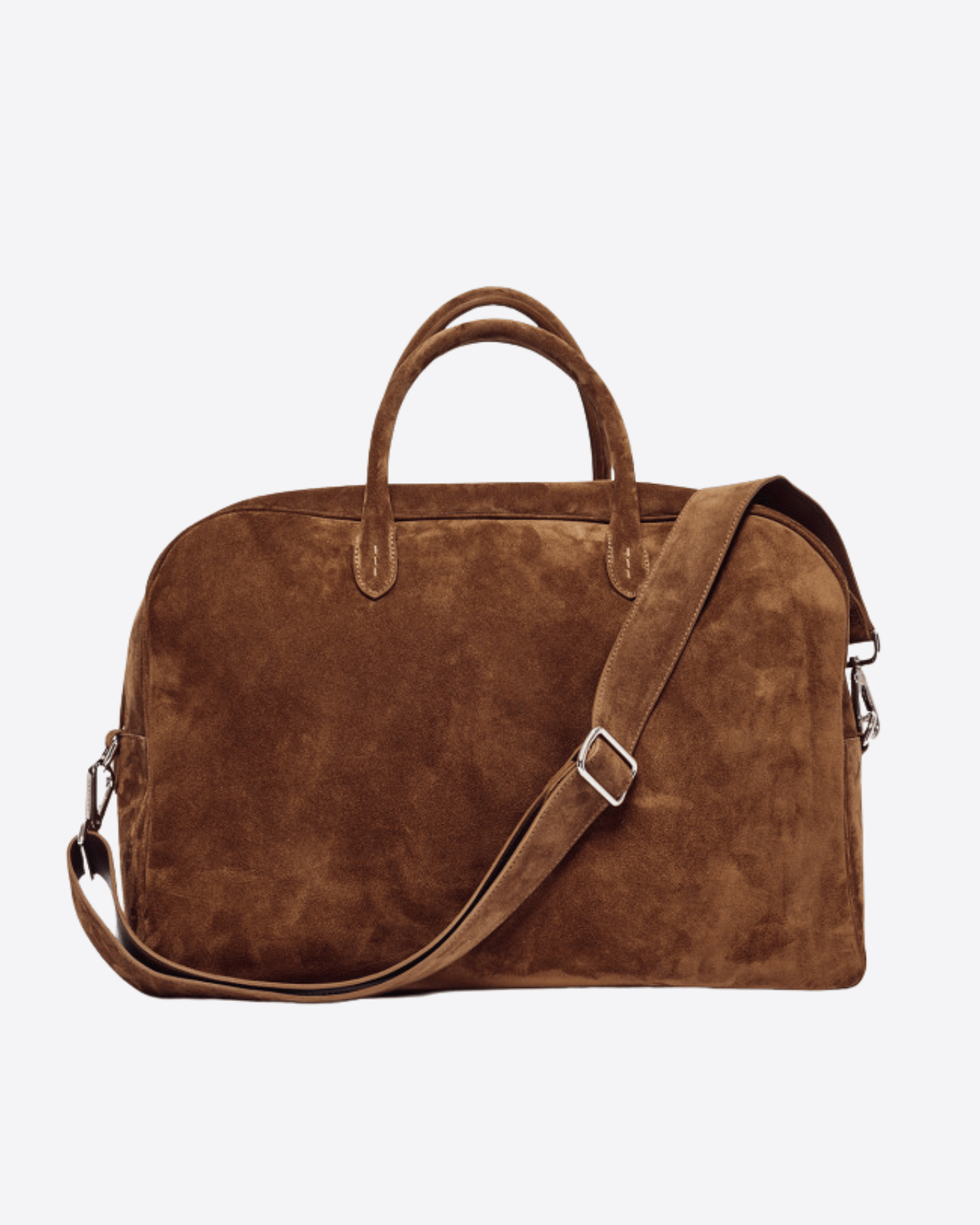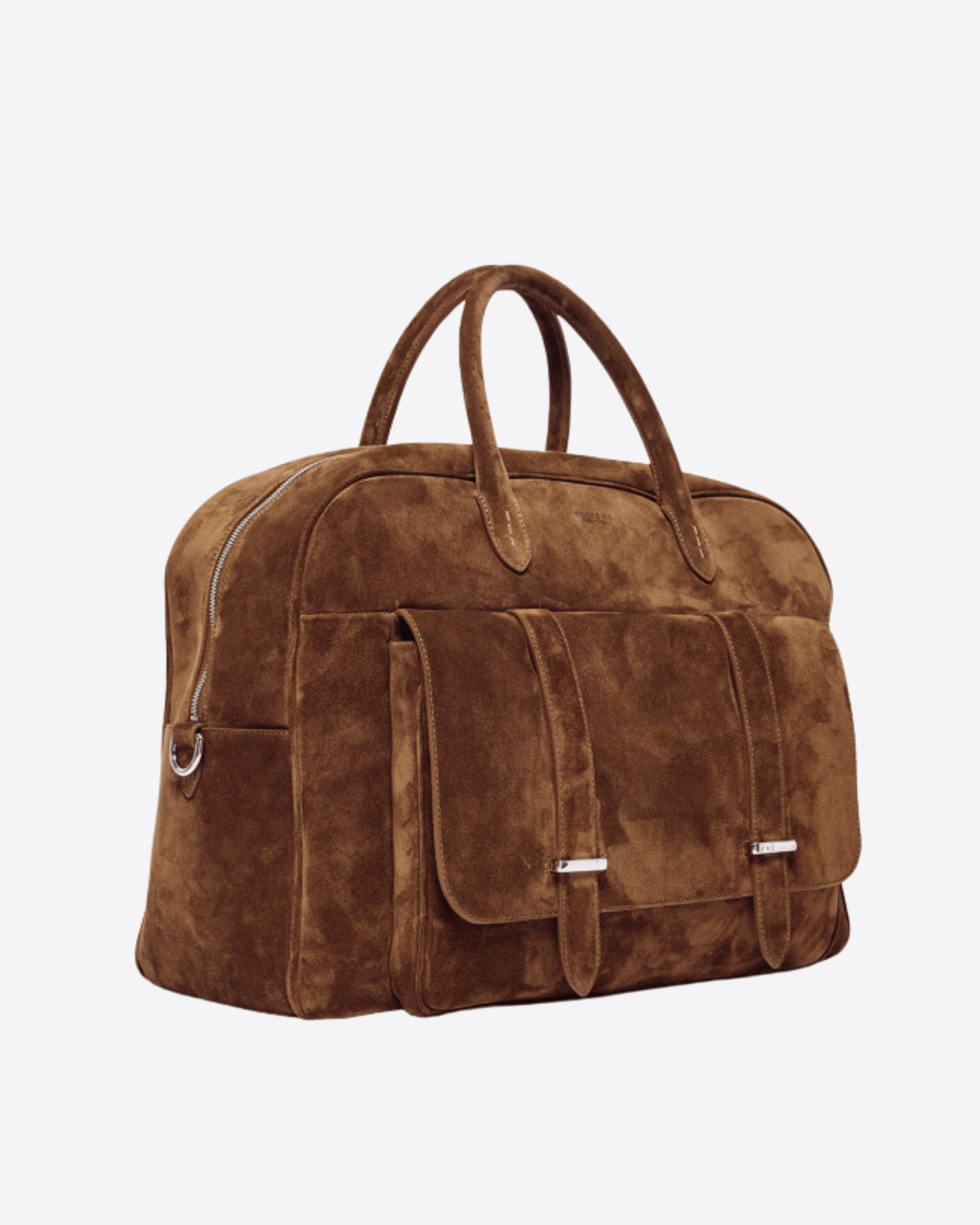 Borsone dal design funzionale e ricercato, realizzata in suede con dettagli in pelle di vitello liscia tono su tono e metallerie con finitura palladio. L’interno è organizzato con quattro taschini, di cui uno con chiusura a zip, per una gestione pratica degli oggetti personali. All’esterno è presente una tasca con patta e passanti, ideale per avere tutto a portata di mano. La chiusura principale è con zip. Dotata di doppio manico per portabilità a mano e di tracolla regolabile e removibile, si adatta con versatilità a diverse esigenze d’uso. Dimensioni: larghezza 45 cm, altezza 33 cm, profondità 17 cm.