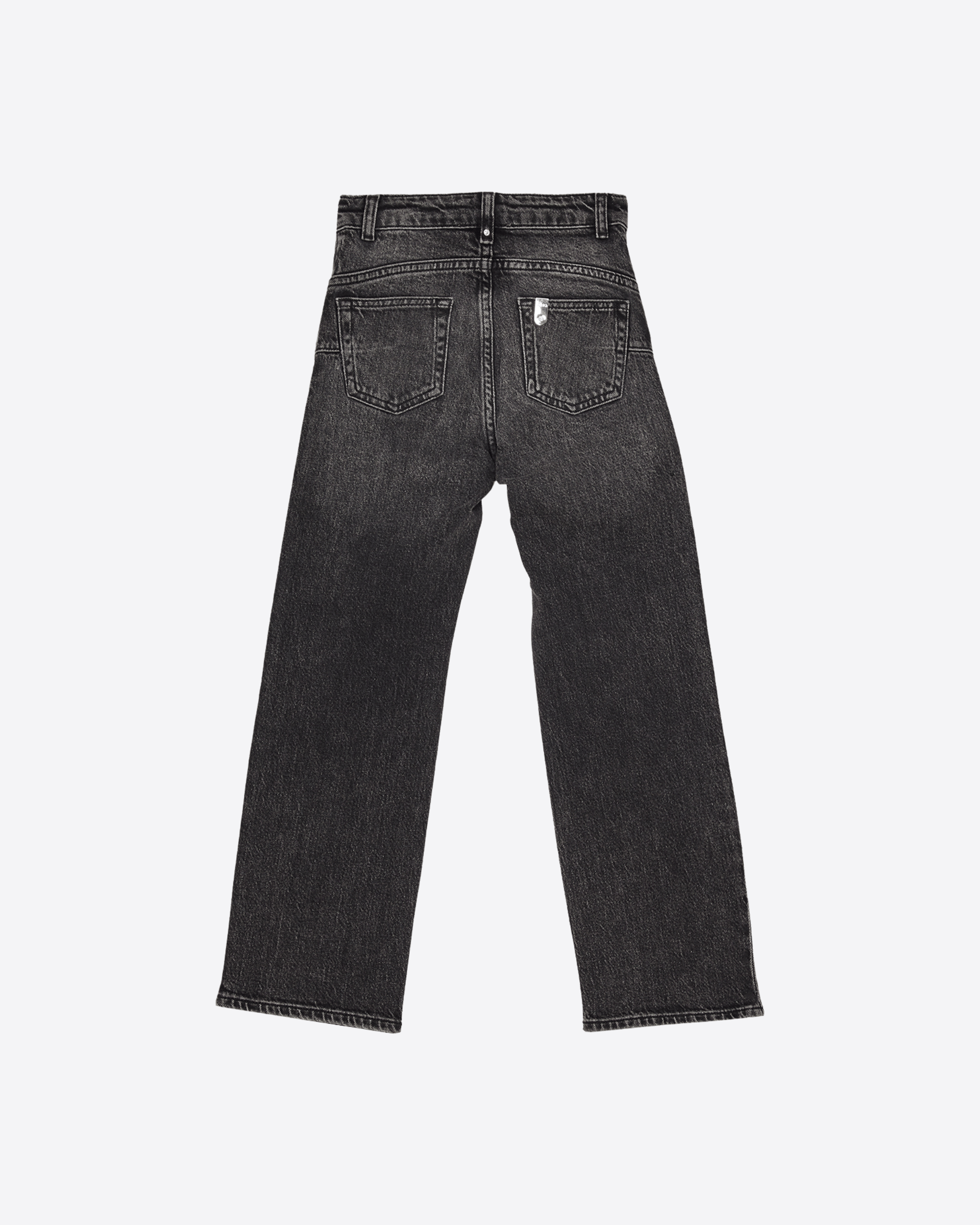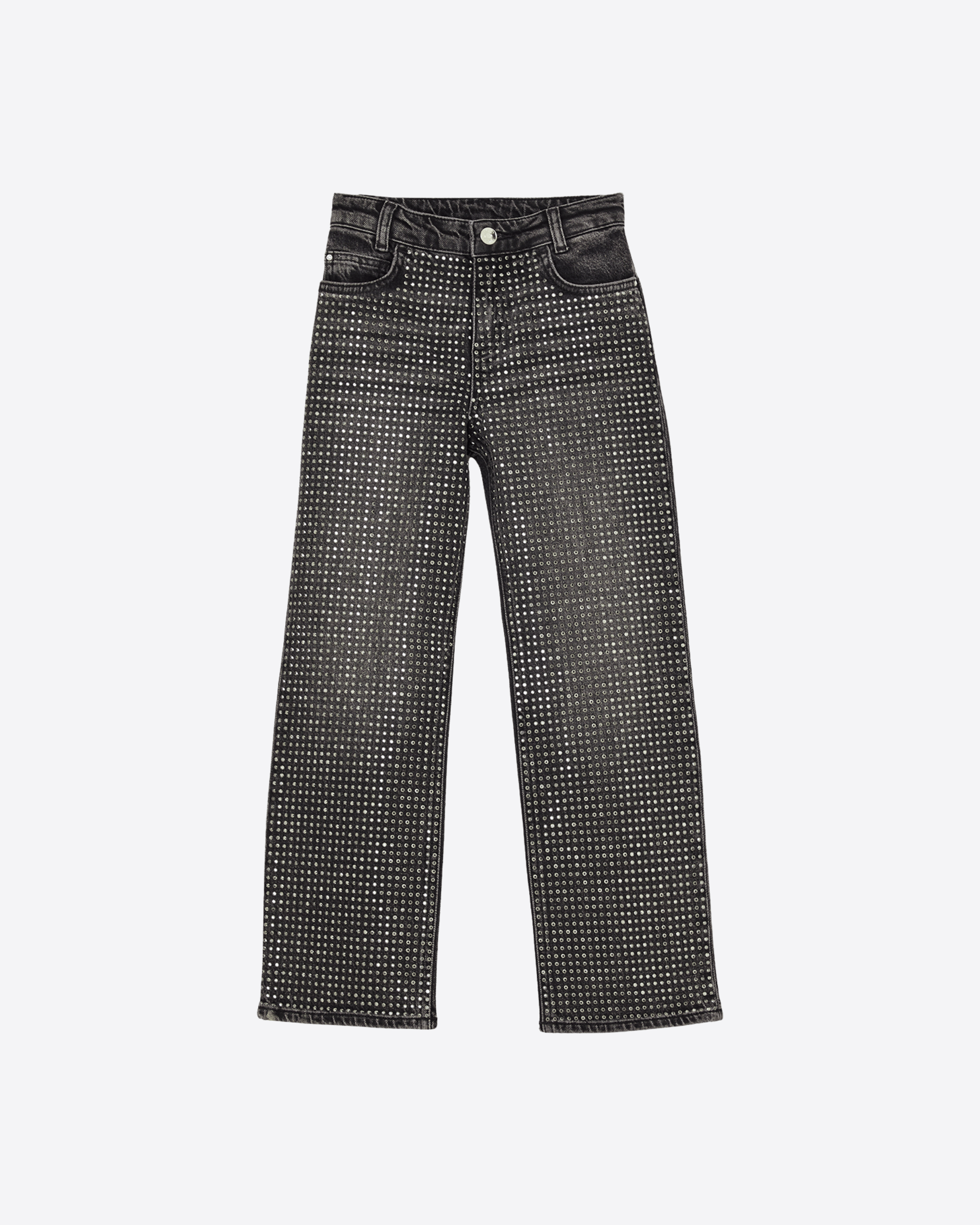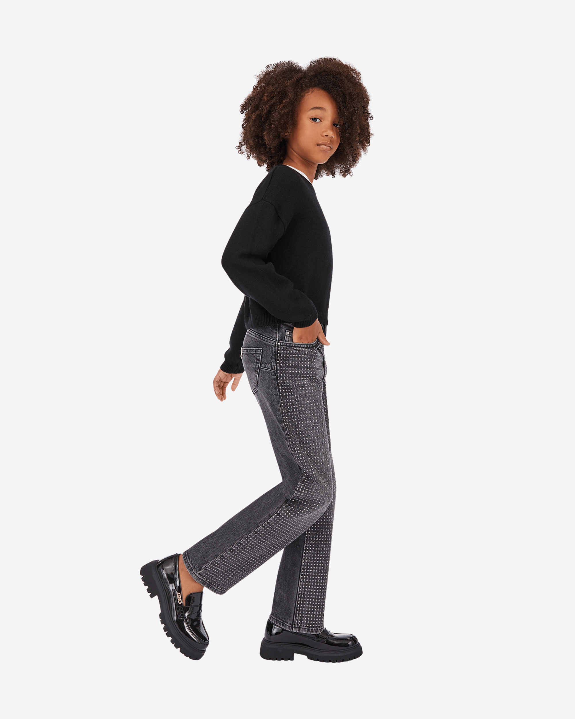 Jeans Liu Jo Bambina in denim di cotone stretch con lavaggio used e strass applicati. Modello a vita alta e gamba dritta, cinque tasche, logo in metallo sul retro e chiusura con bottone e zip coperta.
