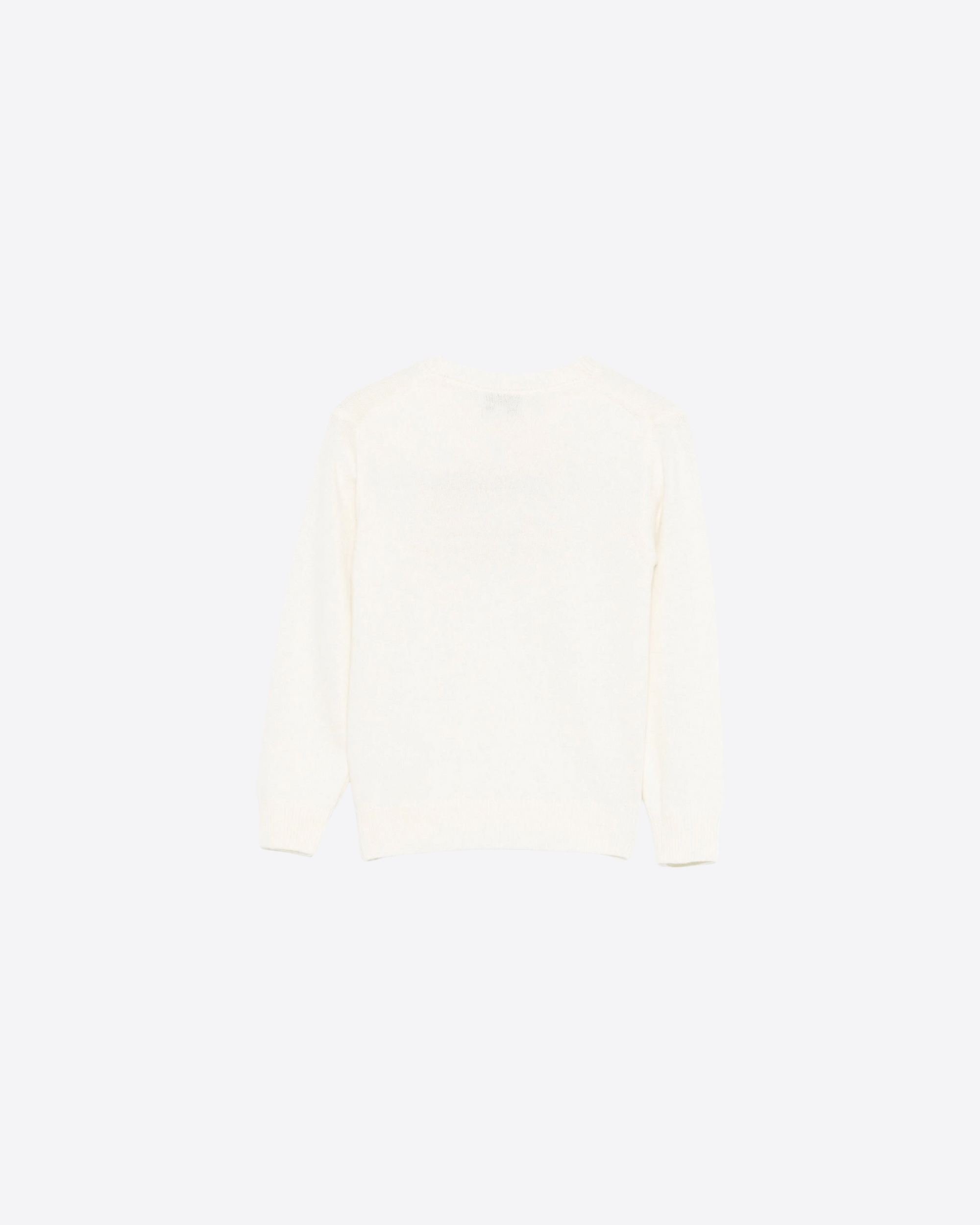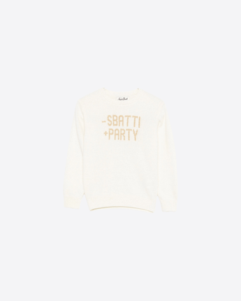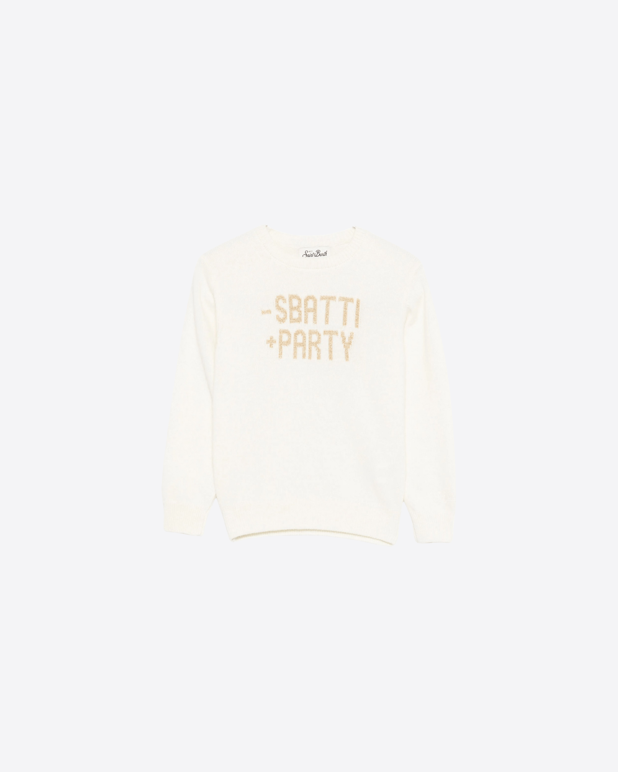 Maglia panna della collezione bimba di Saint Barth, realizzata in morbida maglia rasata con girocollo e orlo dritto. Le maniche sono lunghe e, insieme a girocollo, orlo e polsini, presentano una finitura a costine che garantisce comfort e una vestibilità ben definita. Sulla manica è applicato il logo ricamato, mentre la scritta “- sbatti, + party” in intarsio dorato dona un tocco brillante e giocoso. Un capo moderno e versatile, ideale per illuminare i look quotidiani delle più piccole.