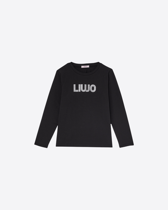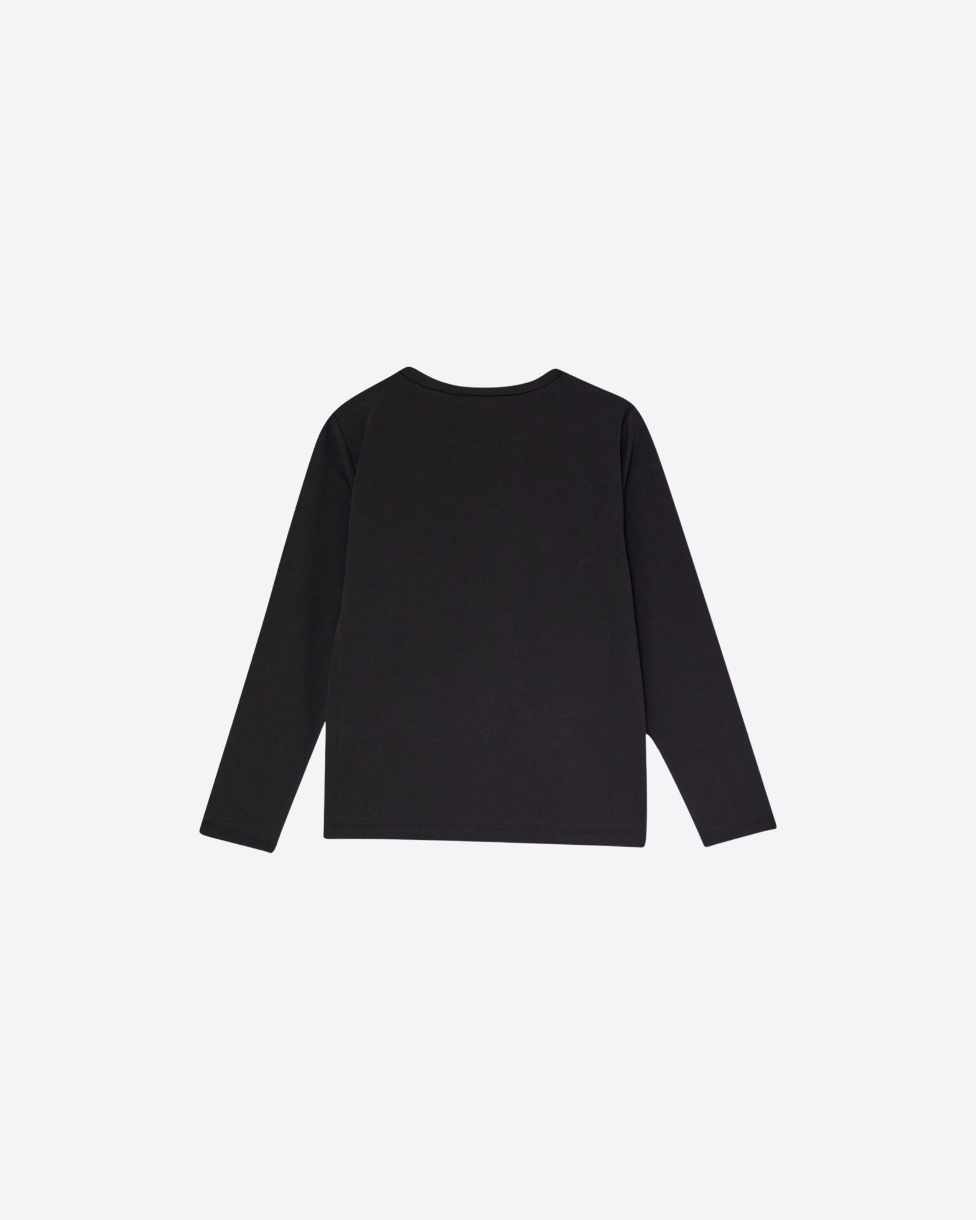 T-shirt nera realizzata in jersey di cotone stretch, morbida e confortevole a contatto con la pelle. Presenta un taglio girocollo classico e maniche lunghe, perfette per la mezza stagione o per essere indossata sotto giacche e cardigan.