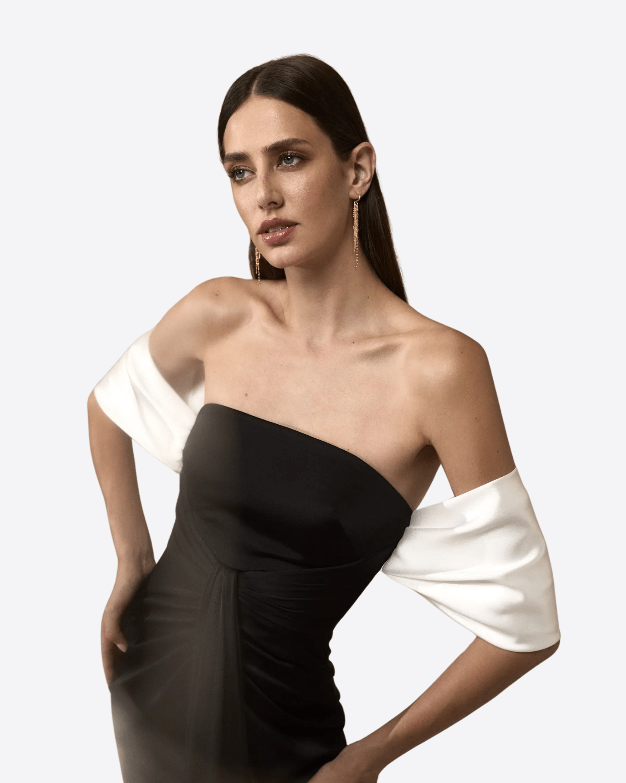 Straight evening dress with bandeau neckline in satin