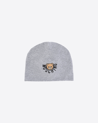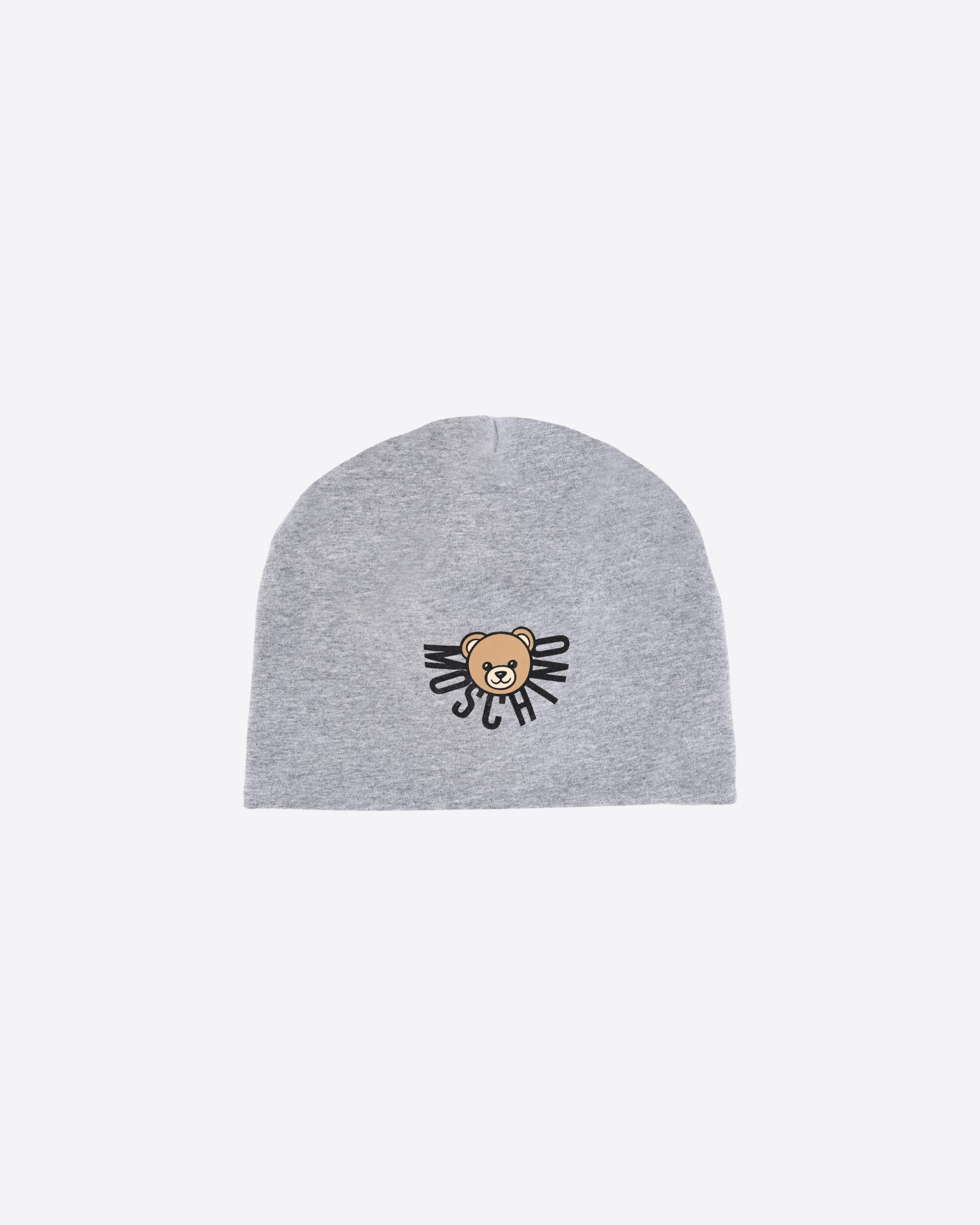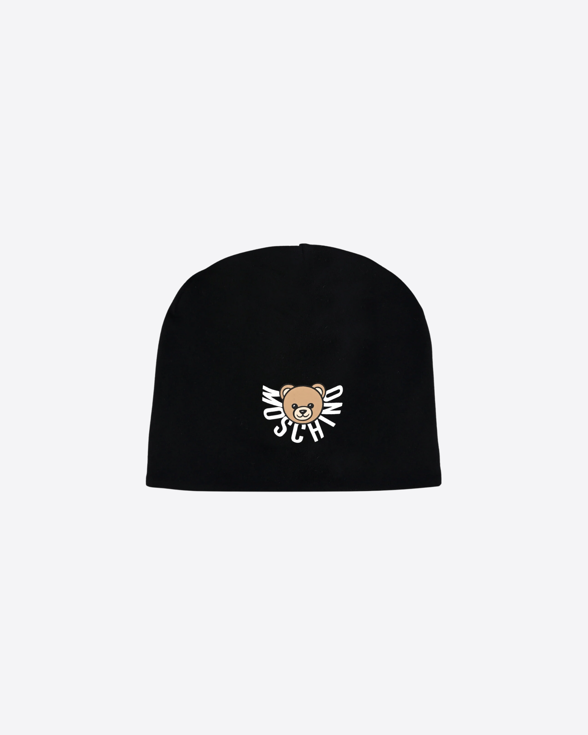 Berretto Moschino Kids, realizzato in misto cotone; é decorato con Teddy Bear e logo circolare.