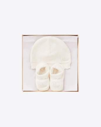 Set regalo Chloé per neonata composto da berretto e stivaletti coordinati. Realizzato con materiali morbidi e delicati sulla pelle, è perfetto per tenere al caldo la bambina con stile. Fornito in un’elegante confezione regalo Chloé con carta, ideale per un dono speciale.