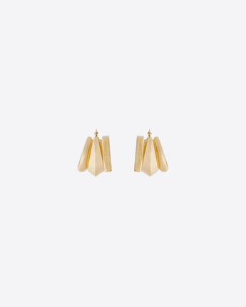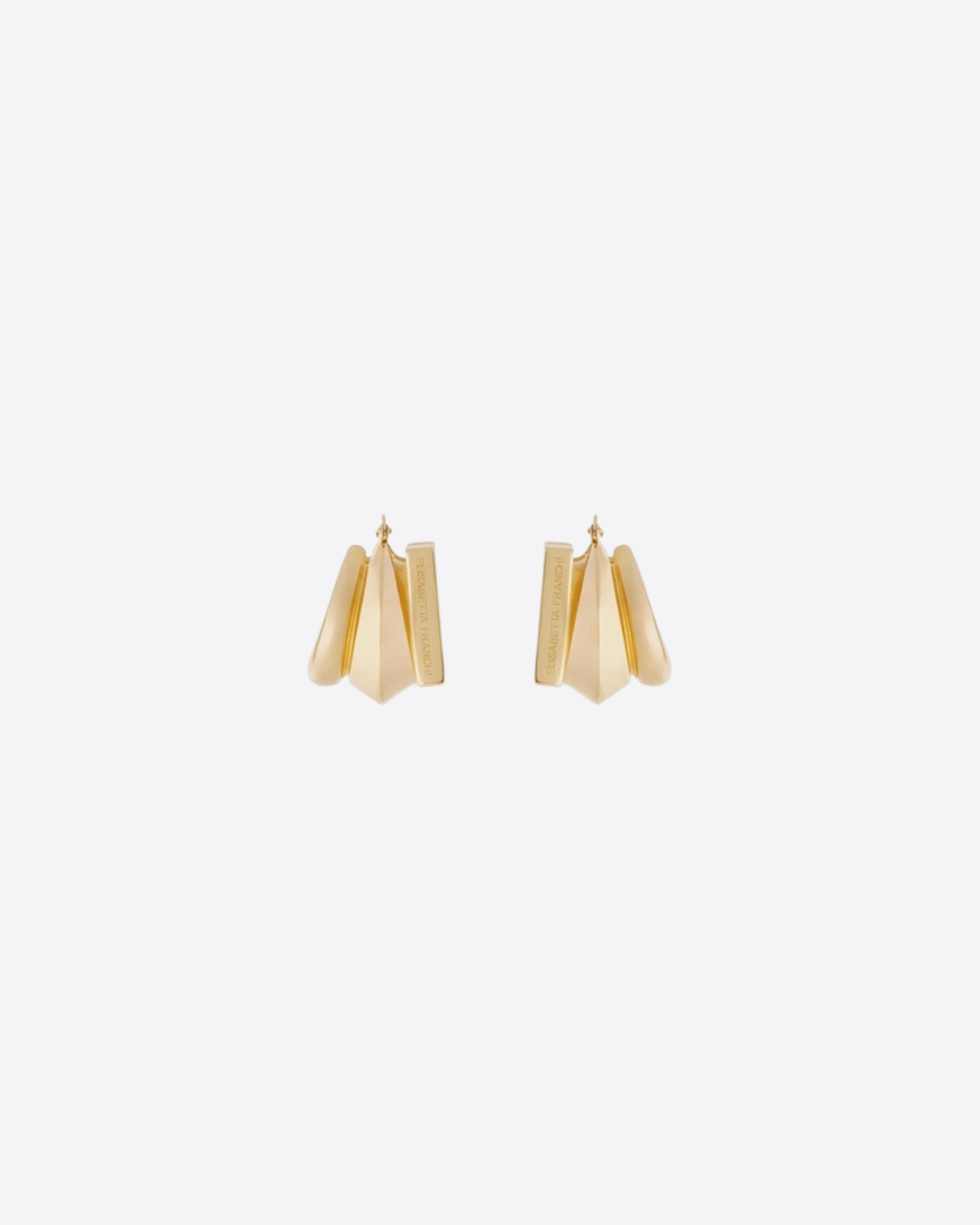 Orecchini realizzati in metallo con finitura dorata, caratterizzati da un design avvolgente. Il modello è composto da elementi geometrici e arricchito da logo inciso. La chiusura a baionetta assicura praticità e una vestibilità stabile.