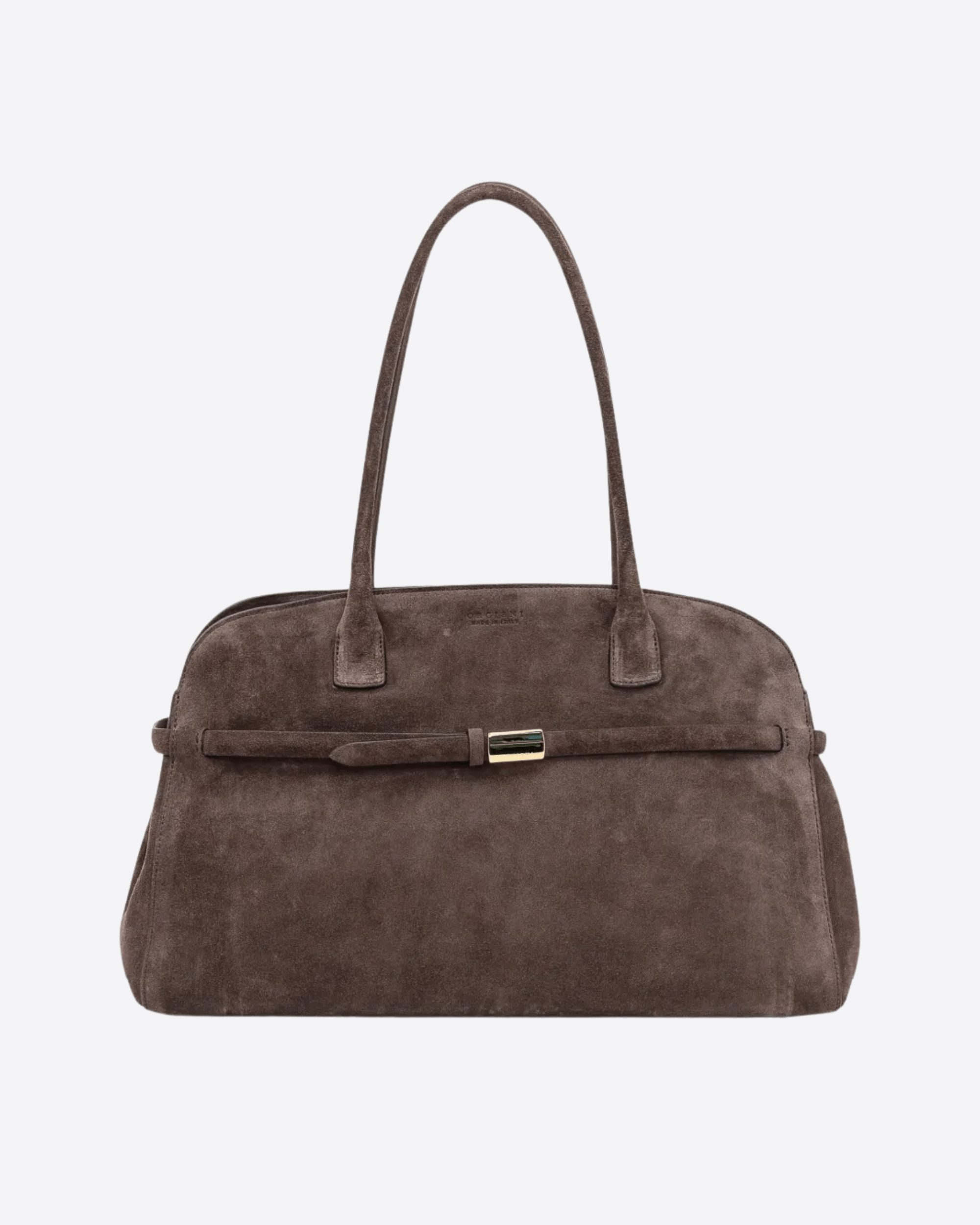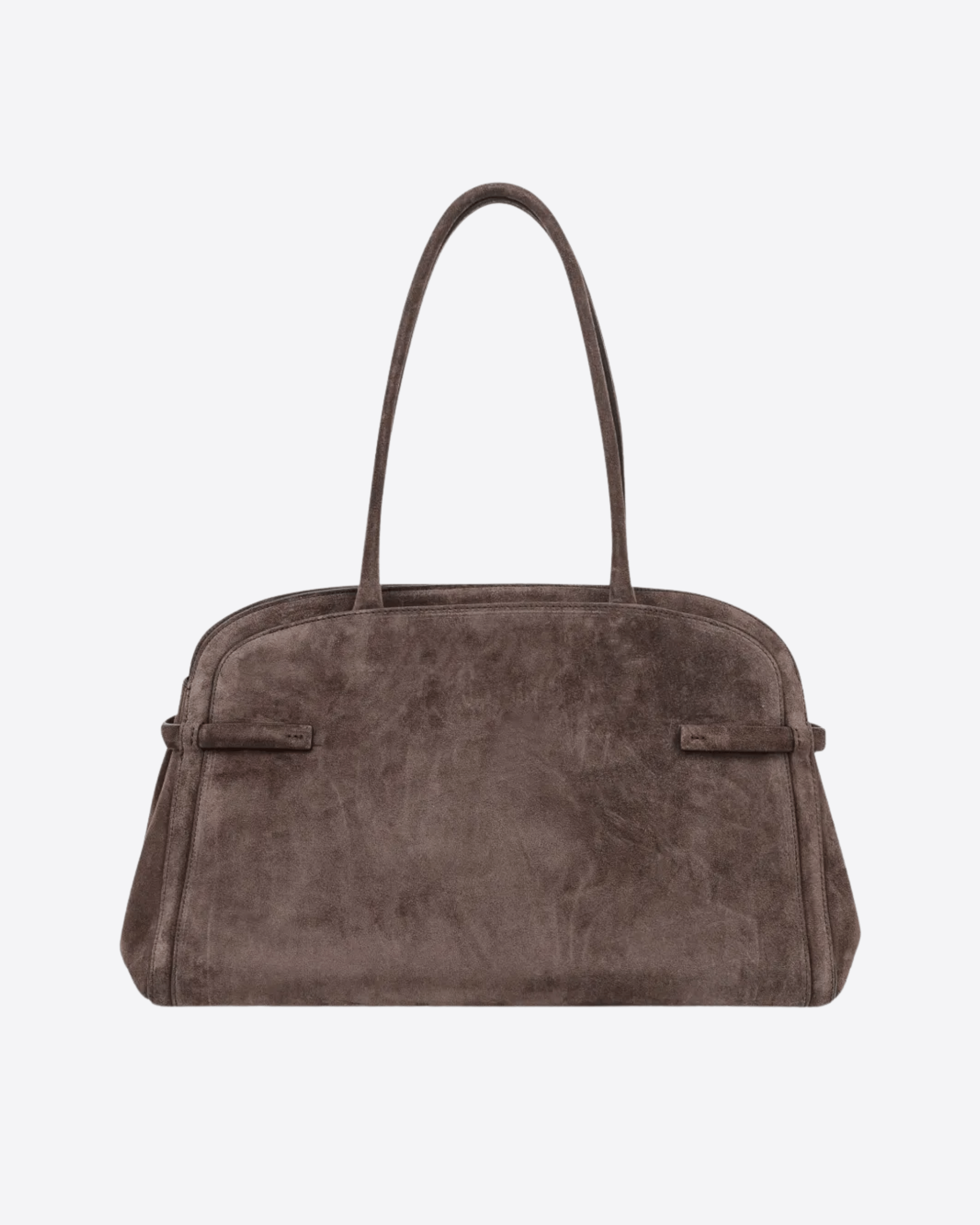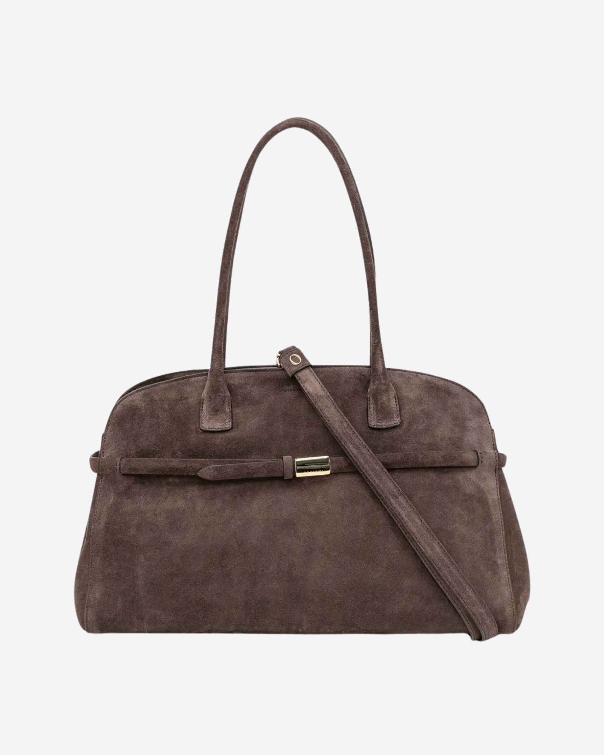 Borsa Aura Peach Large a spalla in suede testa di moro, caratterizzata da una tasca esterna e tre interne, di cui una con zip. La borsa presenta, inoltre, chiusura con bottoni magnetici ed è caratterizzata dalla funzionalità a spalla, grazie ai manici, e a tracolla, grazie a questa che è aggiuntiva e regolabile. Infine, l'accessorio è completato da dettagli metallerie con finitura oro lucido.