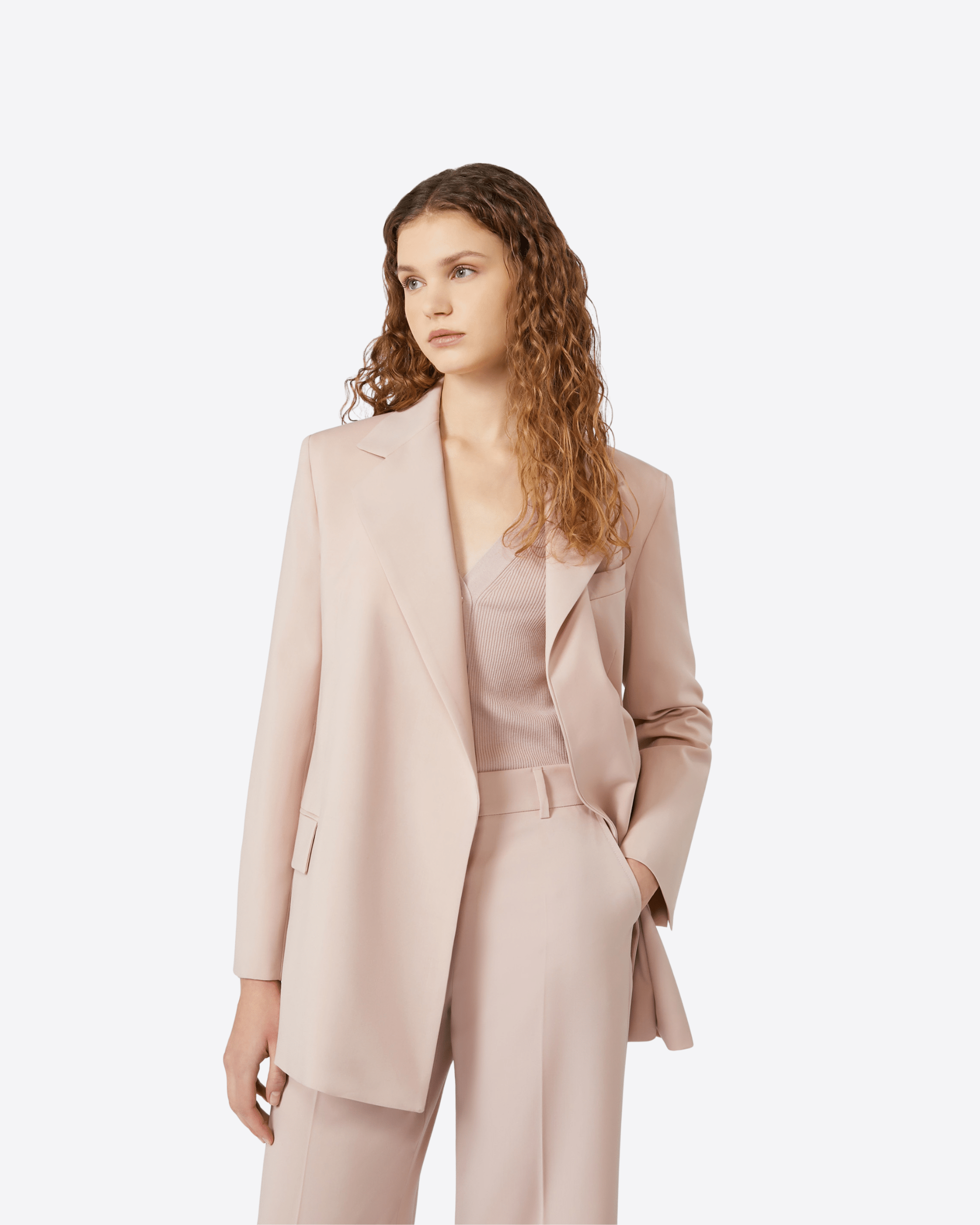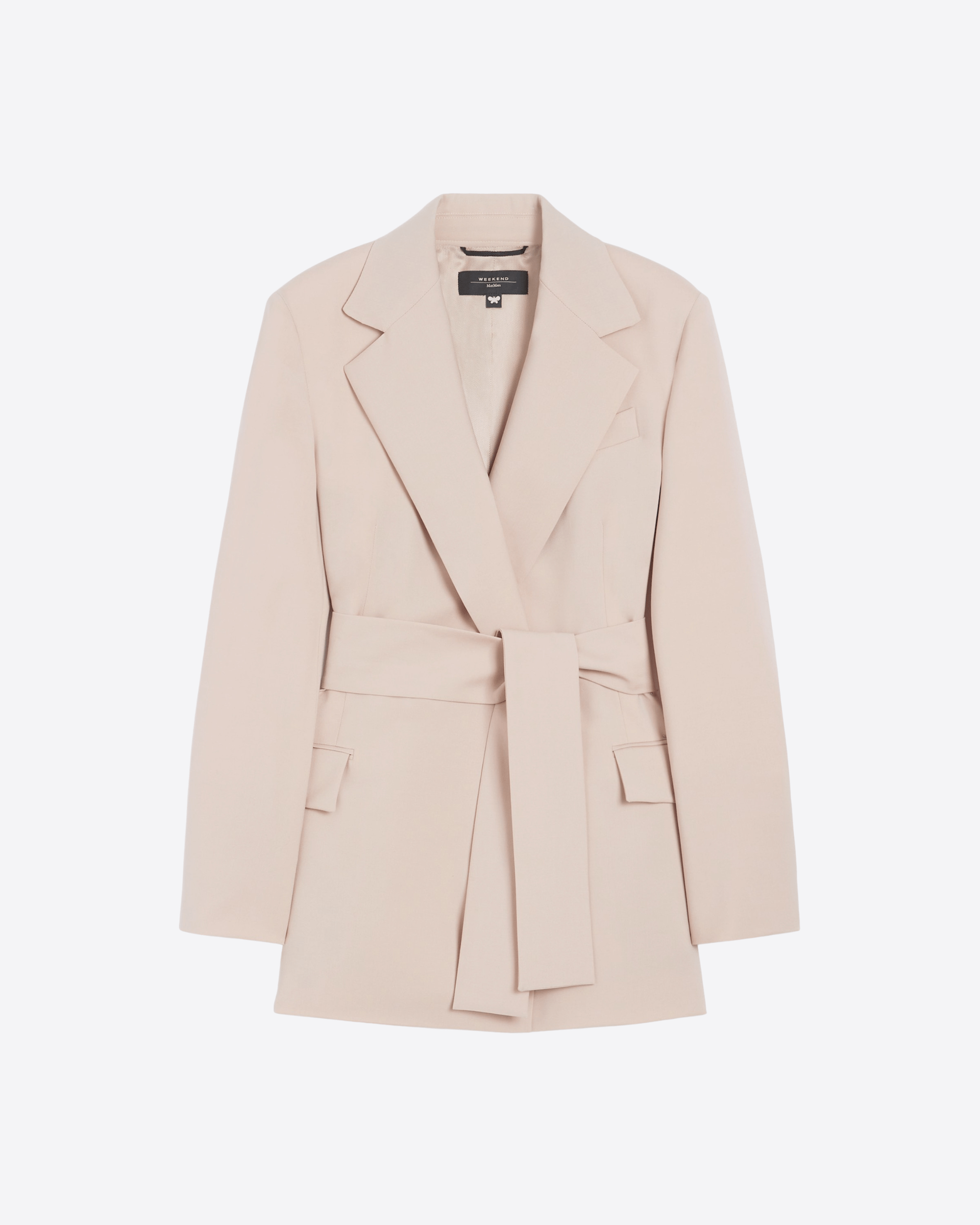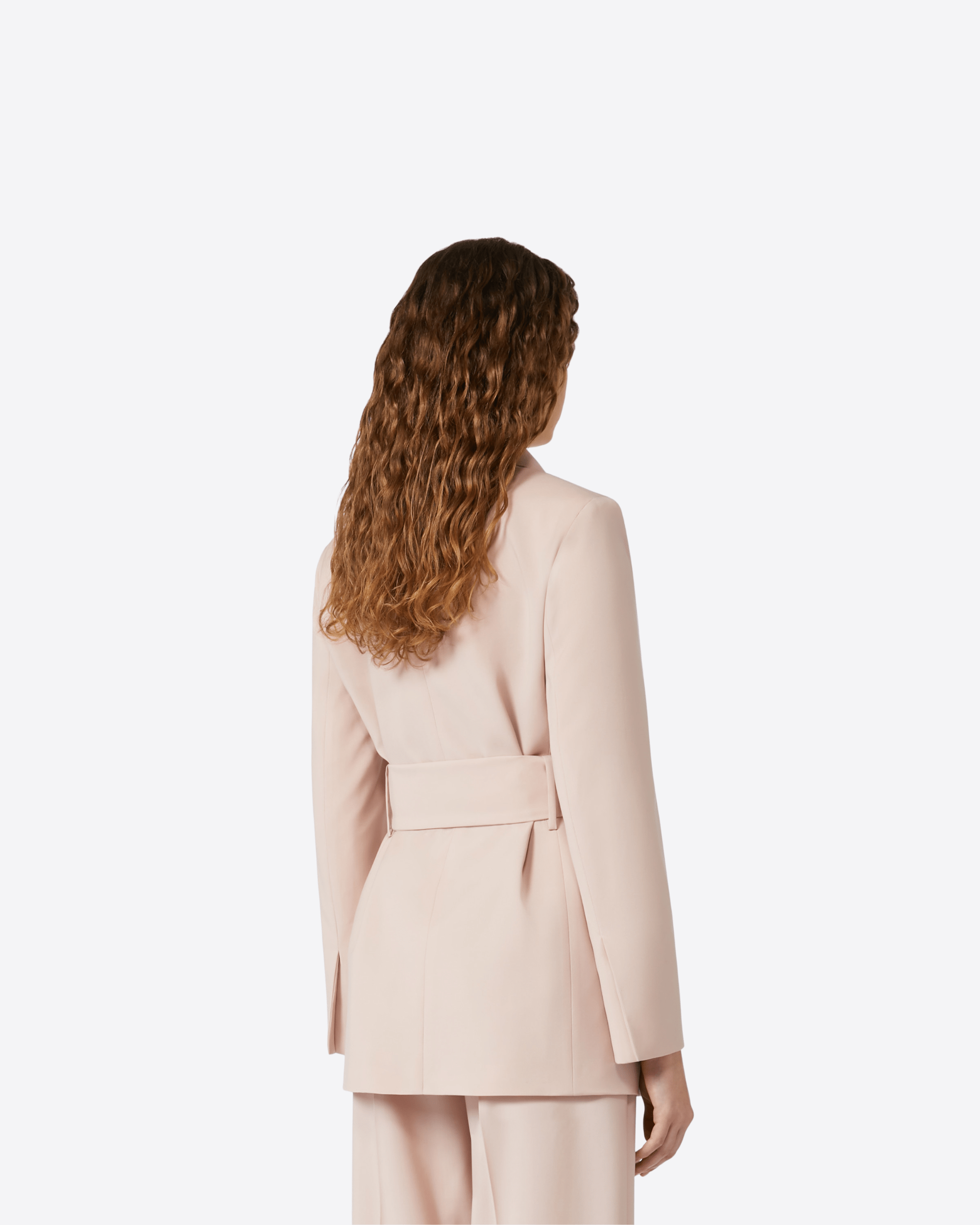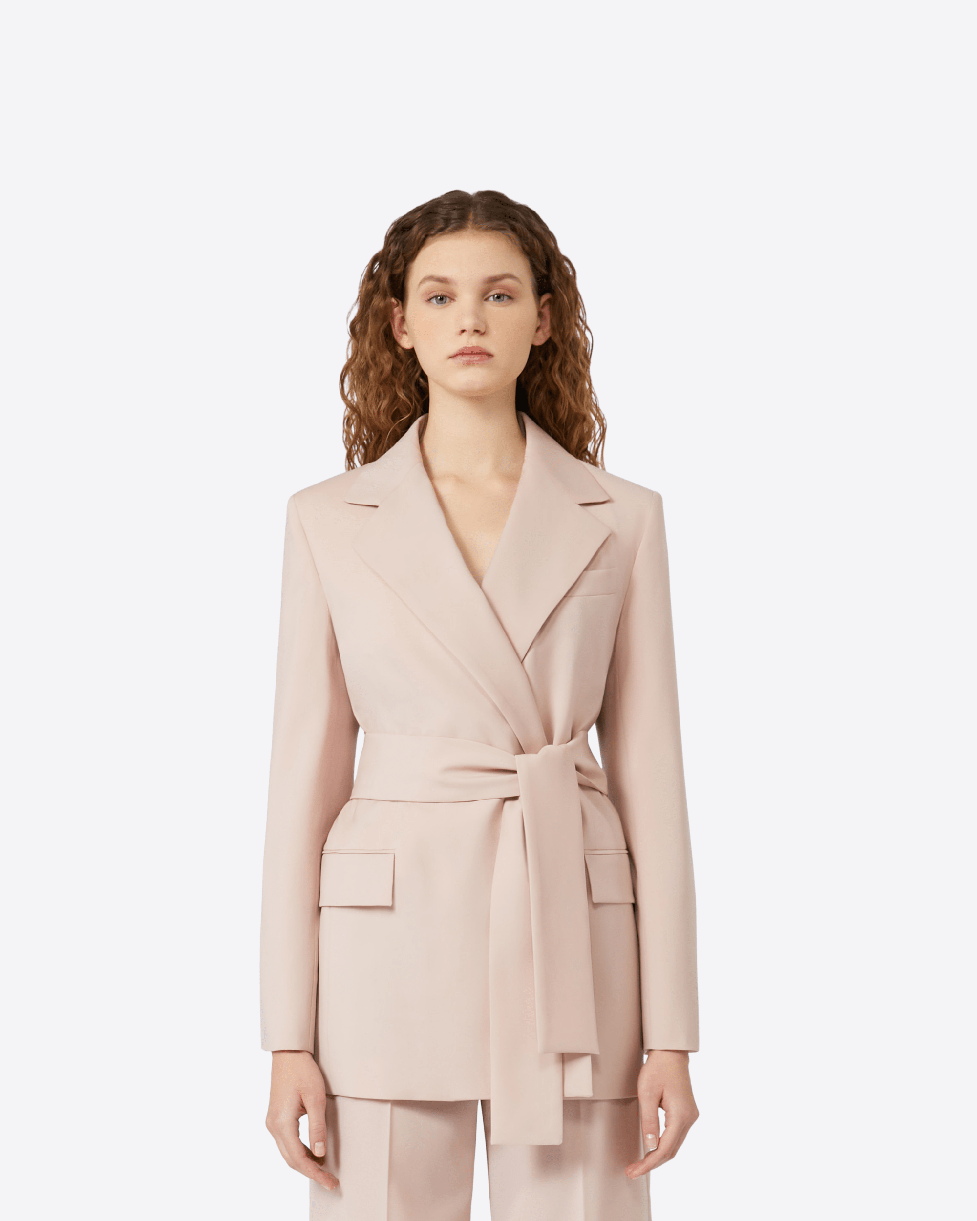 Giacca dalla linea dritta con cintura da annodare in vita per evidenziare la silhouette.