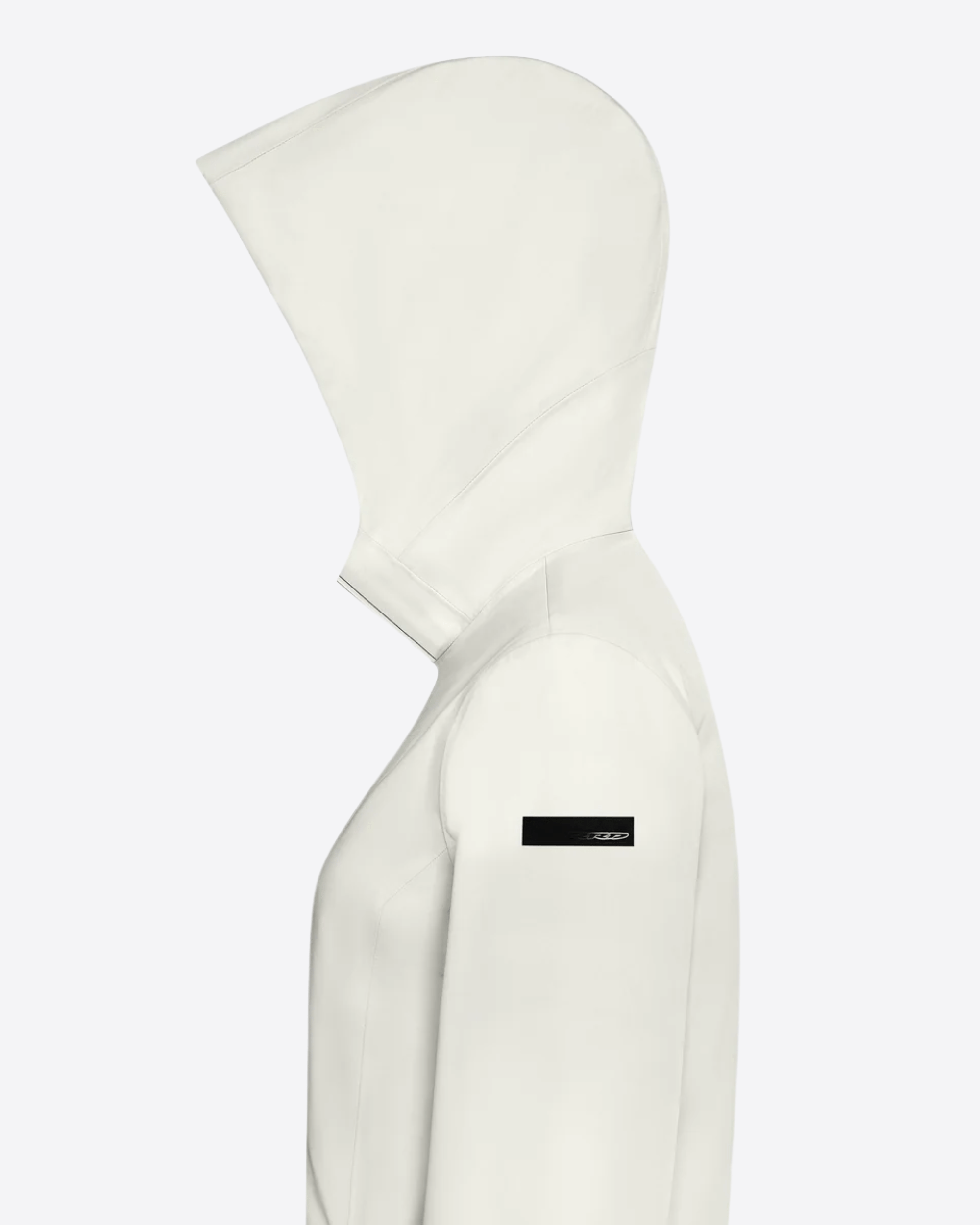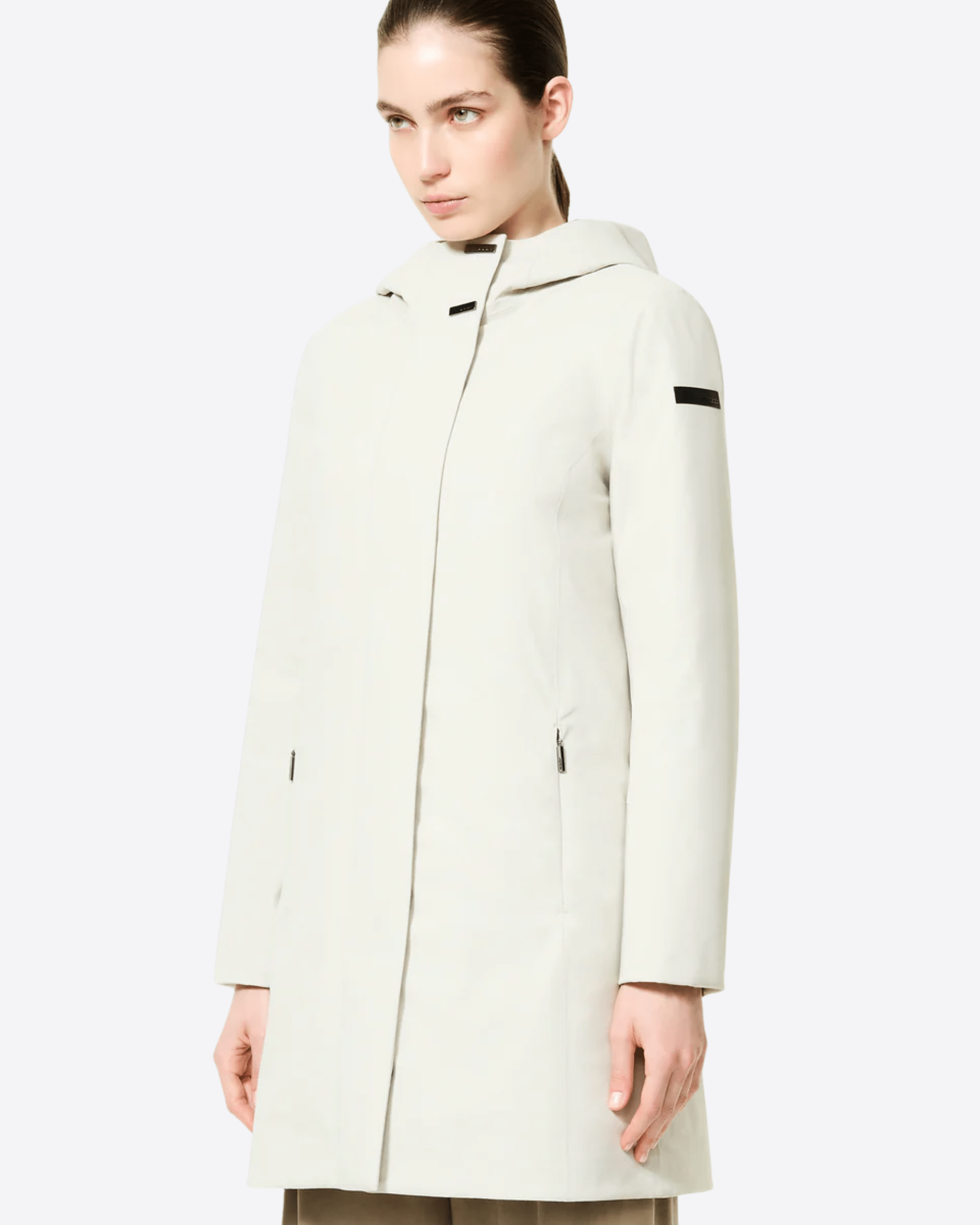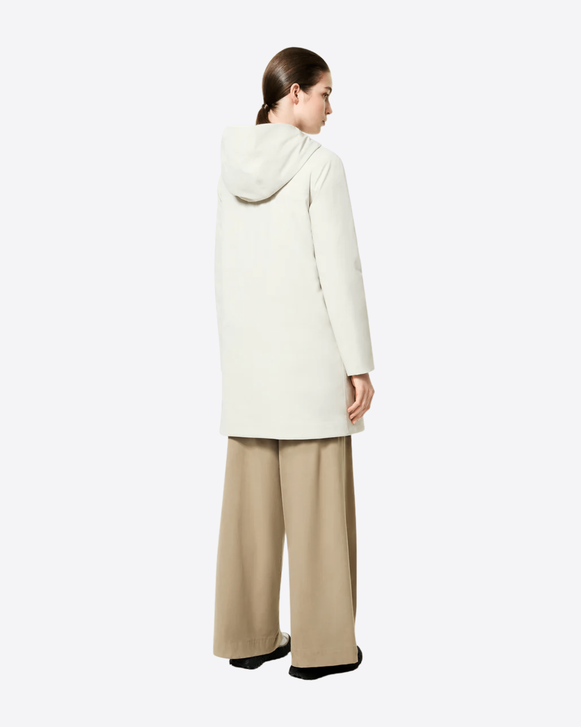 La giacca invernale di lunghezza media si caratterizza per il design funzionale e minimalista, che la rende unica per praticità, isolamento e protezione dal freddo e dalla pioggia. Realizzata in tessuto a membrana impermeabile e traspirante, presenta l'esterno in esclusivo Montecristo dal look opaco e liscio al tatto. L'innovativo sistema floating shield offre un abbraccio di calore dal fit impeccabile, grazie ai canali tubici che contengono l'imbottitura in piuma d'anatra. Il cappuccio, anch'esso imbottito, presenta un design essenziale e raffinato che incornicia delicatamente il viso. Sul davanti, la chiusura a zip è nascosta dalla patta impreziosita dai bottoni a barretta gun metal, che donano un tocco di eleganza contemporanea. Per la sua versatilità, la giacca è ideale nell'aggiungere un twist glam nella creazione di look decisi e distintivi, in abbinamento alla camicia dal taglio maschile e al morbido pantalone palazzo