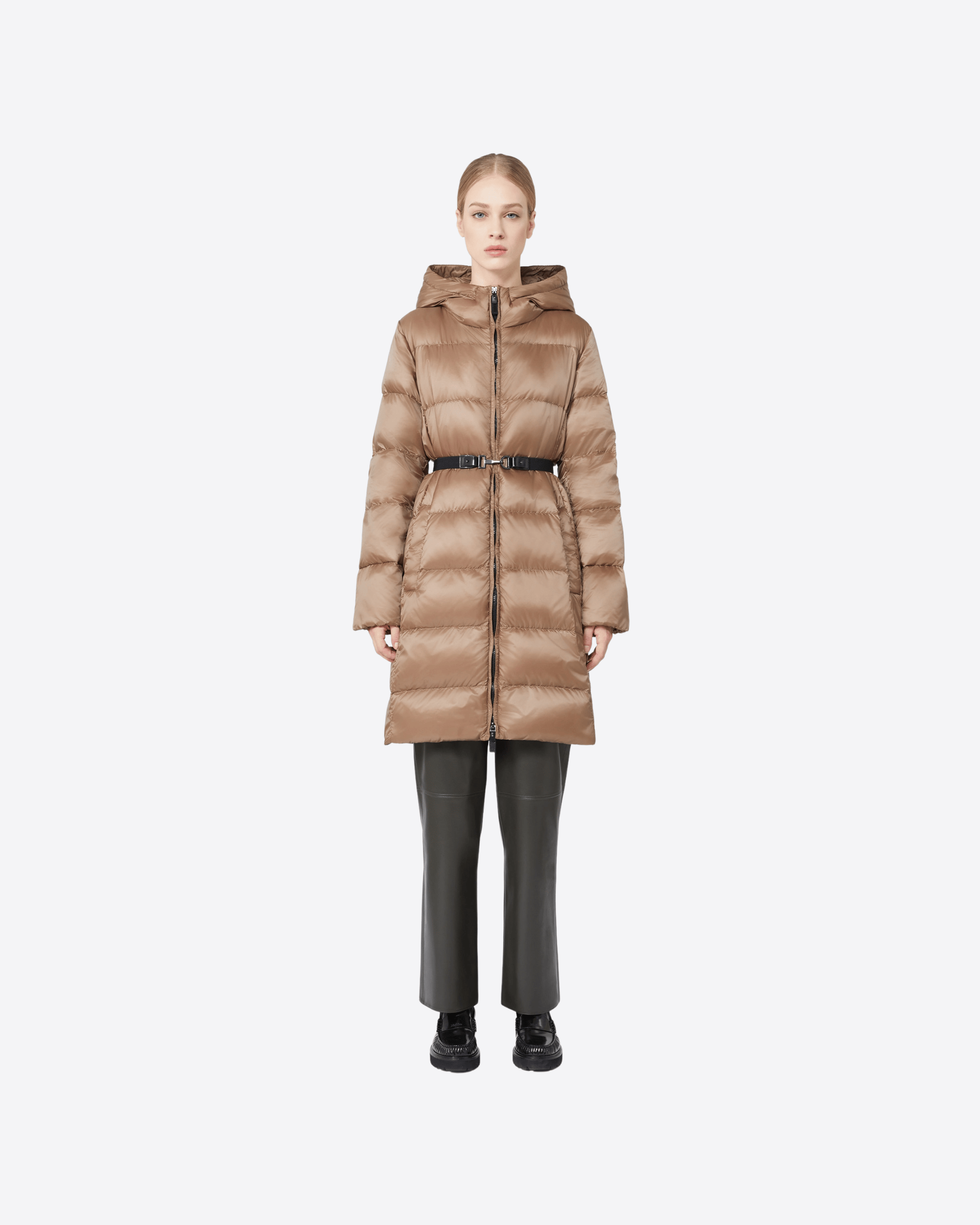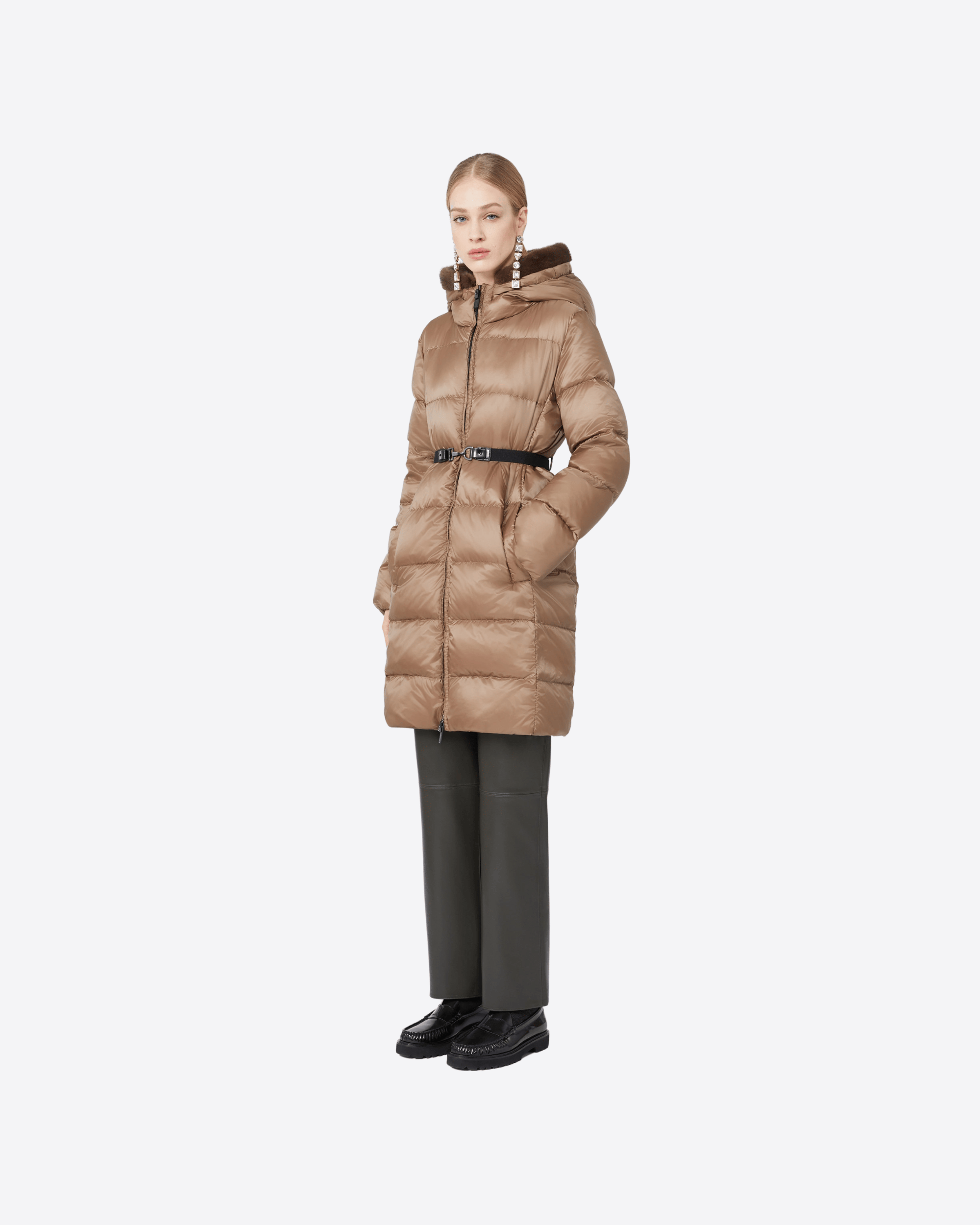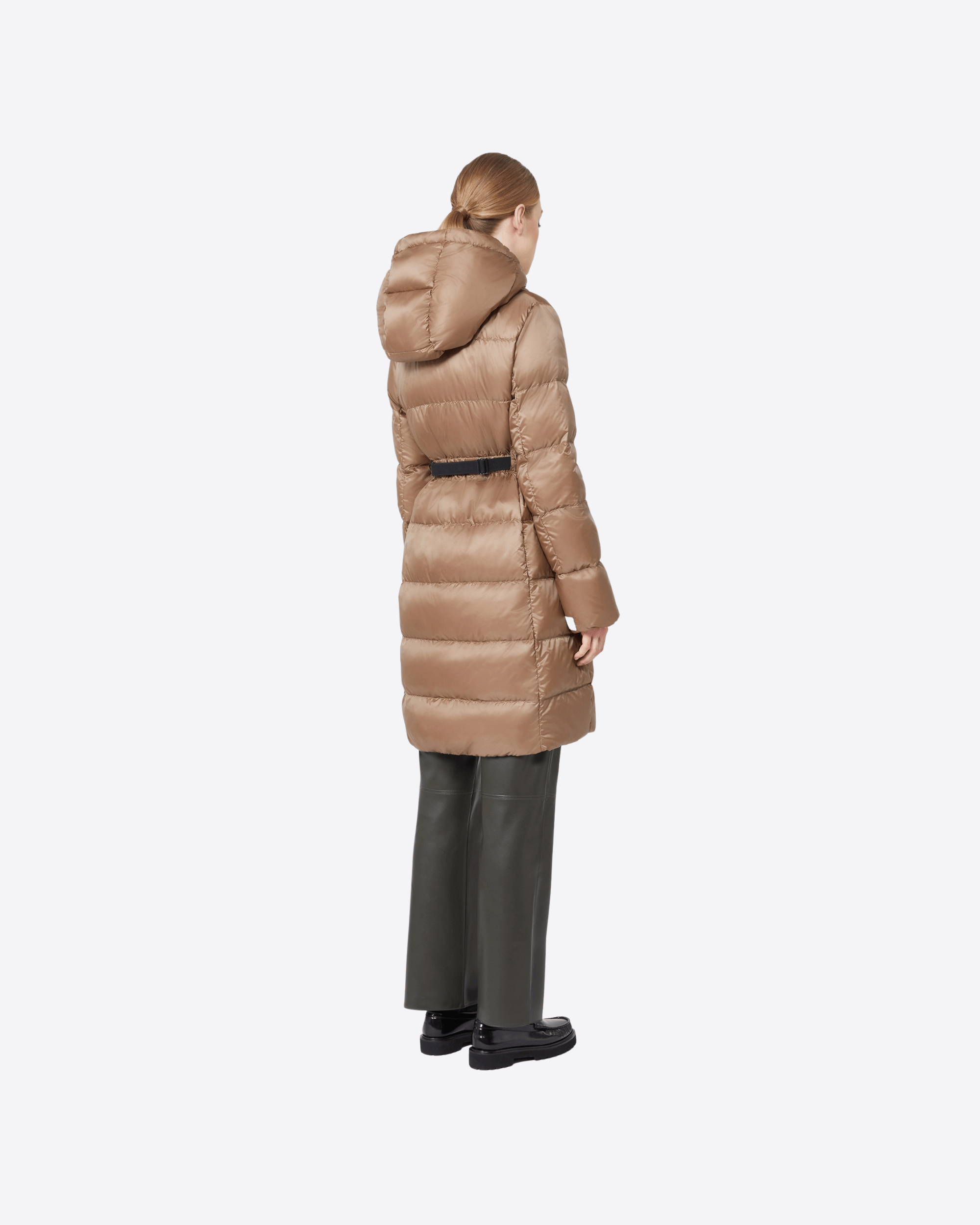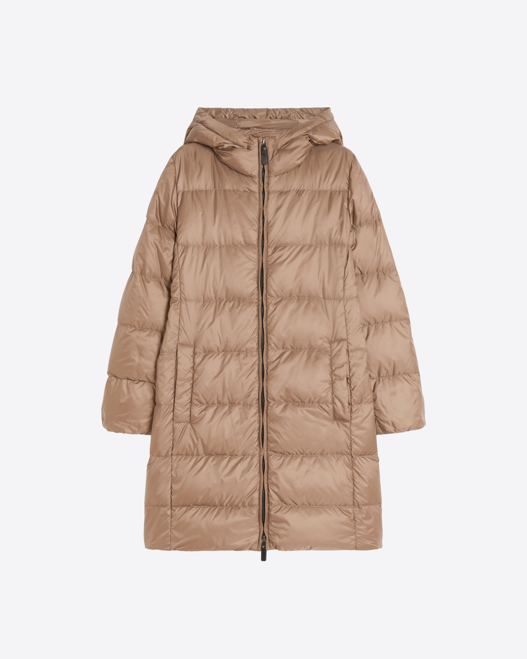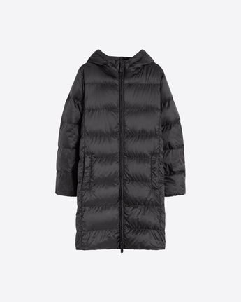 Piumino midi caratterizzato da una silhouette dritta con vita elasticizzata sul retro.