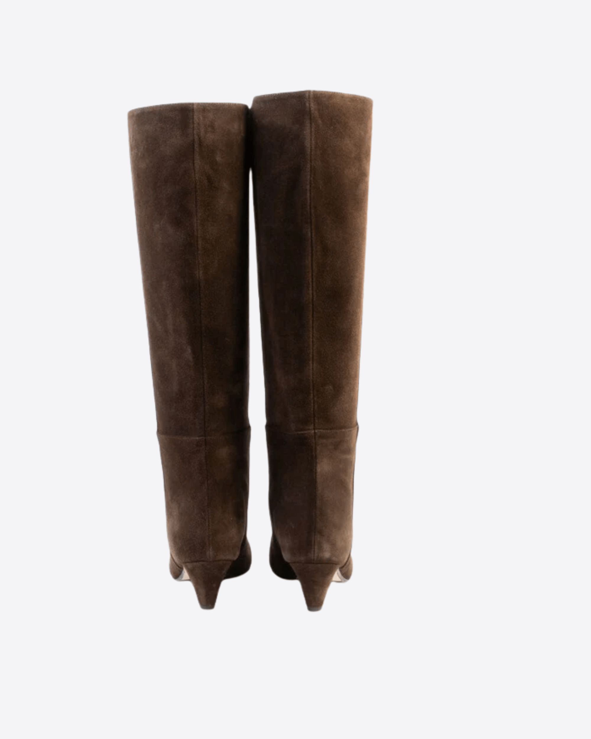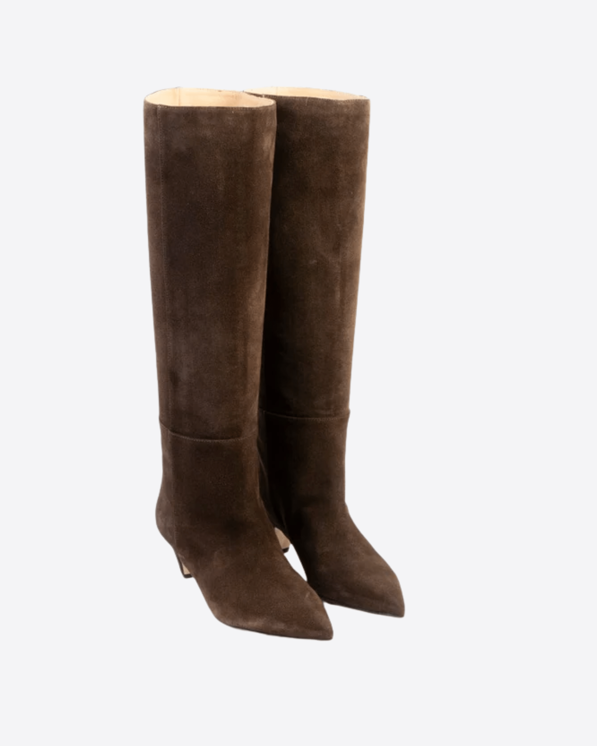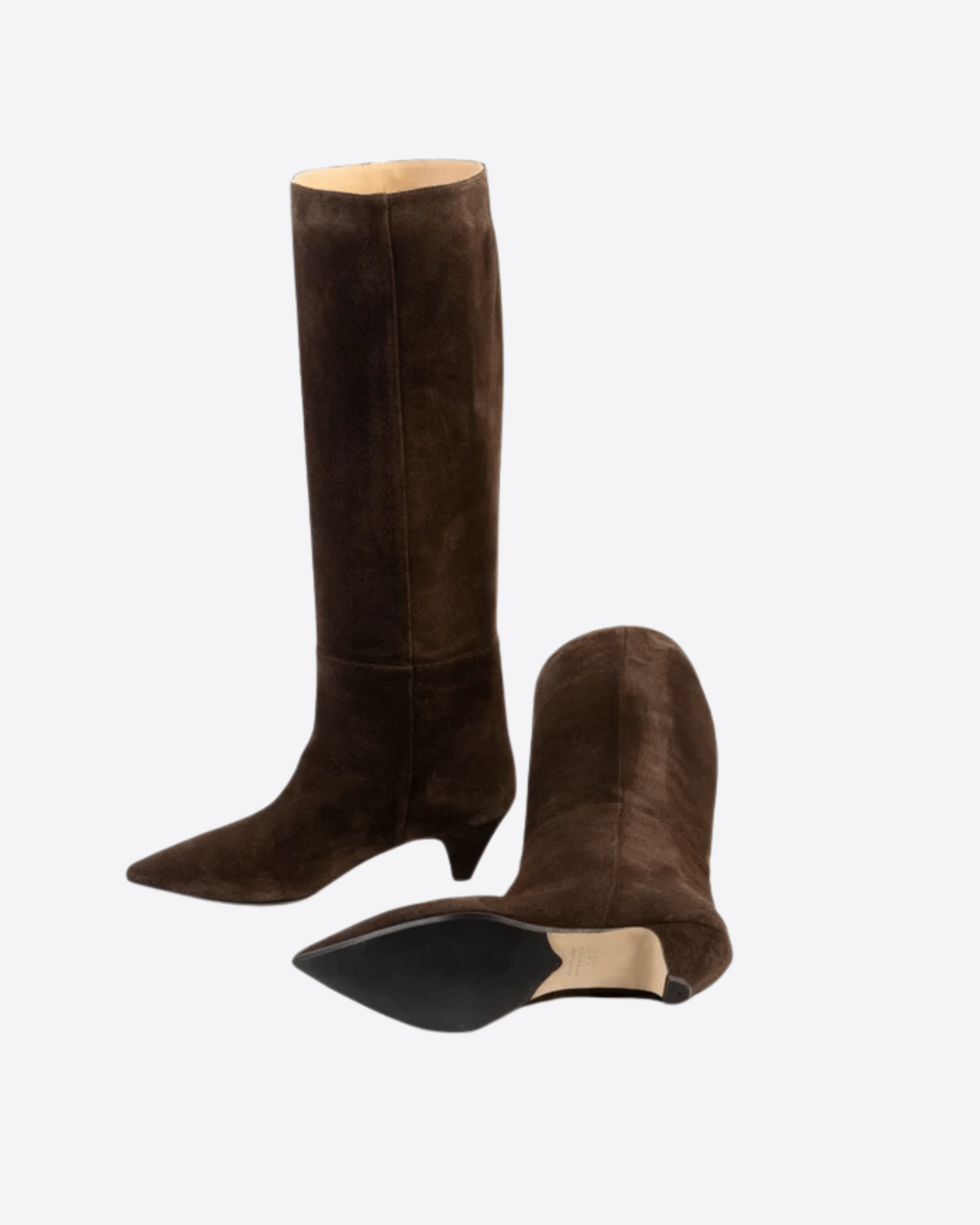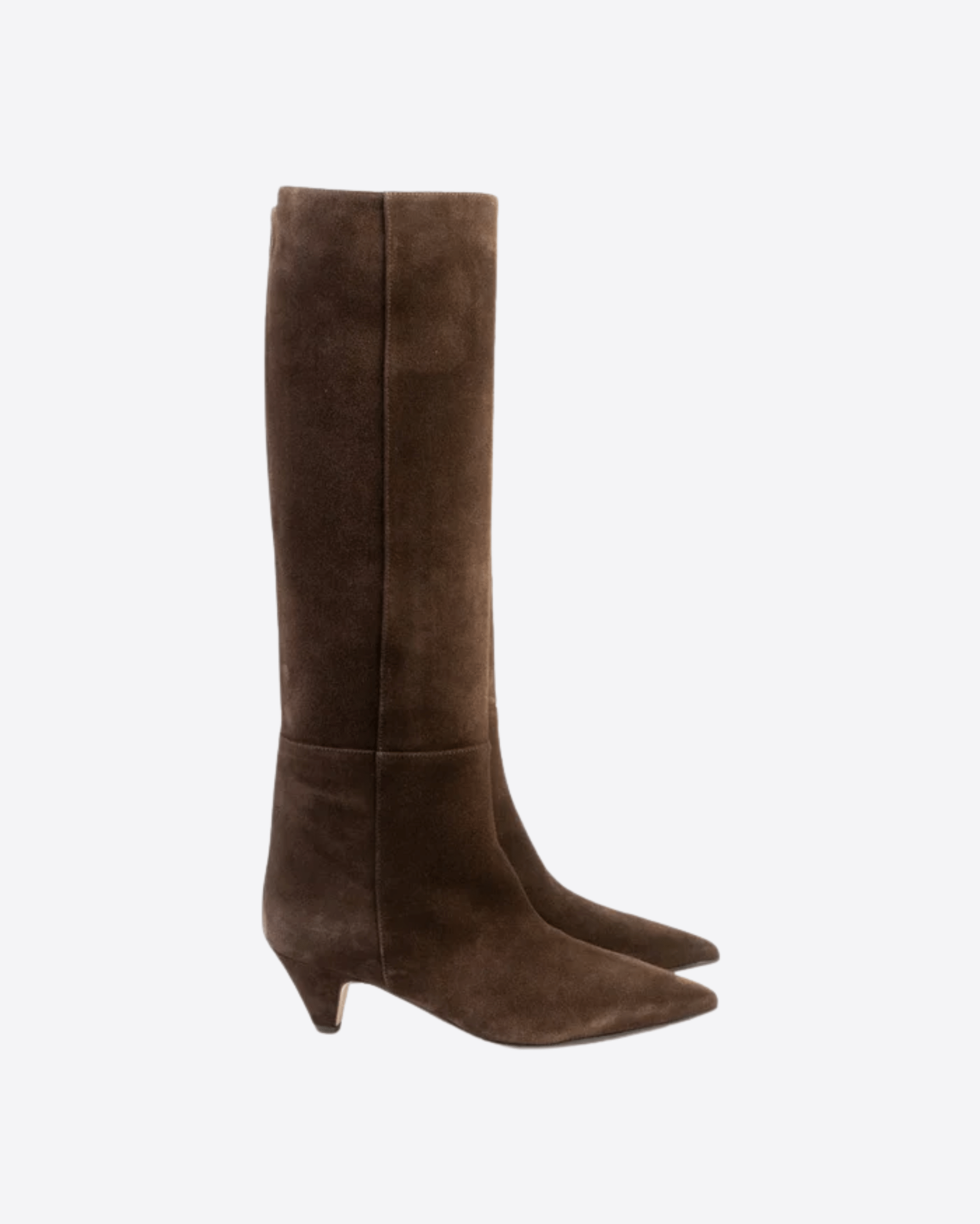 Stivale a punta di Anna F, realizzato in camoscio di colore testa di moro. Tacco a cono rivestito di 5.5 centimetri. Gambale a tubo. Soletta interna in pelle. Suola in cuoio con inserti in gomma antiscivolo.