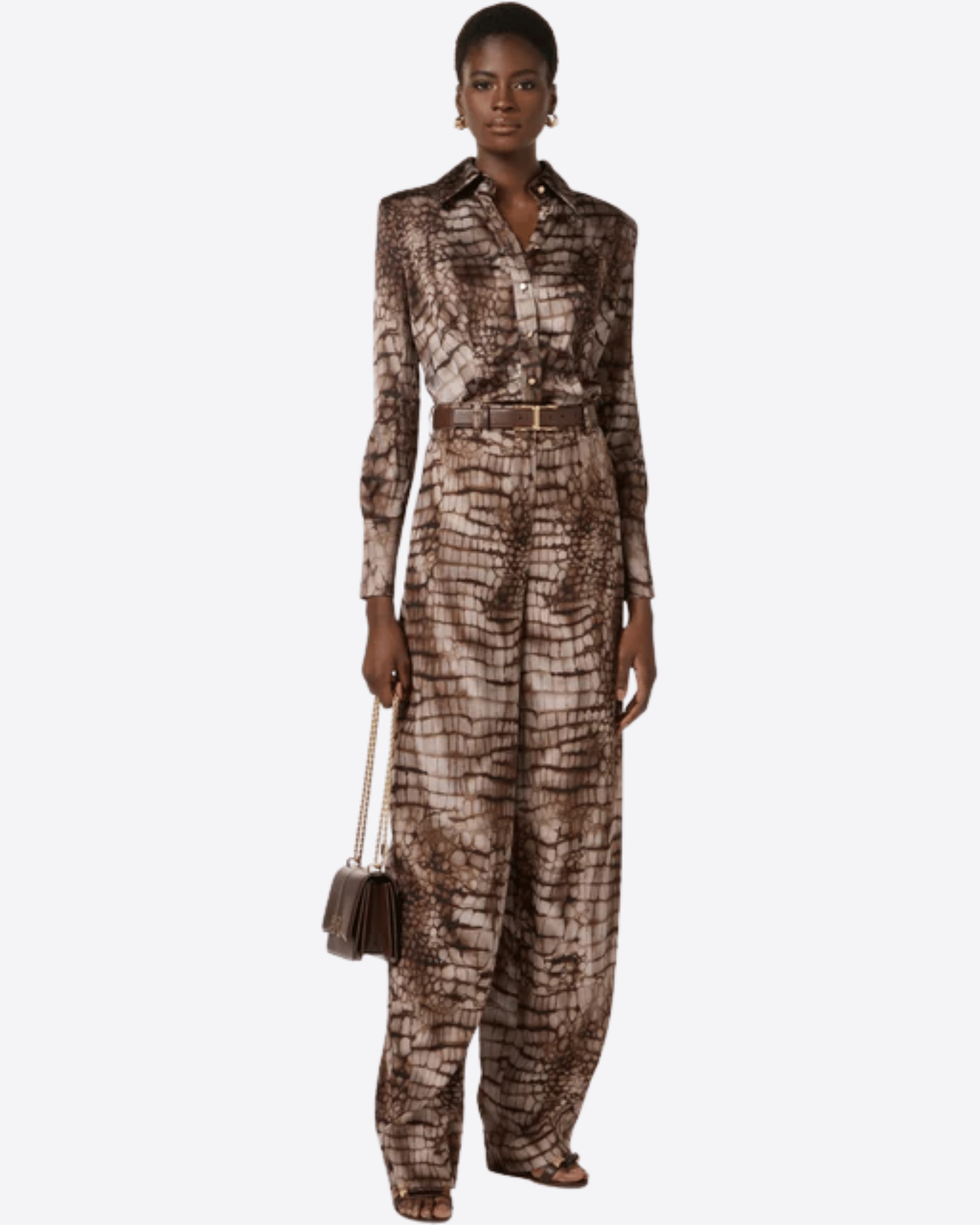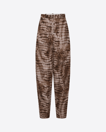 Pantaloni realizzati in jersey leggero, caratterizzati da una stampa all-over a tema alligatore, ispirata a forme e geometrie naturali. Il modello presenta vestibilità over e bottone con logo in metallo dorato, che aggiunge un dettaglio luminoso e distintivo.