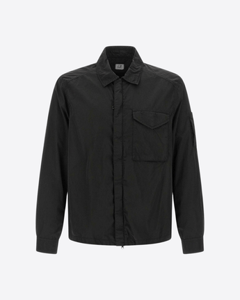 Sovracamicia cromo-r di C.P. Company, tinto in capo con trattamento antigoccia, chiusura frontale con zip, tasche e maniche lunghe con polsino e lente. La fodera in rete garantisce traspirabilità, unendo funzionalità e stile.