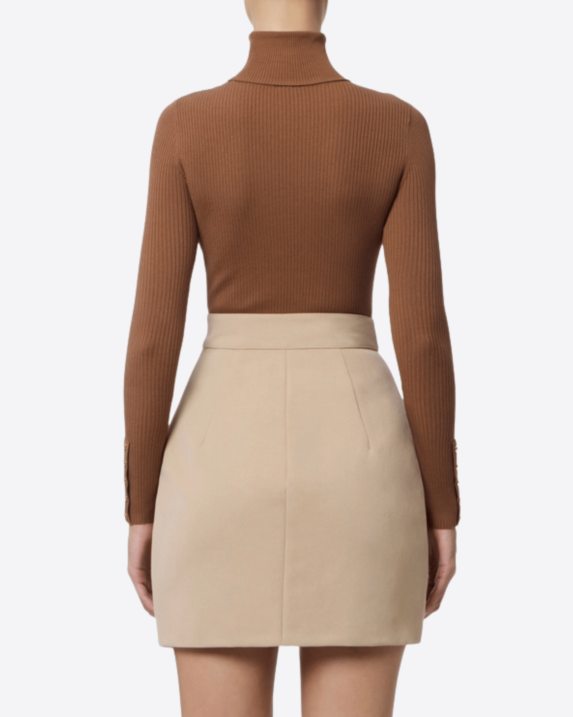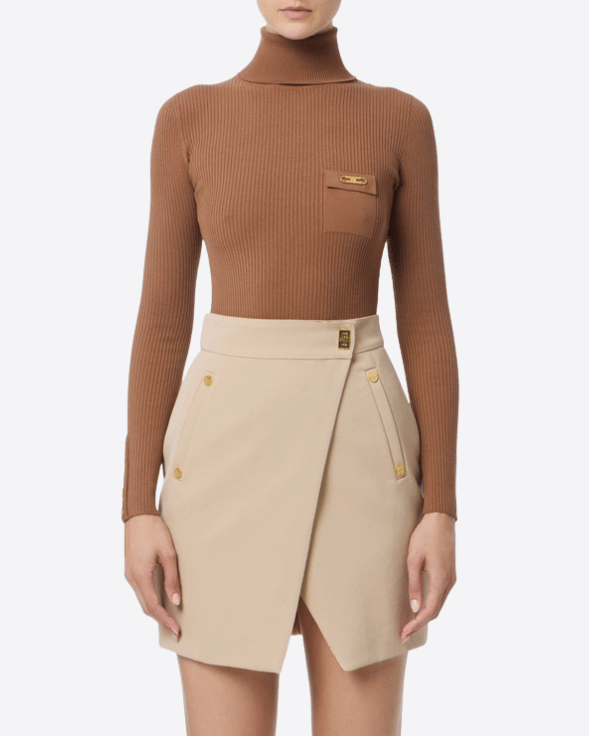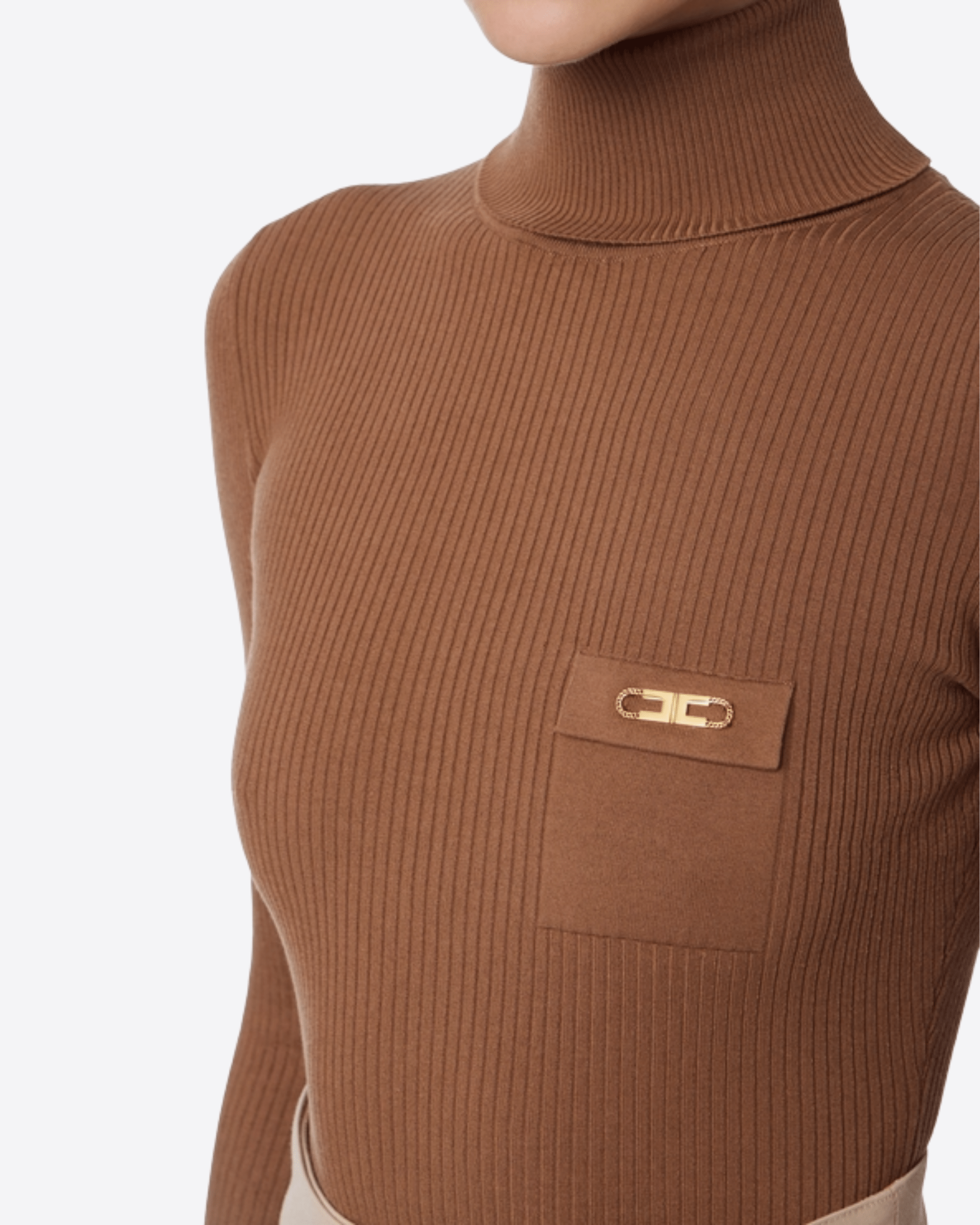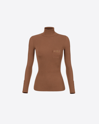 Maglia a costine dalla vestibilità aderente. Con collo dolcevita e maniche con bottoni al fondo, è personalizzata dal taschino in raso con dettaglio logo che regala una nota di luce.