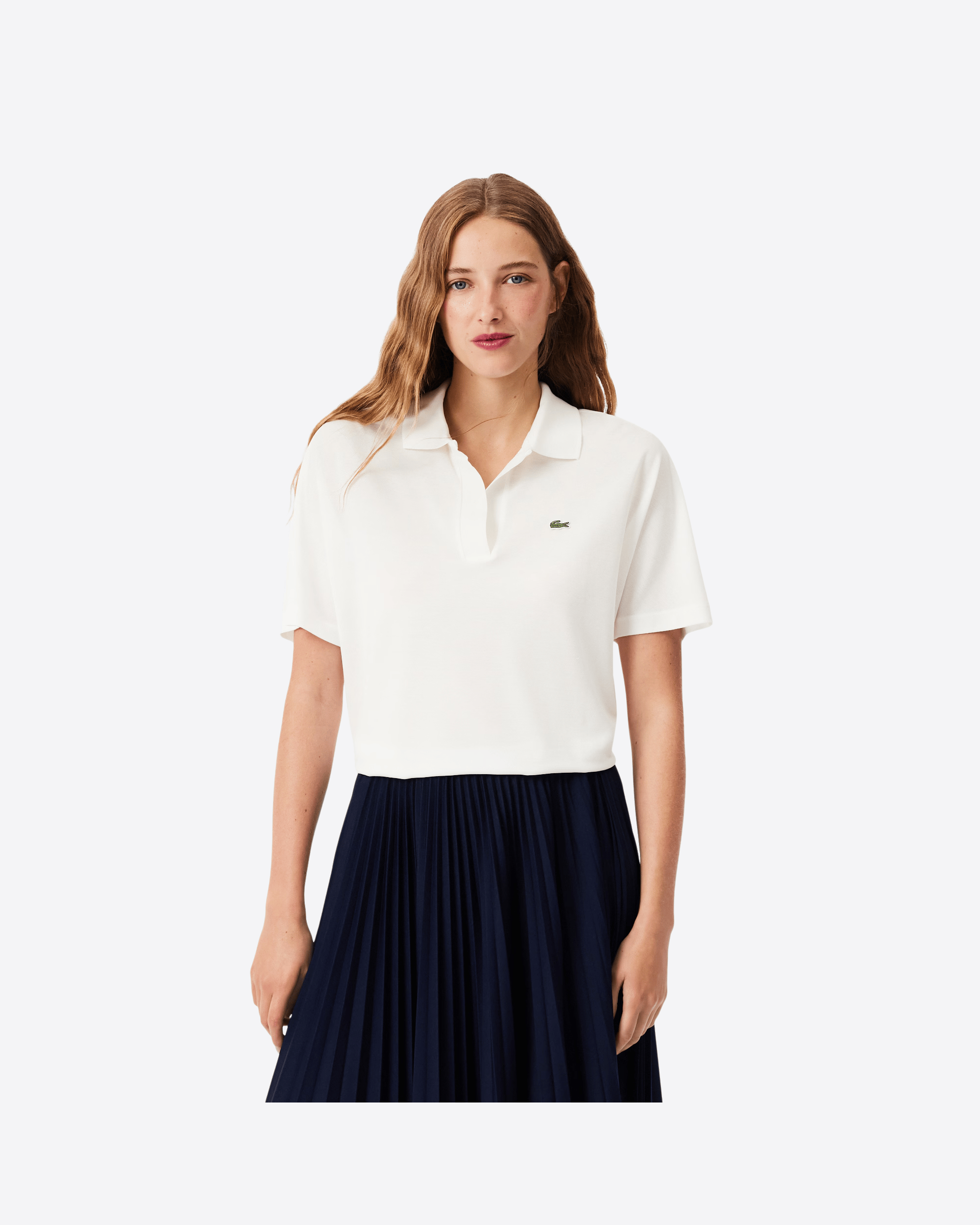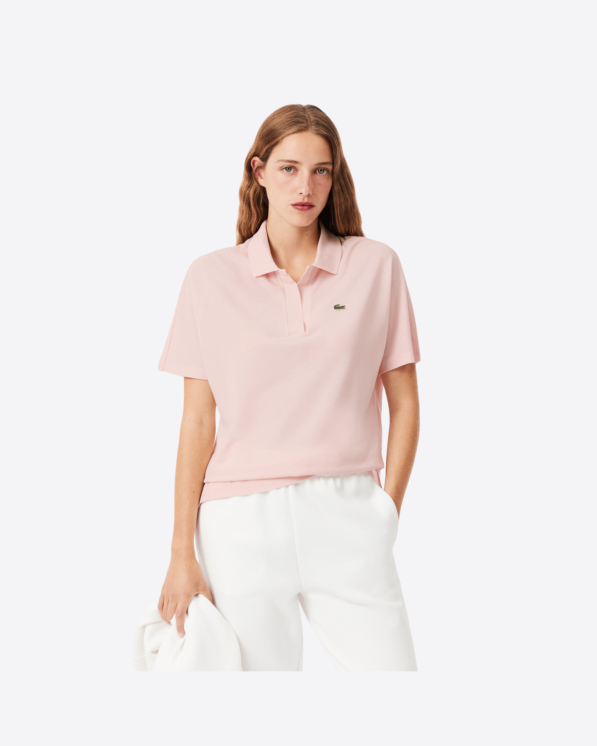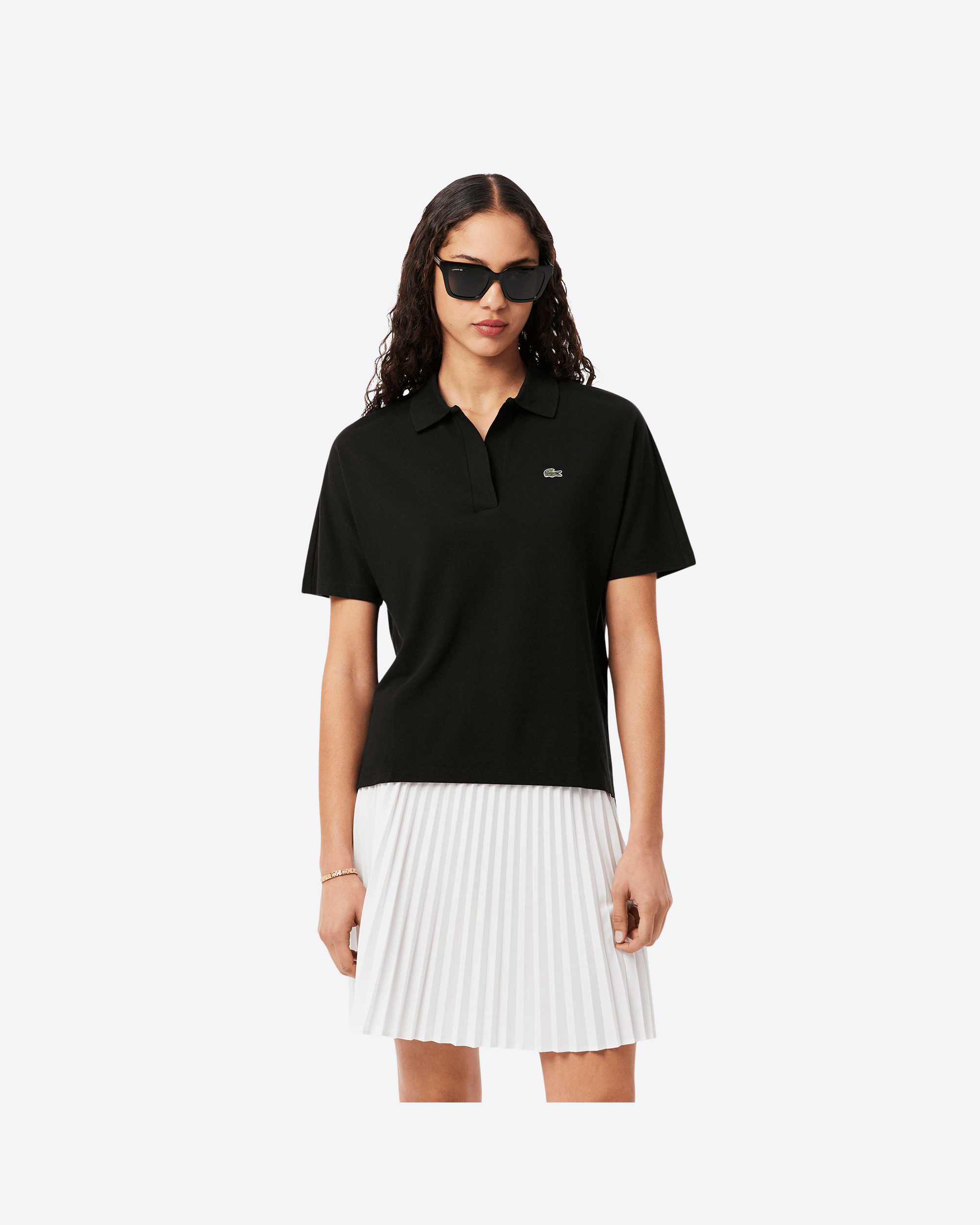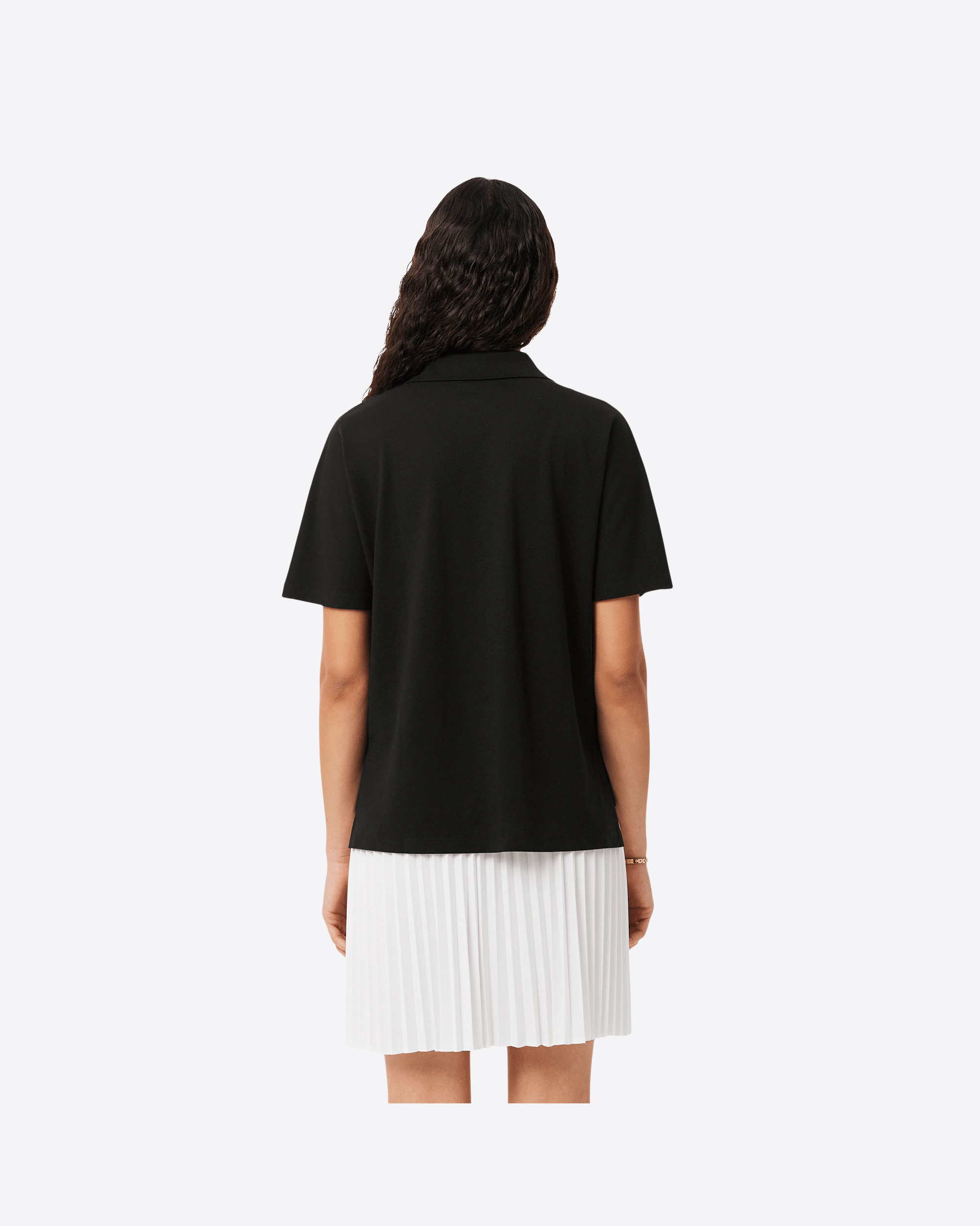 Questa versione dell’iconica polo Lacoste, introdotta nel 1933, è realizzata in tessuto piqué fluido, leggero e traspirante, ideale per uno stile rilassato ma sofisticato. Caratterizzata da scollo aperto senza bottoni e da un taglio comodo con spalle leggermente scese, offre una vestibilità confortevole. Il modello presenta un design asimmetrico, leggermente più corto sul davanti, finiture a costine sul colletto, spacchi laterali e l’inconfondibile coccodrillo ricamato sul petto.