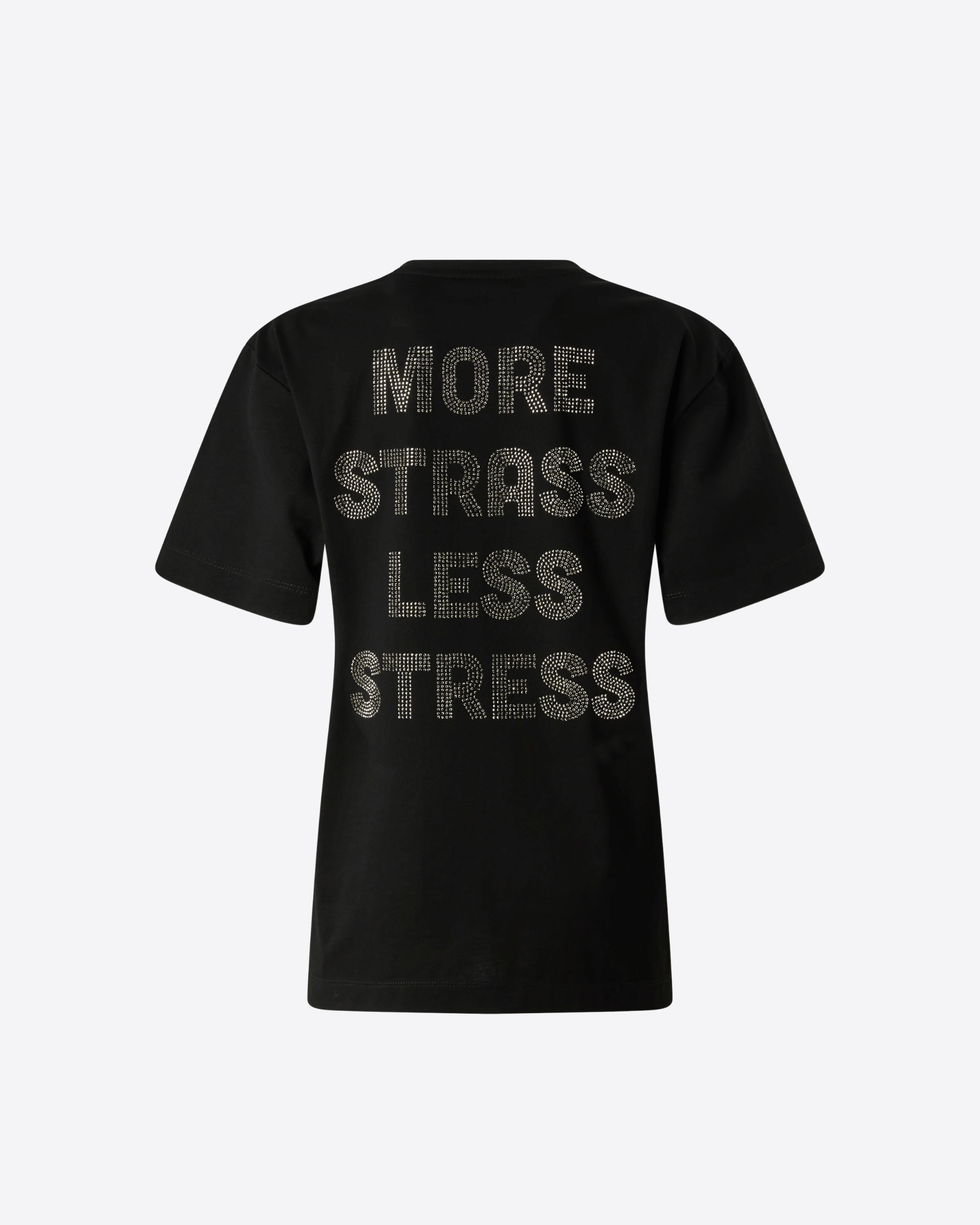 T-shirt girocollo a maniche corte in jersey di puro cotone, con logo lettering Pinko decorato da strass sul davanti e maxi lettering “More Strass Less Stress” in strass sul retro. Un capo iconico del guardaroba femminile, rivisitato in chiave Pinko per dare luce e personalità anche ai look quotidiani.