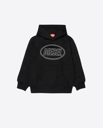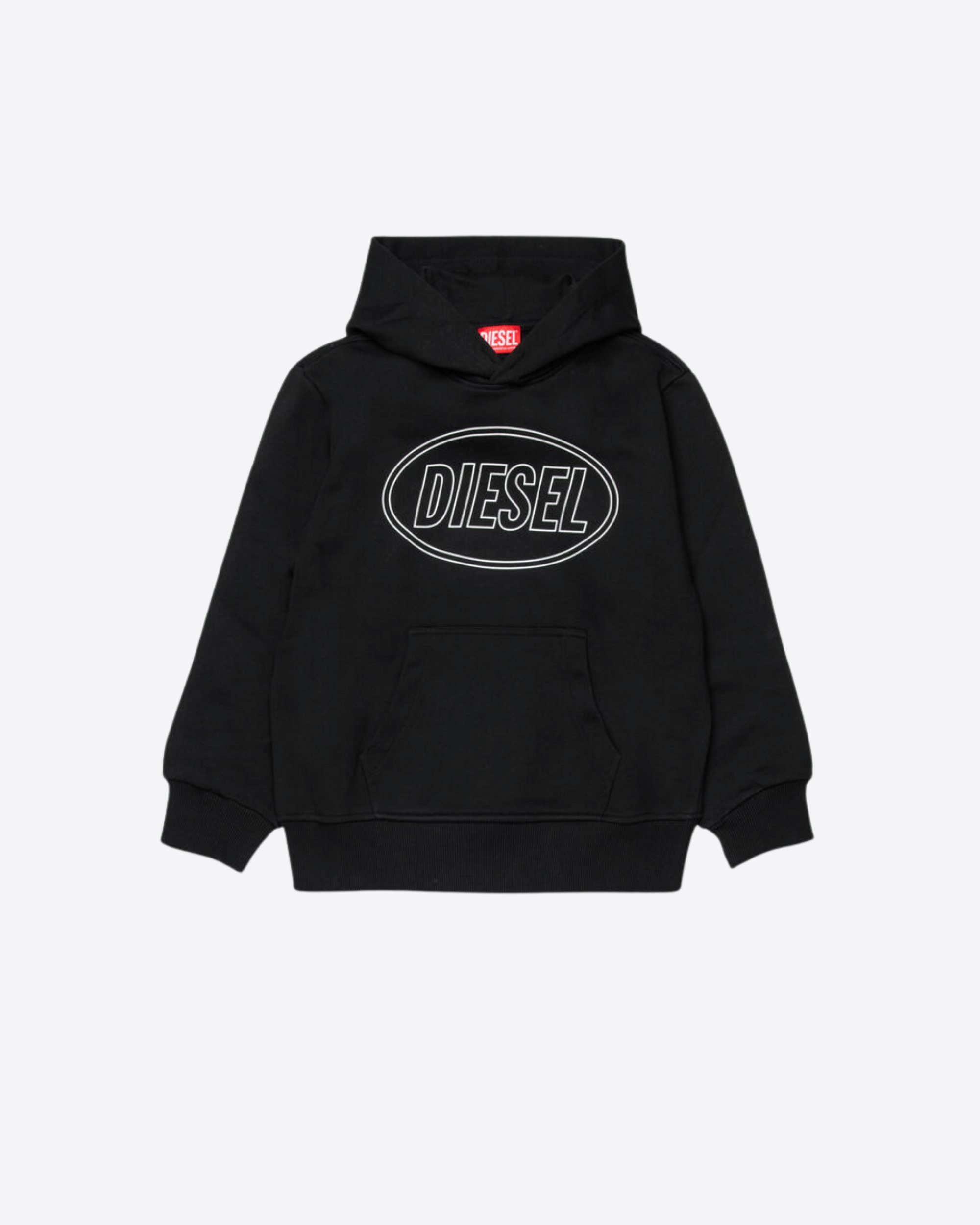 Felpa con cappuccio per bambini, realizzata in morbido tessuto felpato di cotone. Il davanti è valorizzato dal logo Diesel con contorno audace, mentre polsini e fondo a costine assicurano una vestibilità aderente e la tasca a marsupio aggiunge praticità.
