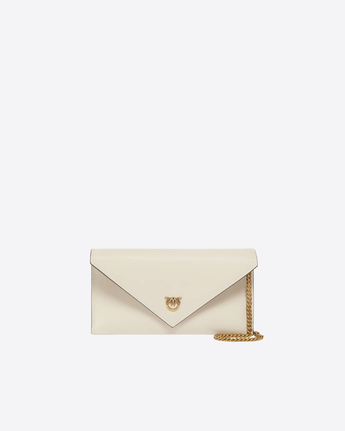 Piccola borsa piatta dal design a bustina, realizzata in morbida pelle mano seta dalla texture liscia. È dotata di una sottile tracolla a catena rimovibile che consente di indossarla a spalla o portarla a mano. L’accessorio è impreziosito dall’iconico logo Love Birds in corrispondenza della chiusura magnetica, che apre su un interno foderato, organizzato con pratici scomparti a parete per carte e documenti.