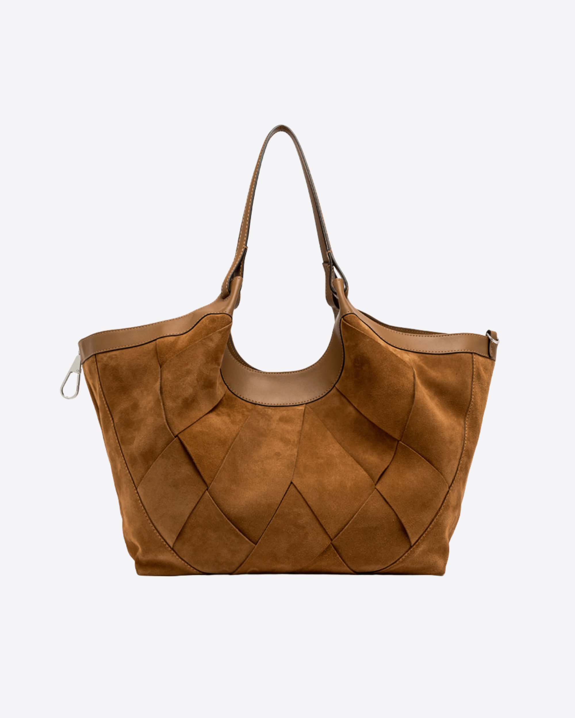 DUA è l’icona del brand, una borsa dal design semplice ma contemporaneo. Realizzata in pelle di camoscio con trama geometrica, si distingue per il suo stile country-chic, rendendola un accessorio must-have di stagione. I profili in pelle esaltano la naturalezza dei colori, mentre la lavorazione della trama aggiunge carattere e raffinatezza. Dotata di un unico scomparto e doppi manici in tono, si chiude con un bottone a pressione. Dimensioni: 34 x 38 x 16 cm.