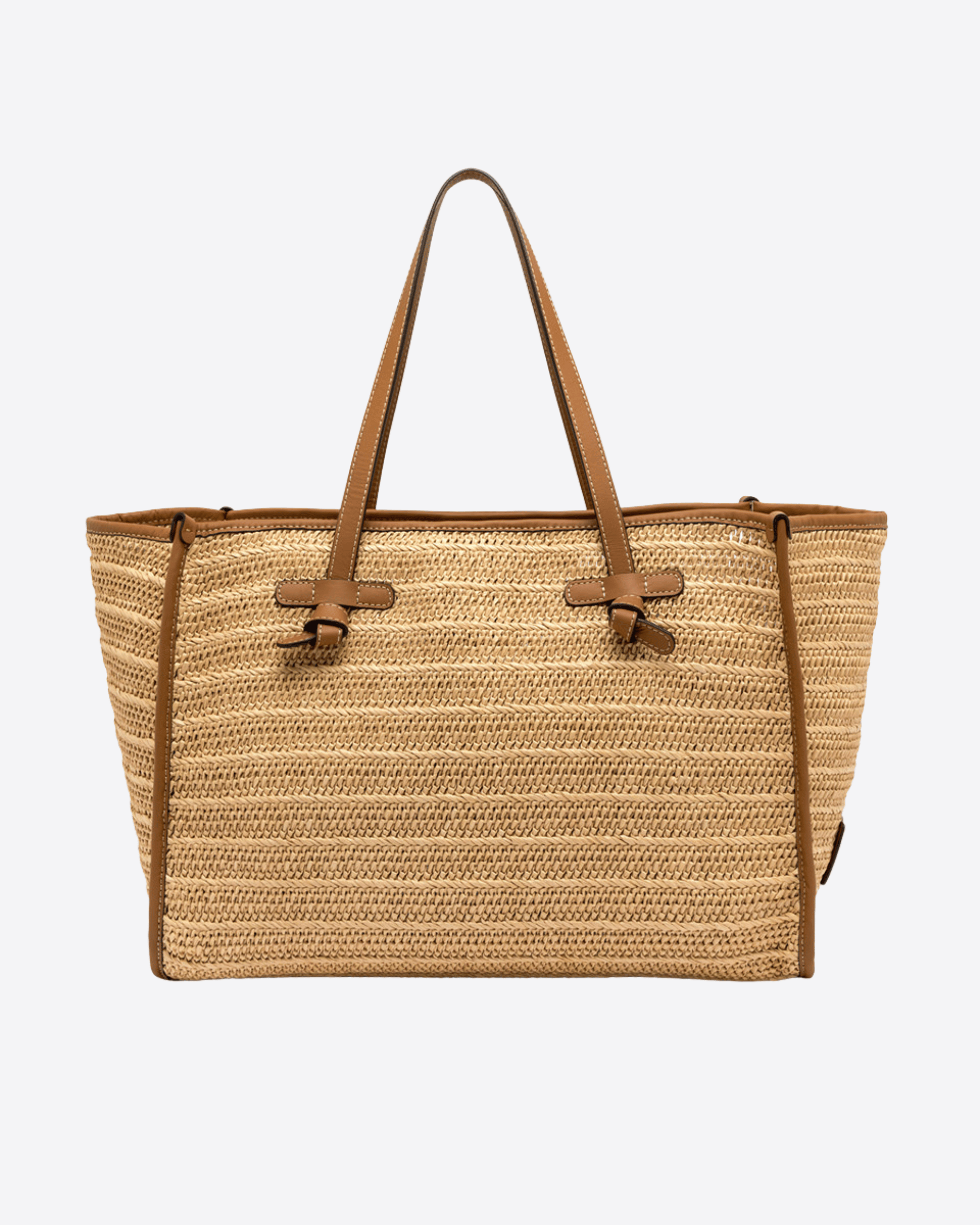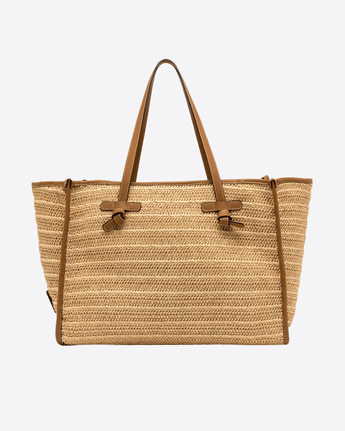Shopping Marcella by Gianni Chiarini Firenze in paglia effetto stuoia, leggera e naturalmente estiva, con profili in pelle e manici tono su tono. La struttura sfoderata e la pochette interna con zip ne garantiscono praticità e leggerezza. Perfetta per aggiungere un tocco rustico chic ai look più dinamici. Dimensioni: 38 x 31 x 16 cm.