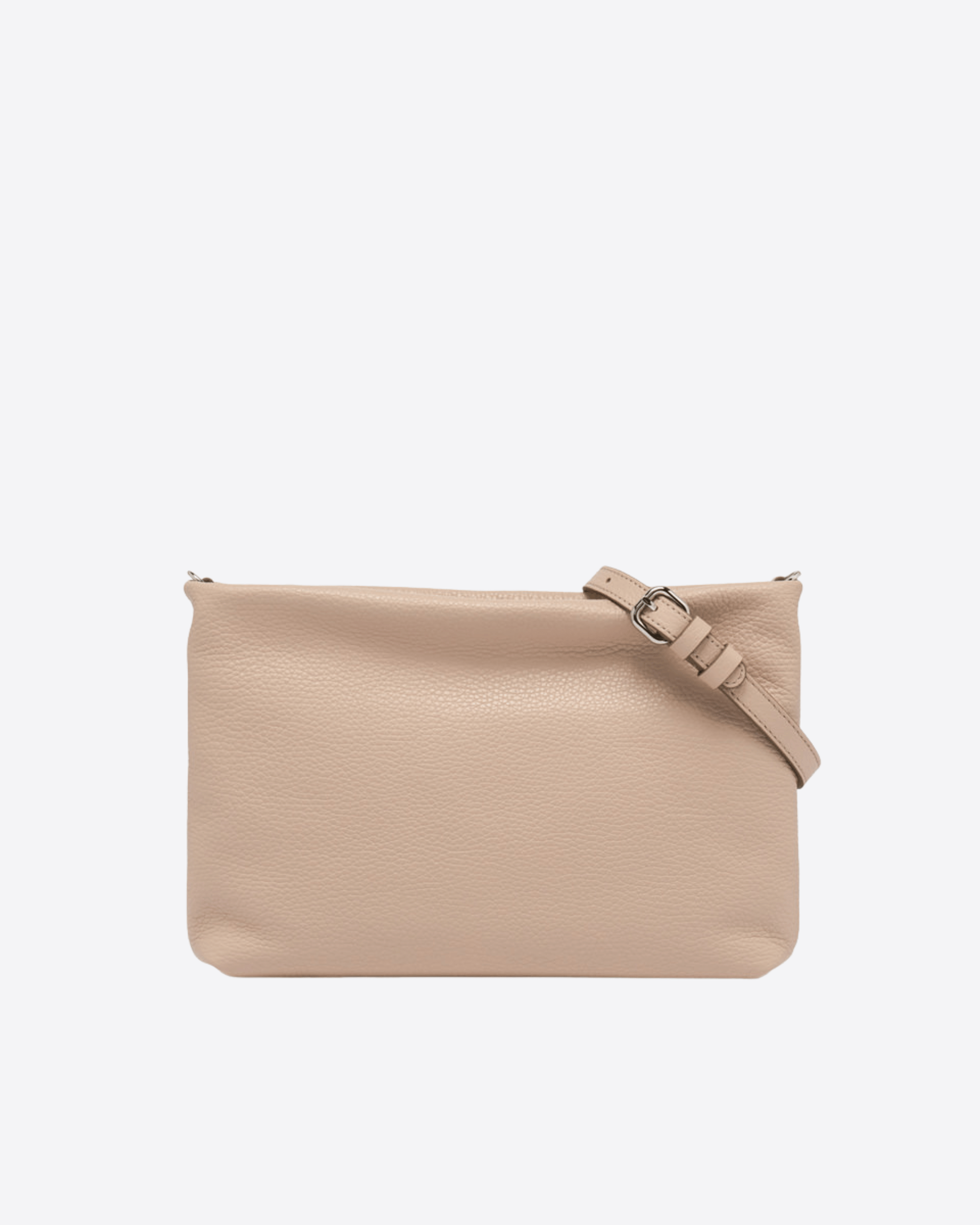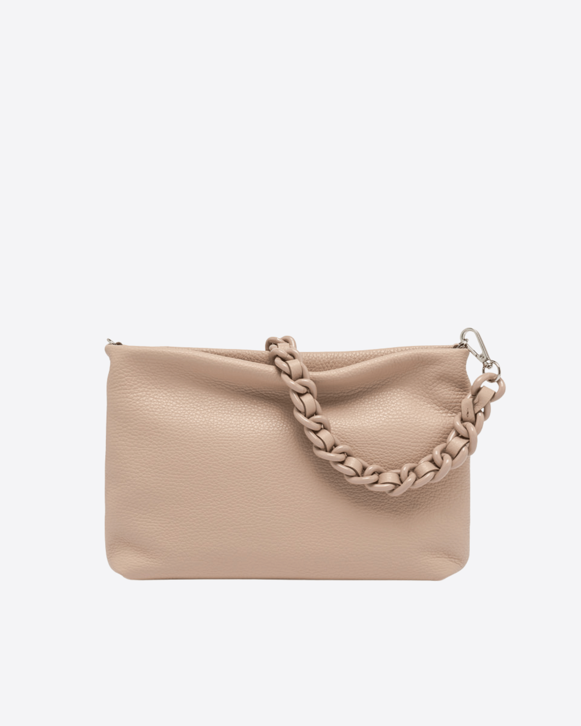 Brenda, bestseller di Gianni Chiarini Firenze, è una pochette in pelle martellata impreziosita da una catena in resina removibile. L’interno è dotato di una pratica tasca piatta. Completa di tracolla in pelle regolabile e removibile, può essere indossata anche crossbody, unendo praticità e raffinatezza in ogni occasione. Dimensioni: 32 x 22 x 2 cm.