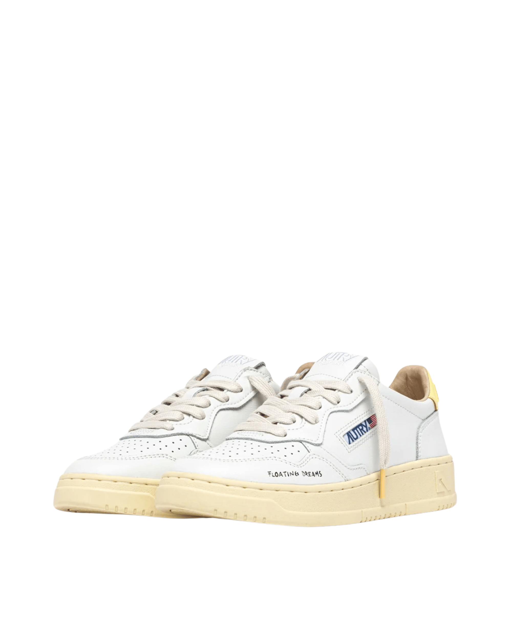 Il modello da donna è realizzato in morbida pelle bianca con microfori sulla punta per una migliore traspirabilità. Il talloncino giallo, il dettaglio laterale jacquard e la label sulla linguetta riportano il logo Autry, mentre il lettering laterale "Floating dreams" aggiunge un tocco originale al look.