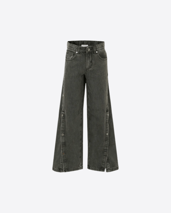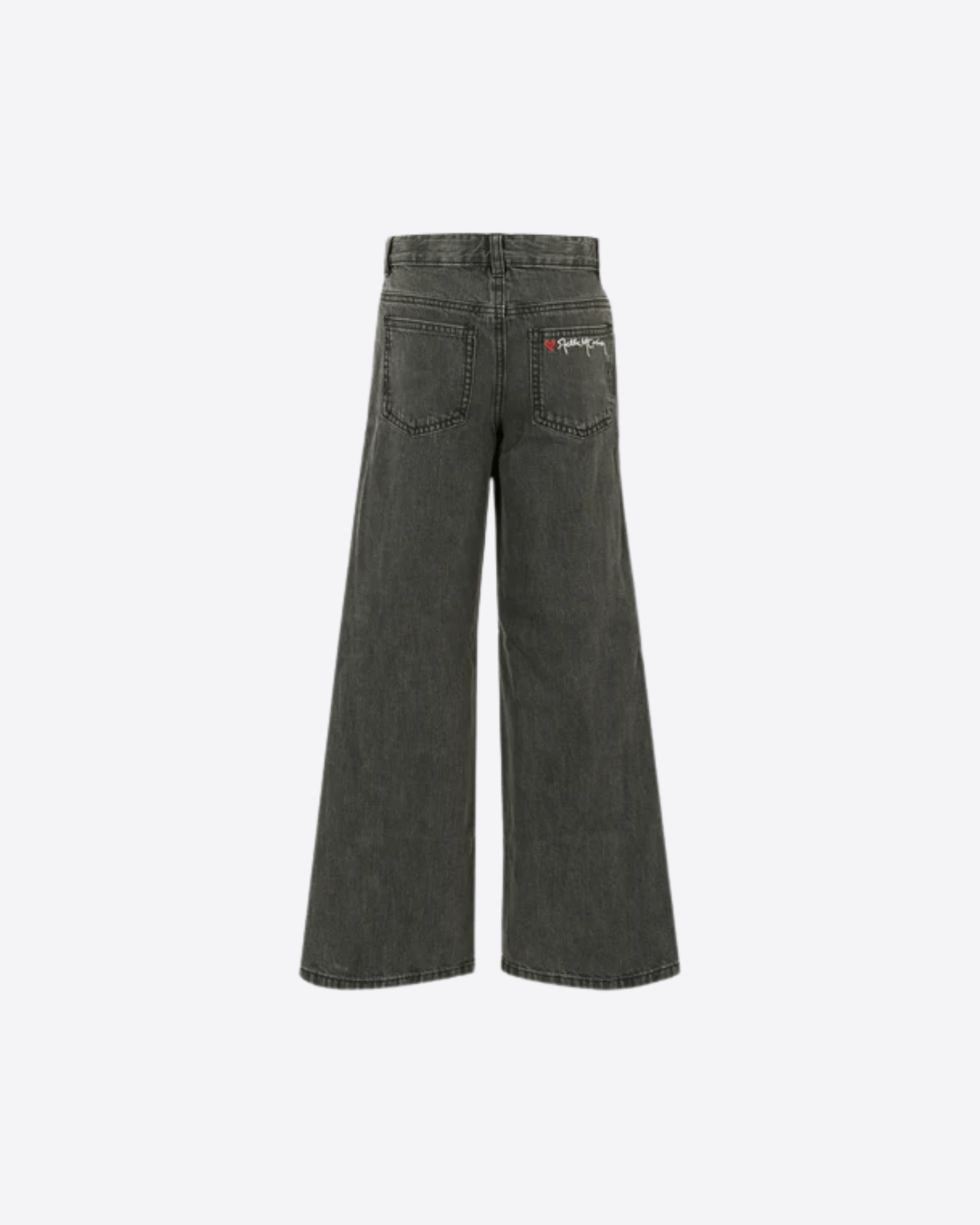 Jeans neri Stella McCartney Kids realizzati in cotone sostenibile, con cinque tasche, vita regolabile tramite elastici interni con bottone, passanti per cintura e chiusura frontale con bottone e zip. Il design è arricchito da borchie laterali e dal logo bianco ricamato sul retro, per un tocco moderno e distintivo.