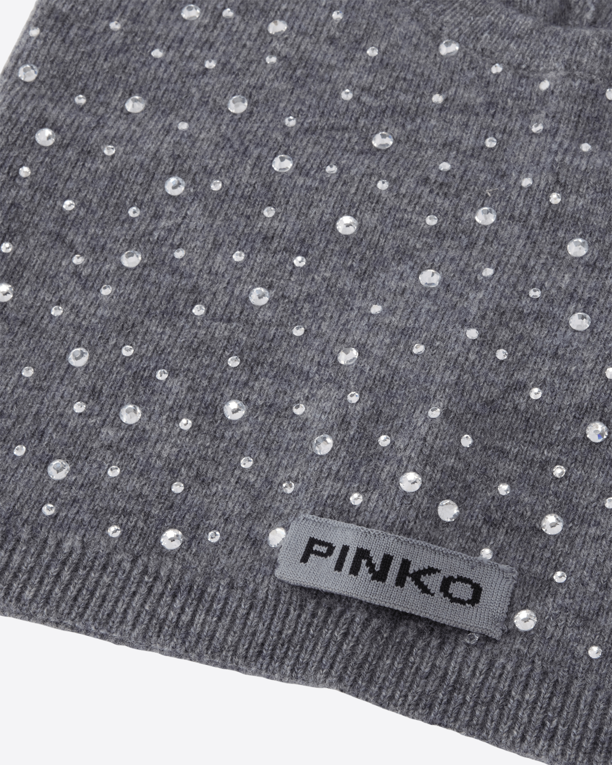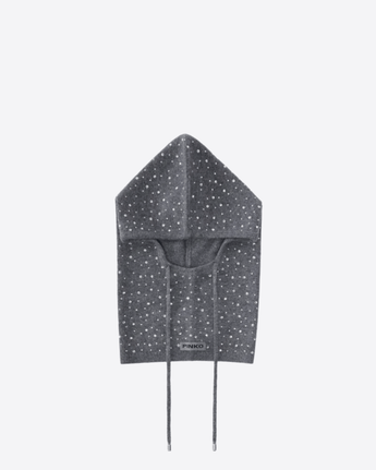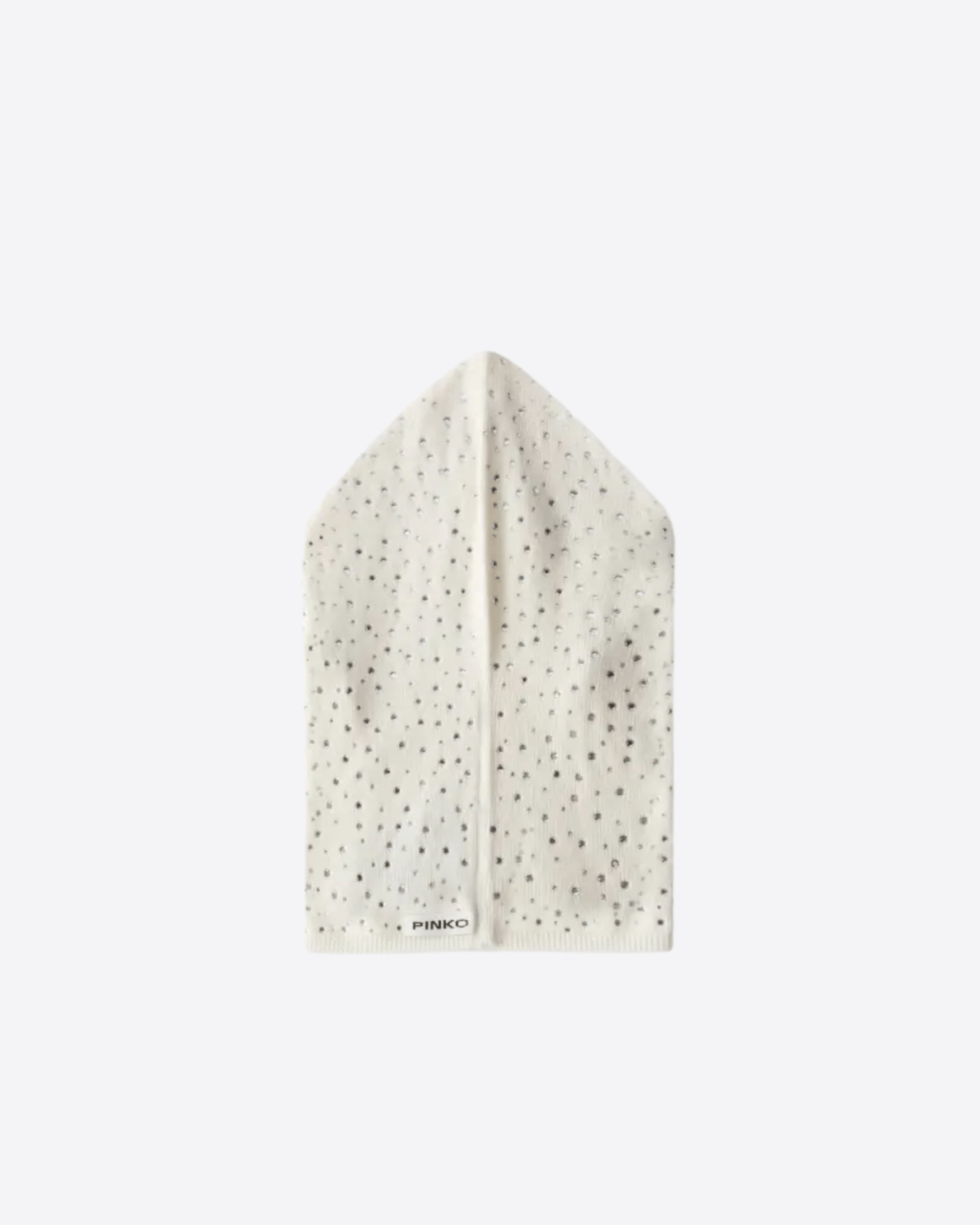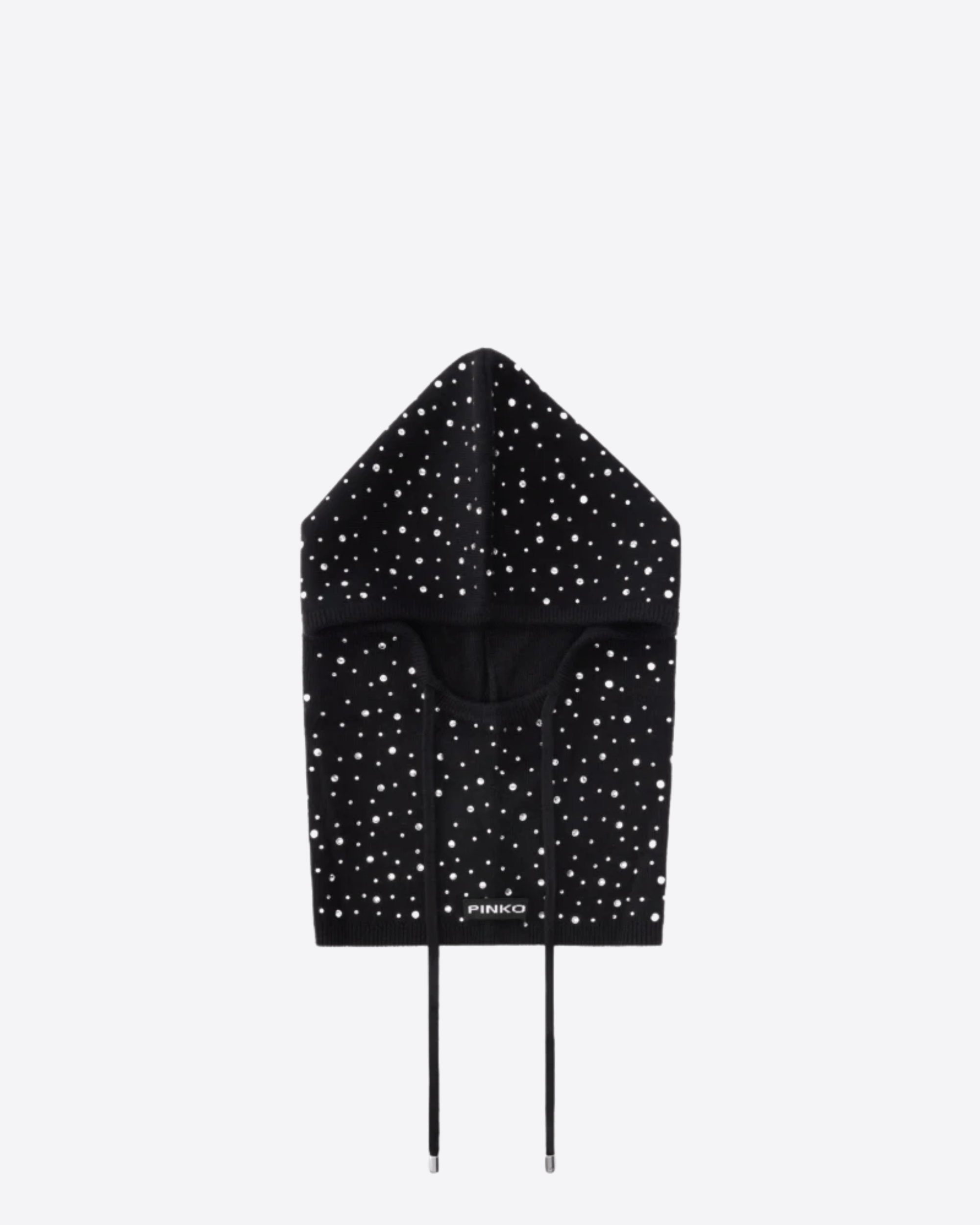 Copricapo in stile balaclava regolabile con coulisse, realizzato in filato cardato di pura lana vergine con un aspetto soffice ma al tempo stesso compatto. Gli innumerevoli strass, i veri protagonisti del modello, rivestono tutta la superficie lavorata a coste, mentre l'etichetta con logo lettering PINKO tono su tono sul retro completa l'accessorio con un tocco personalizzato.