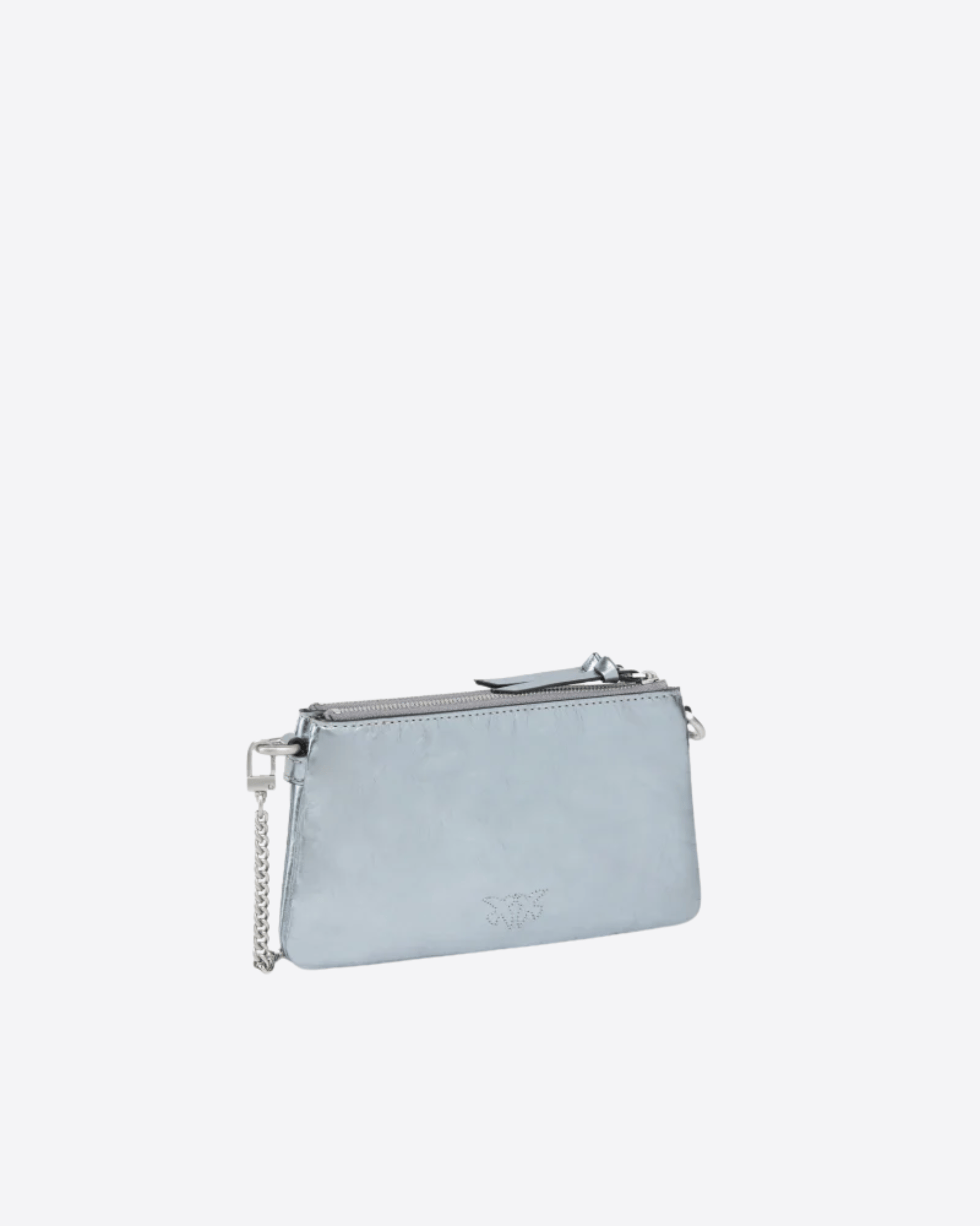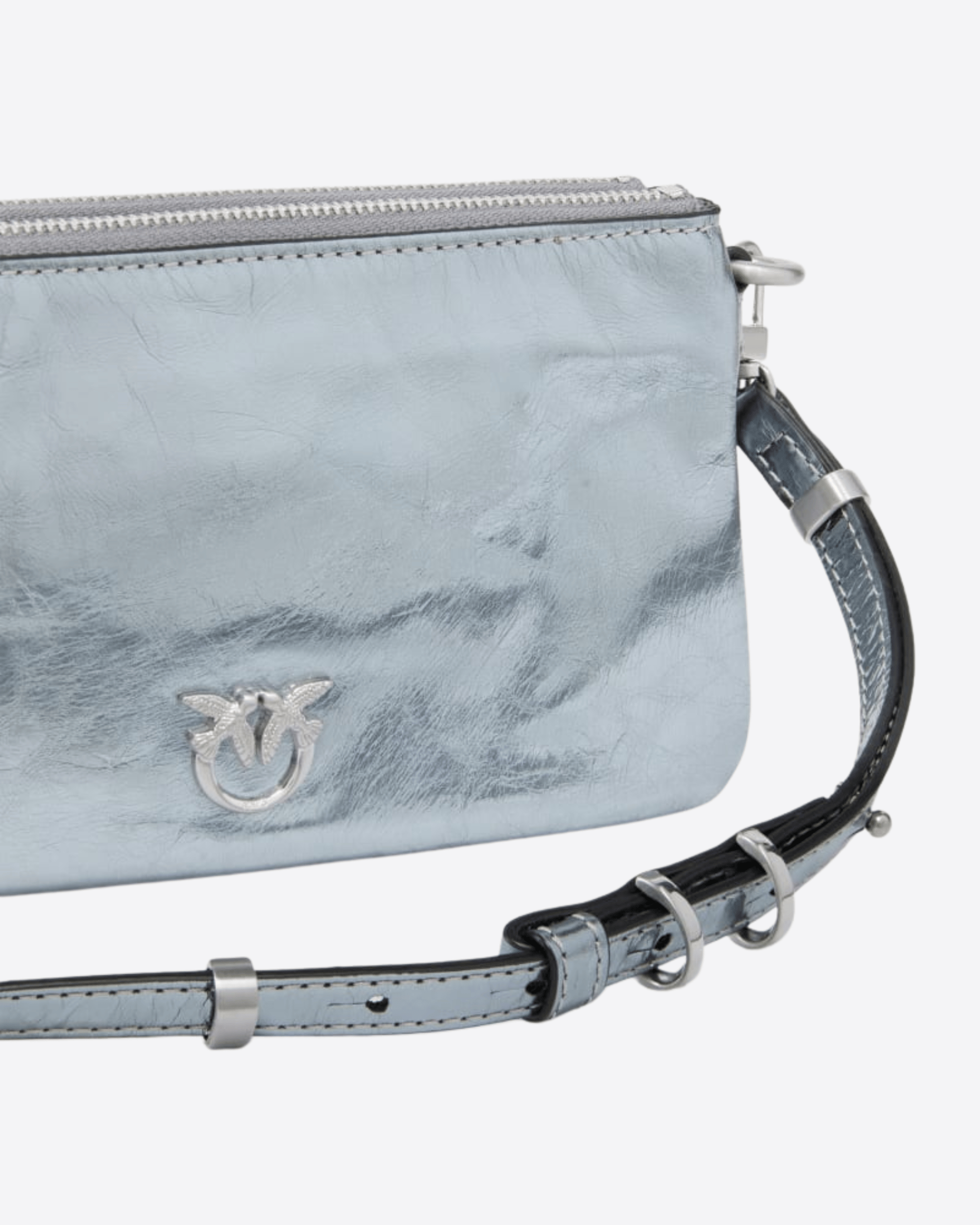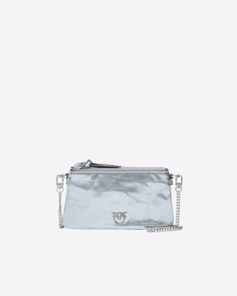 Borsa piccola stile pochette Mini Double Bag dalla forma rettangolare in pelle laminata, caratterizzata da una texture effetto used e una fodera in cotone. Completa di piccola tracolla regolabile e rimovibile in pelle e catena per una portabilità a mano o a spalla, la borsetta risulta estremamente versatile e pratica, anche grazie alle zip che la suddividono in due scomparti. Il modello ti donerà un'aria sognante, mentre l'iconico logo Love Birds si fa portavoce dell'inimitabile stile PINKO. Le coste a contrasto, ben visibili lungo la tracolla, testimoniano invece l'artigianalità del prodotto.