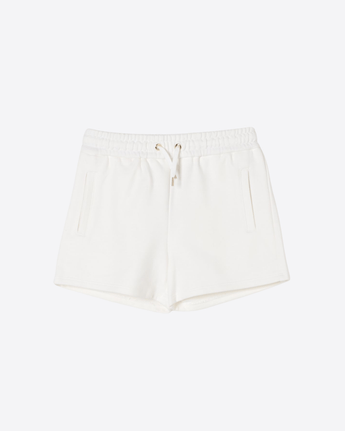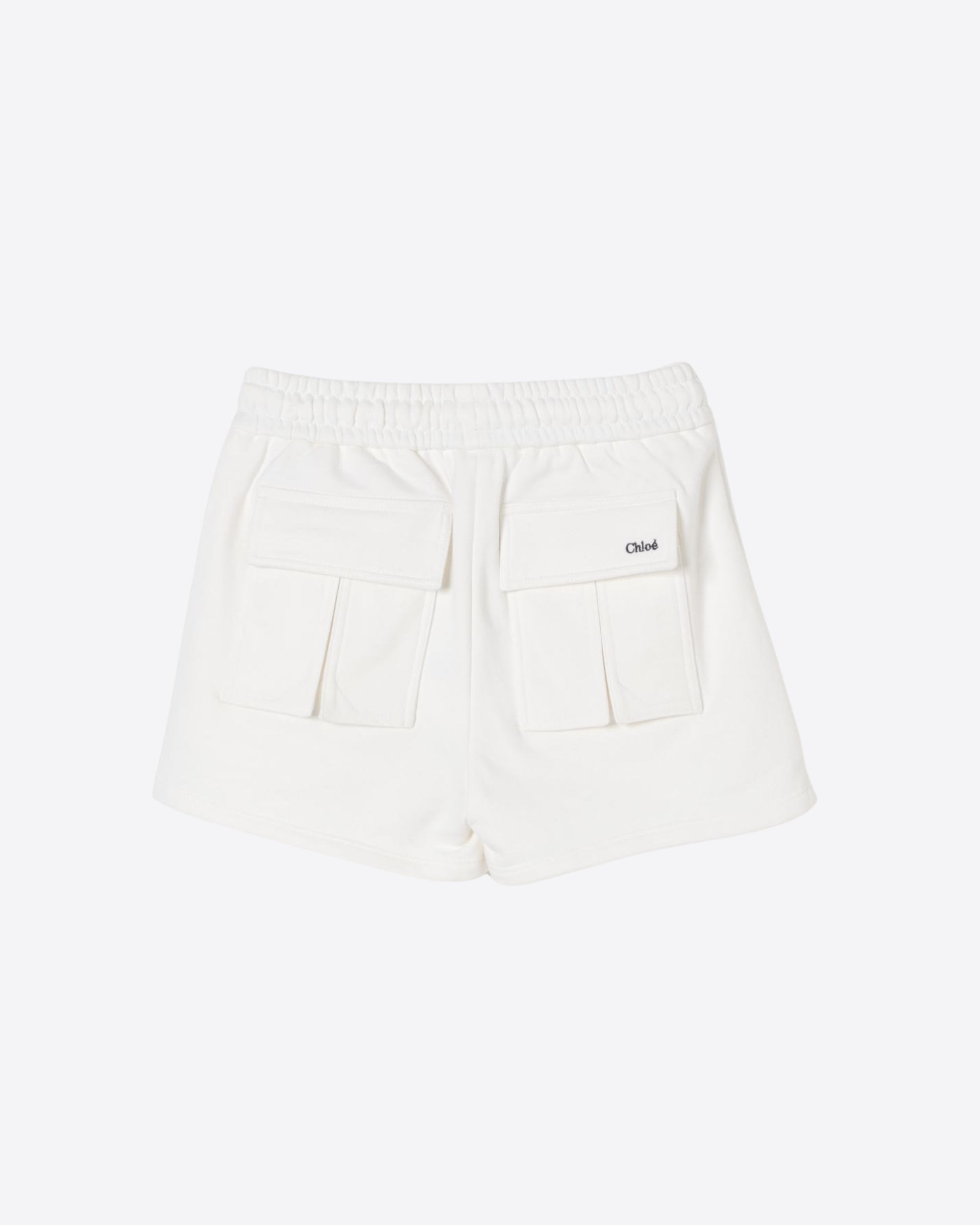 White shorts from the French brand Chloé Kids, made of brushed organic cotton, with elasticated waist, drawstring, side pockets and flap pockets on the back. They are decorated with an embroidered logo on the back.