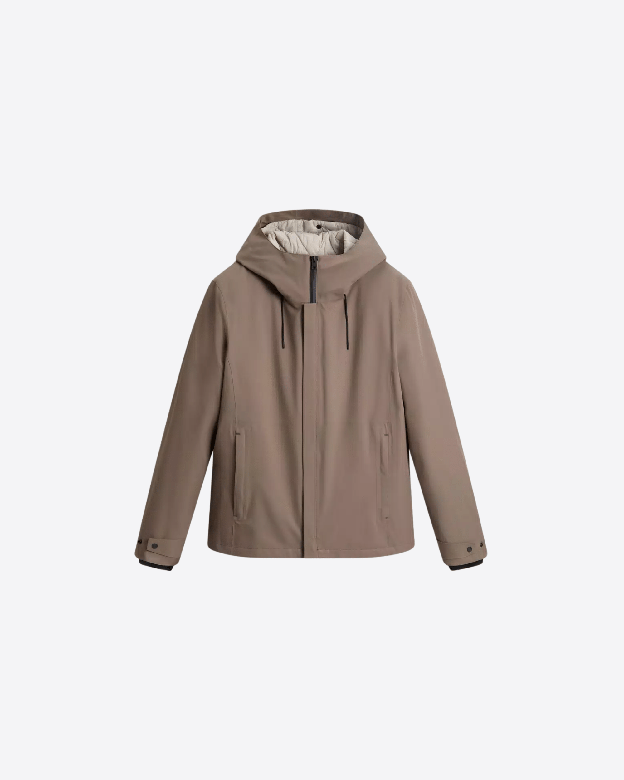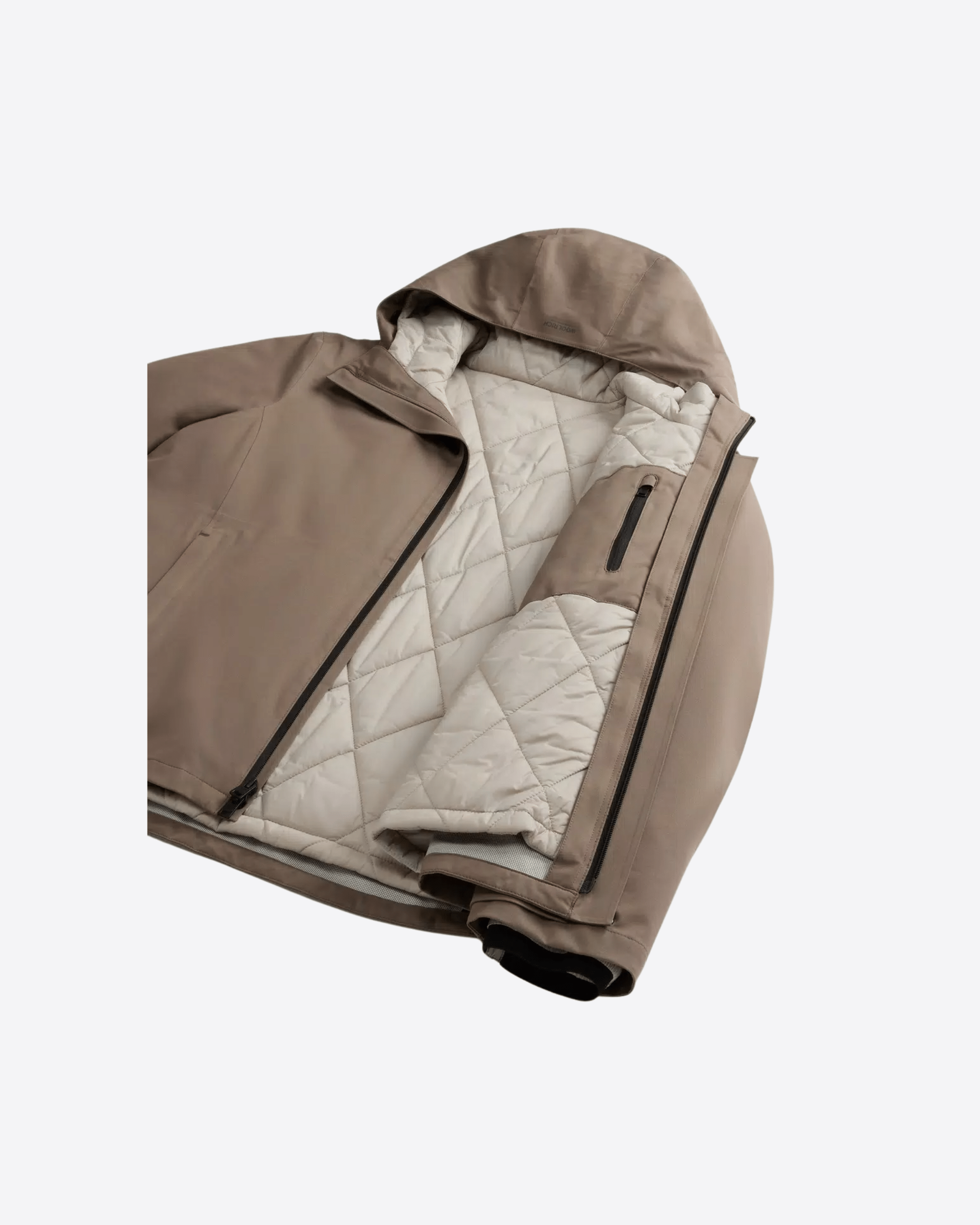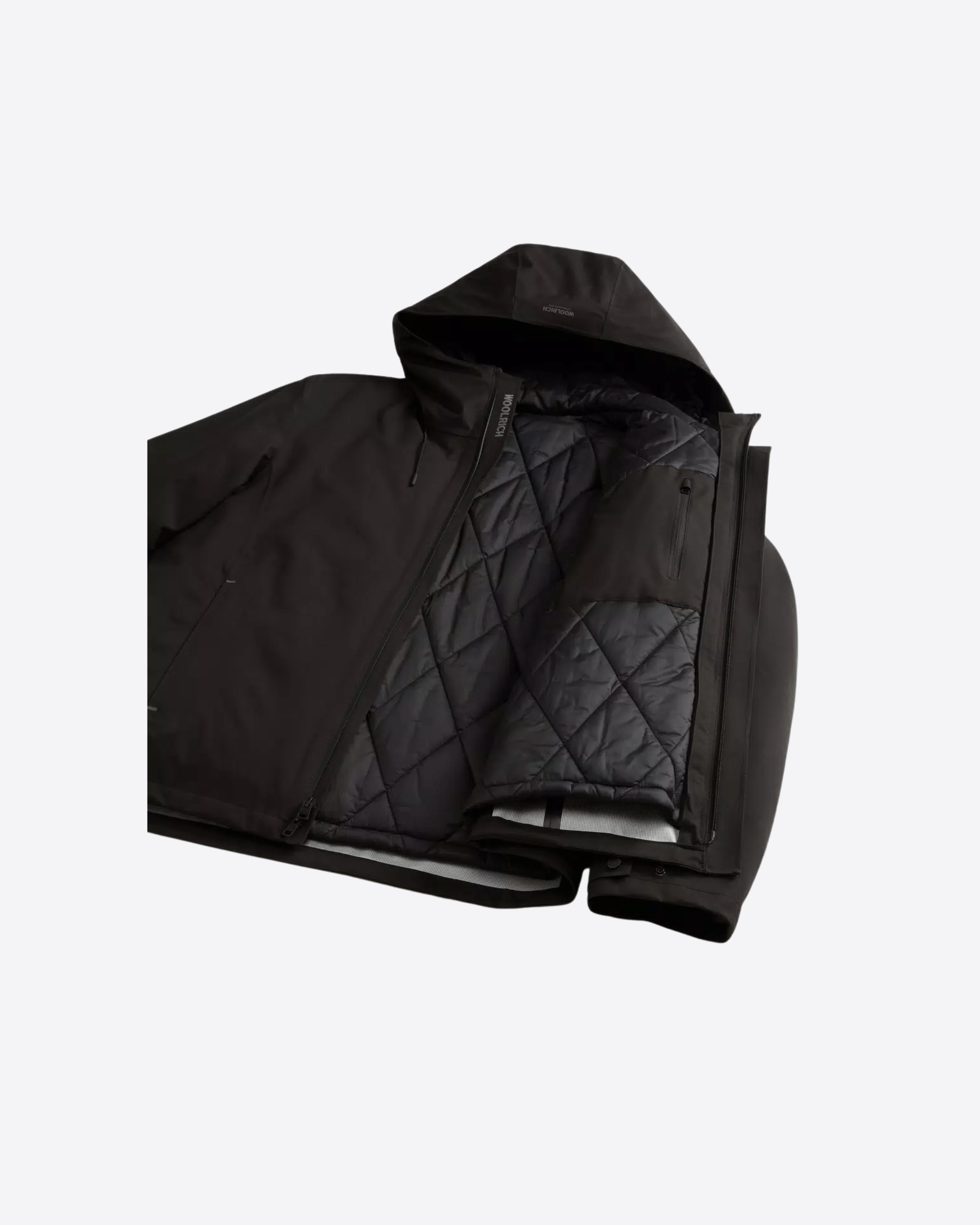 Progettata per garantire massima versatilità e protezione, questa giacca 3 in 1 è realizzata in twill di poliestere a 2,5 strati, idrorepellente, resistente al vento e traspirante. Lo strato esterno è parzialmente nastrato per una protezione extra e presenta cappuccio regolabile, zip bidirezionale impermeabile parzialmente coperta da patta, due tasche con zip, polsini regolabili e dettagli riflettenti sui lati per una maggiore visibilità al buio. Il design include una giacca interna rimovibile, imbottita e dotata di cappuccio, double face con un lato trapuntato e uno liscio a tinta unita. Ha tasche a filetto e tasca interna con zip sul lato trapuntato. È collegata allo strato esterno tramite una zip centrale, un bottone a pressione sul cappuccio e passanti su polsini e collo. I due strati possono essere indossati insieme o separatamente, in base alle condizioni climatiche o allo stile desiderato.
