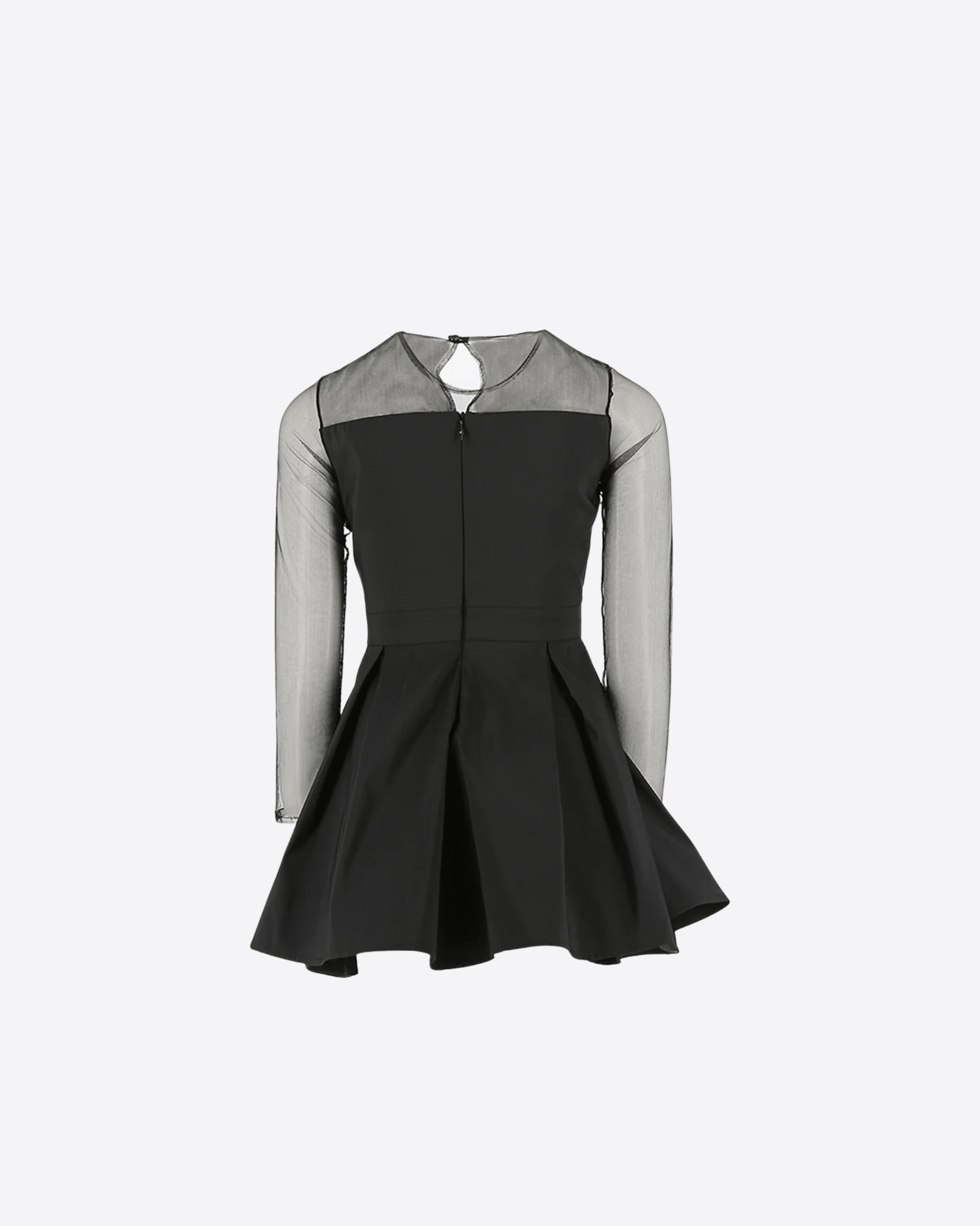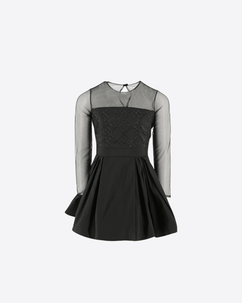 Abito Elisabetta Franchi dal fascino raffinato, con corpetto in tulle trasparente e maniche lunghe leggere. Il bustino è arricchito da luminosi micro-cristalli che creano un motivo geometrico elegante, mentre la gonna svasata dona volume e movimento.