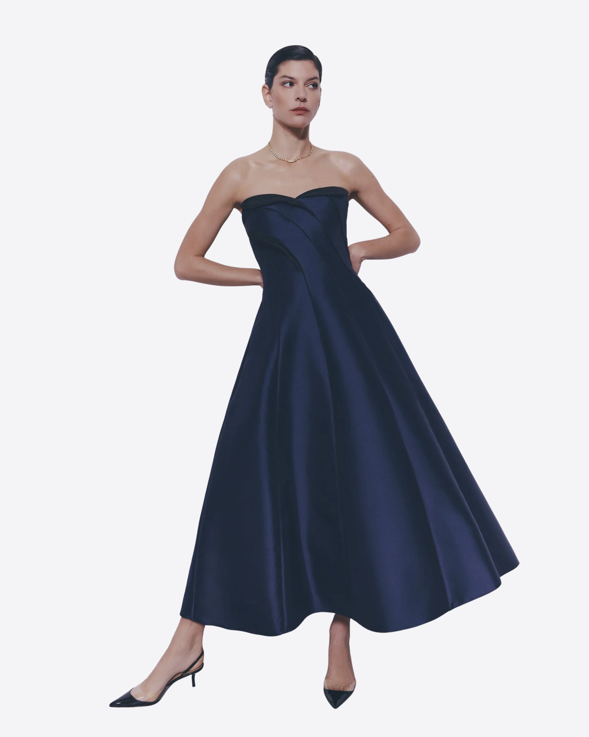 Il design bustier senza spalline valorizza il décolleté con linee essenziali, mentre la scollatura posteriore aperta aggiunge un tocco raffinato. La vita definita esalta la figura, creando un equilibrio armonioso tra costruzione e leggerezza.