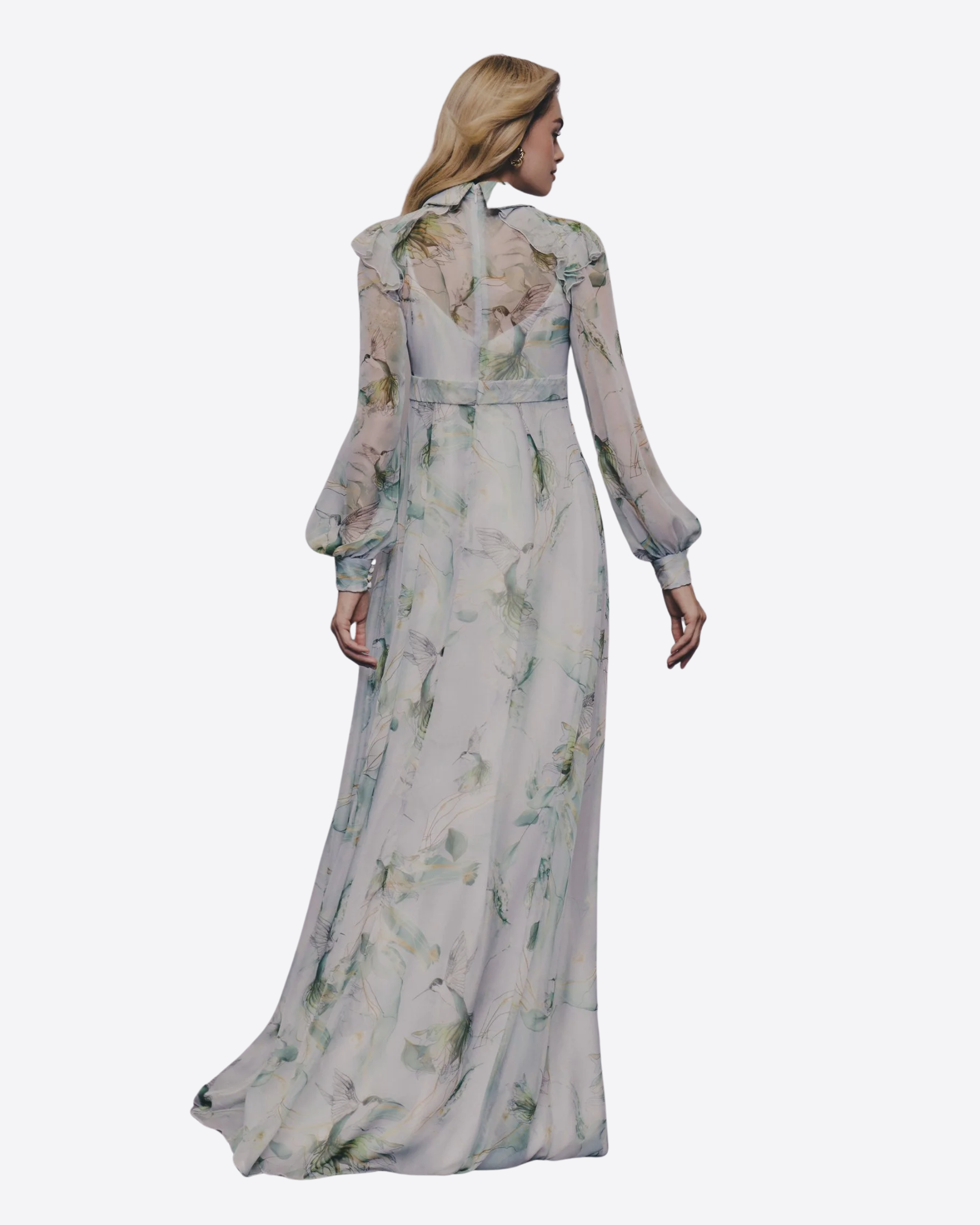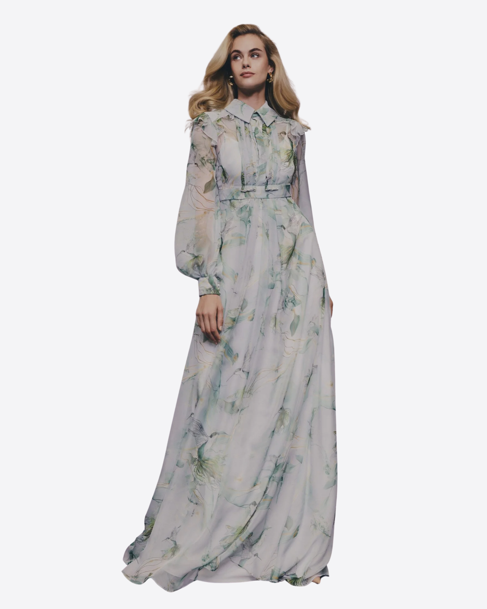 Lunghezza lunga e vita definita contribuiscono a una vestibilità armoniosa, arricchita da un delicato tessuto stampato che esalta la leggerezza del chiffon. Ideale per occasioni speciali e cerimonie, è un capo femminile e sofisticato.