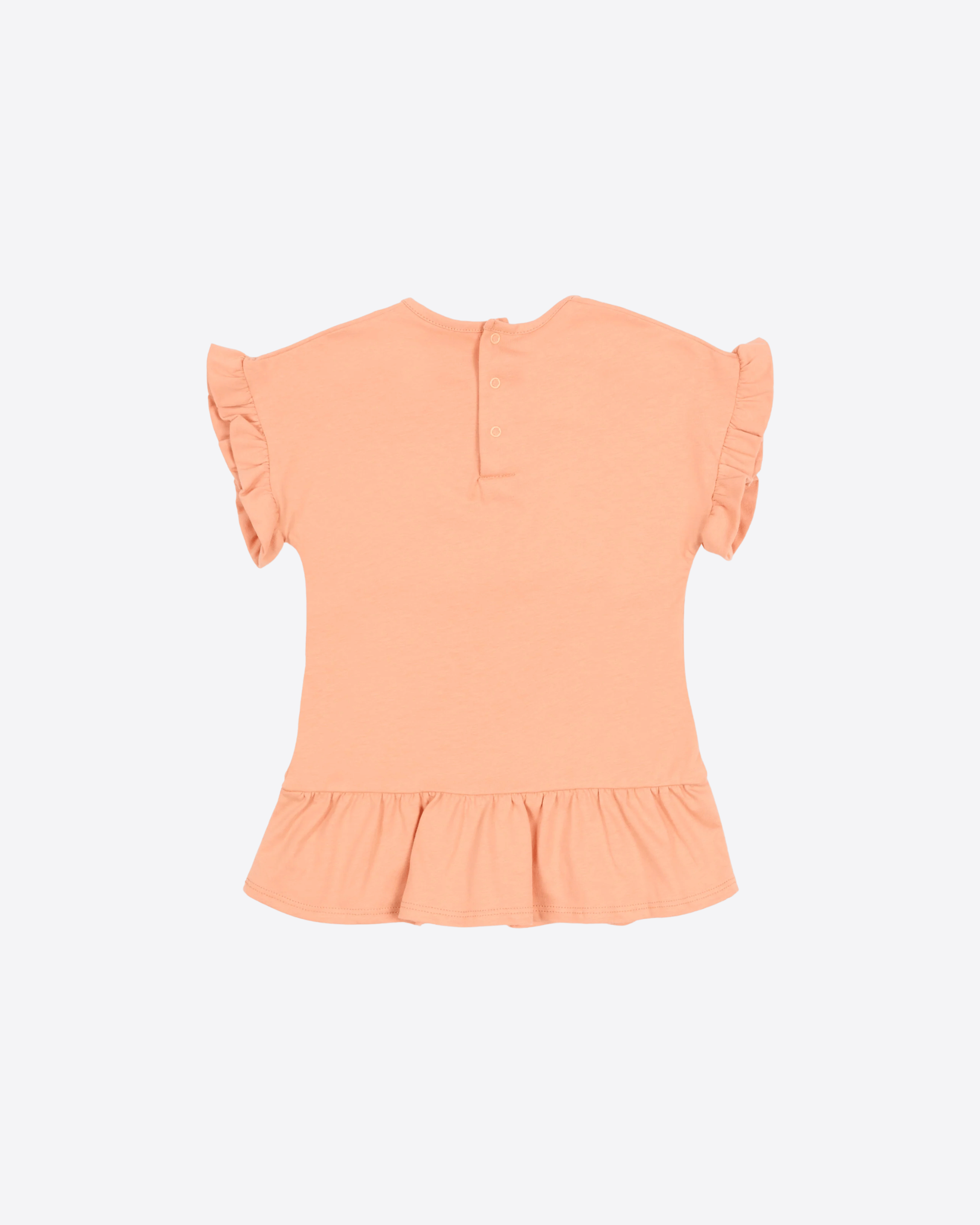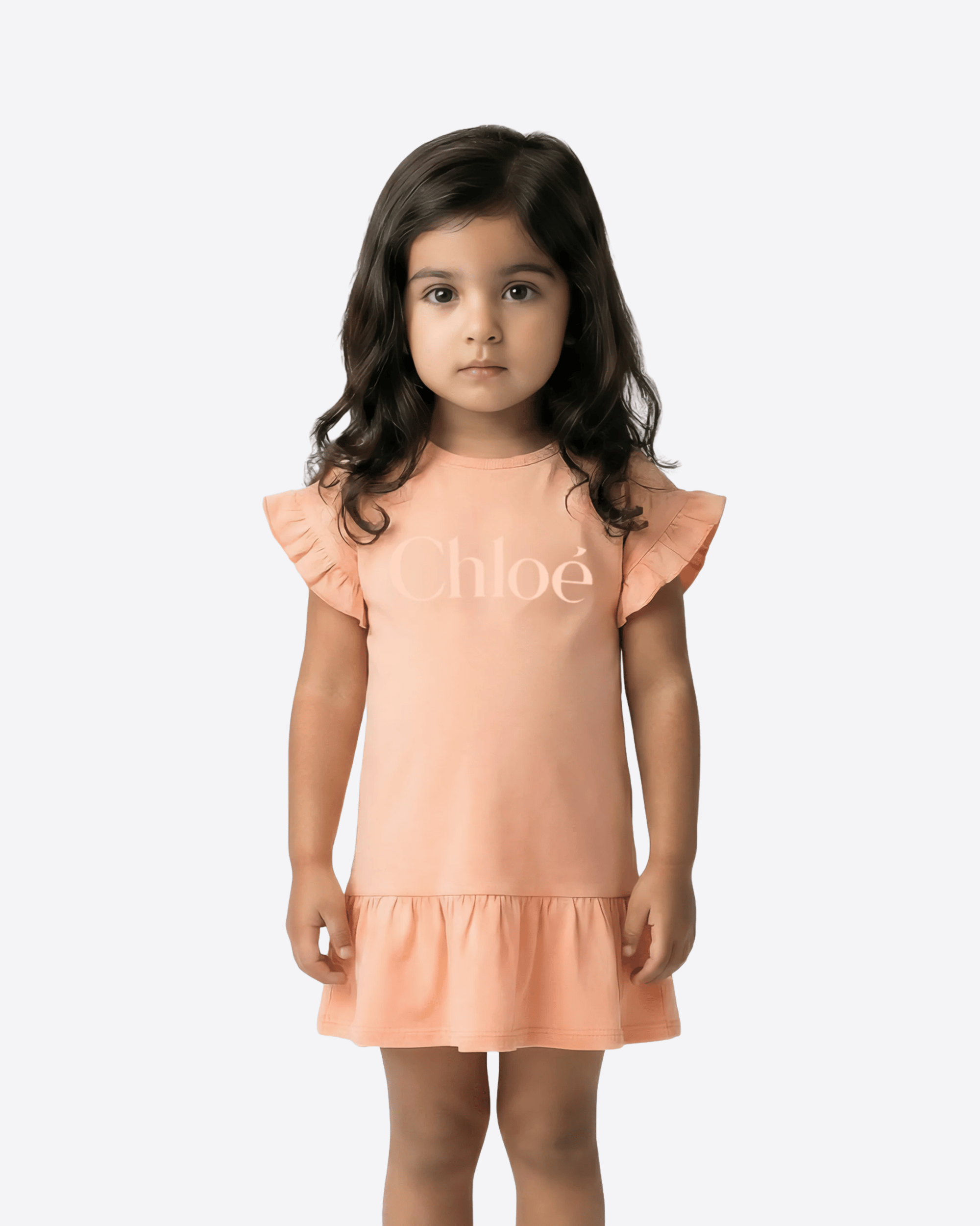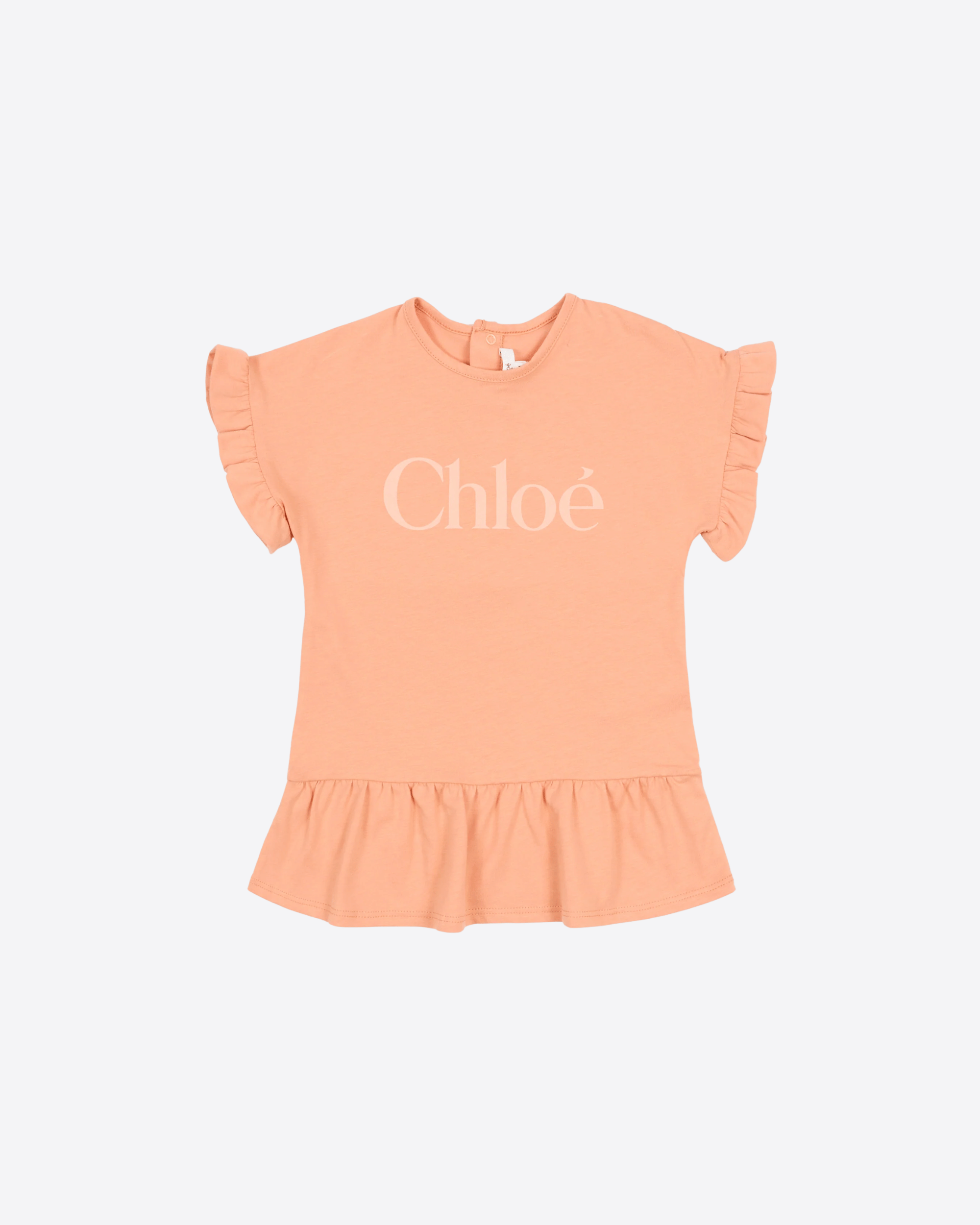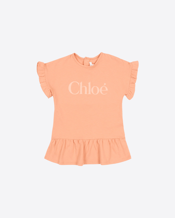 Abito in jersey di cotone dalla mano morbida firmato Chloé Kids, proposto in una delicata tonalità arancione. Il modello presenta girocollo pulito e maniche corte impreziosite da piccoli volant, per un tocco femminile e raffinato. Sul davanti spicca il logo Chloé a contrasto in versione maxi, mentre sul retro la pratica abbottonatura a pressione facilita la vestibilità. Il fondo leggermente arricciato crea una balza fluida che dona movimento alla linea essenziale del capo.