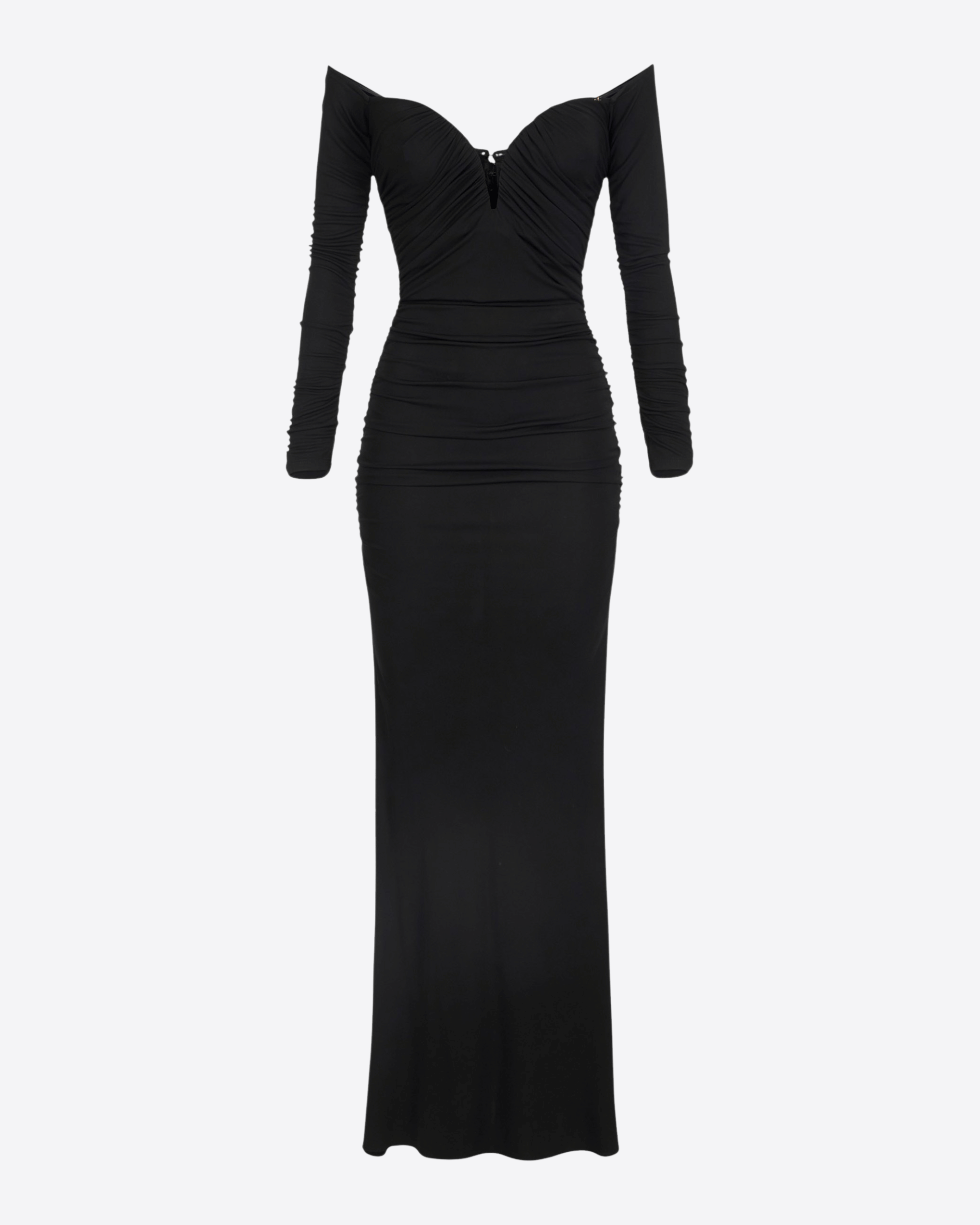 Abito da sera in jersey crêpe dalla vestibilità aderente, caratterizzato da maniche lunghe e scollo a cuore che scopre delicatamente le spalle. I fitti drappeggi donano morbidezza al capo, mentre lo spicchio sul retro della gonna aggiunge tridimensionalità. Un dettaglio con logo completa l’abito con un tocco distintivo.