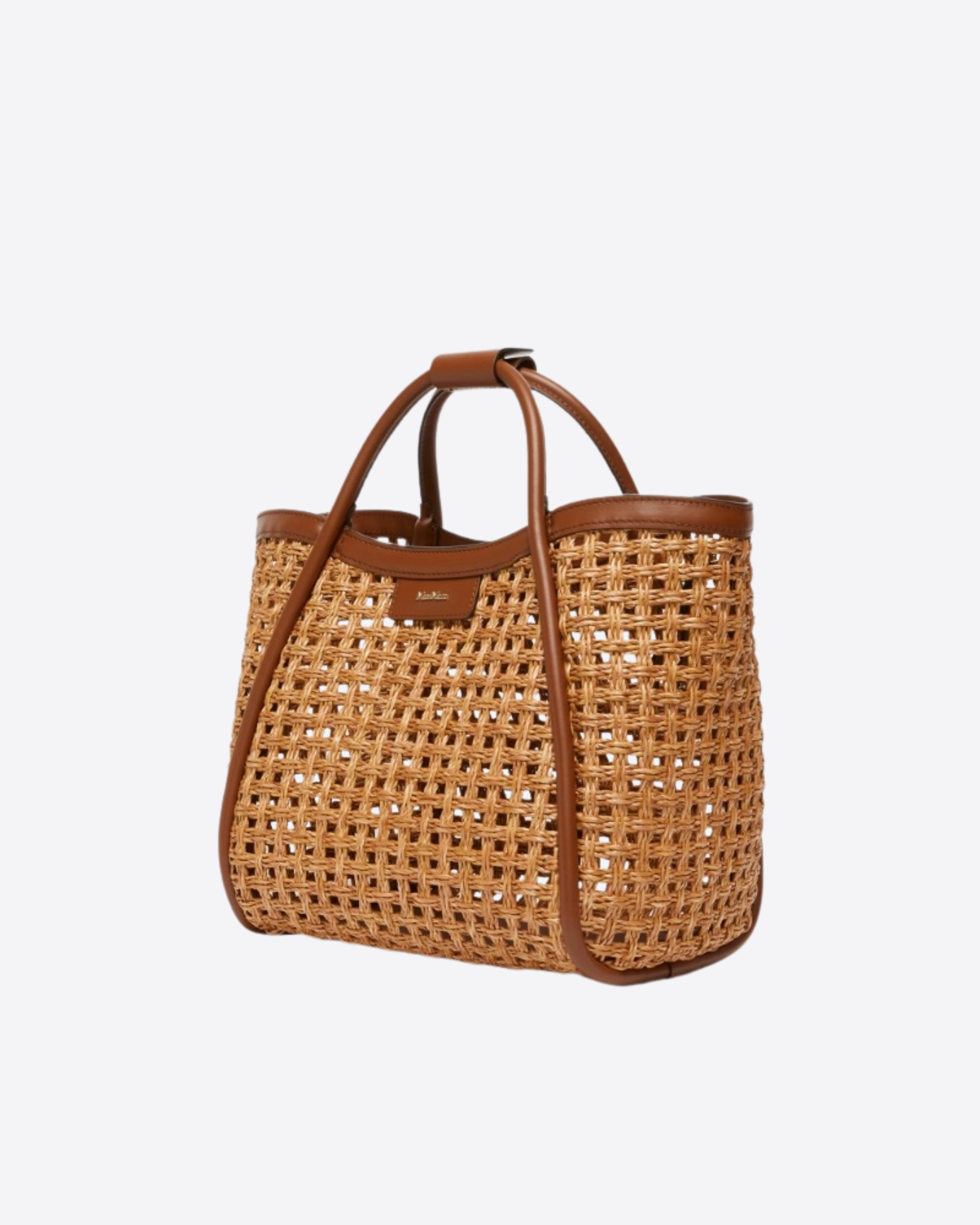 Il modello è completato da una pochette interna rimovibile in tessuto effetto rafia e pelle, dotata di laccio dragonne da polso. I manici tubolari sono trattenuti da un braccialetto con bottone a pressione, mentre la tracolla rimovibile può essere agganciata alle anelle interne laterali per una maggiore versatilità. Il lettering frontale di Max Mara e i cinque piedini in metallo valorizzano il design, mentre la chiusura superiore con calamita garantisce praticità e sicurezza.