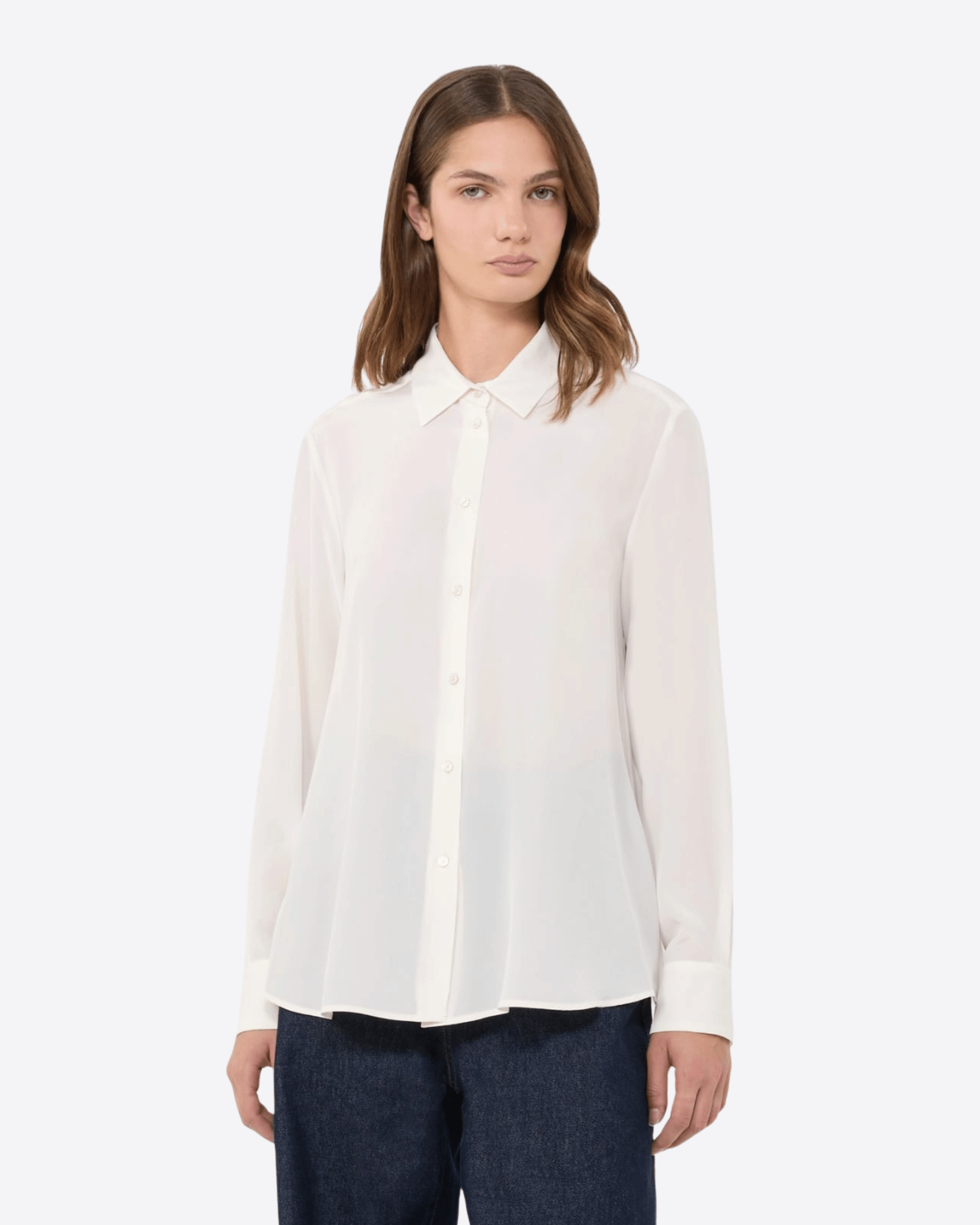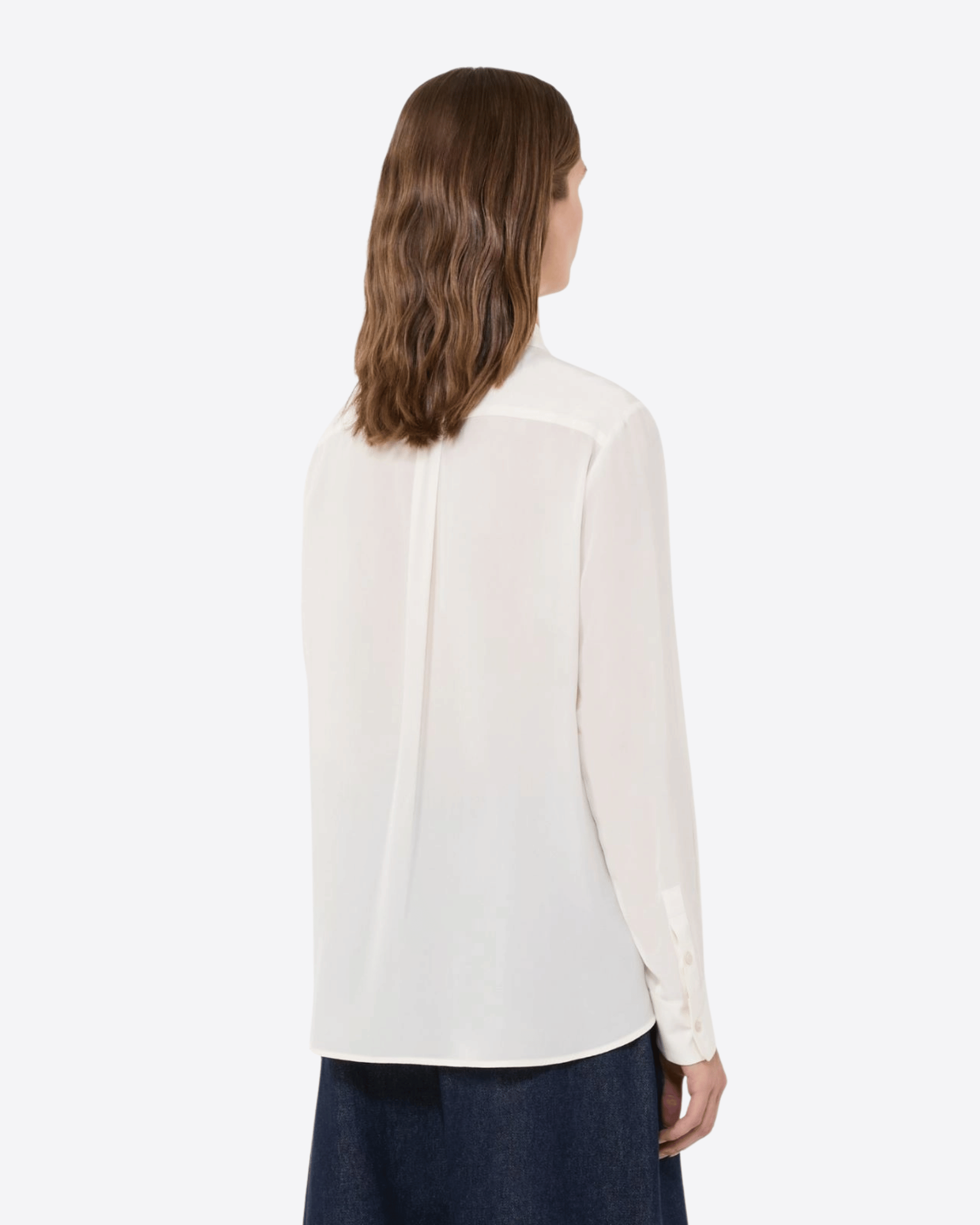 Camicia d'ispirazione classica dalla linea morbida, realizzata in crêpe de Chine di pura seta. Presenta una linea leggermente svasata al fondo, colletto e polsini a camicia e maniche lunghe a giro. La chiusura frontale è con bottoni a vista, mentre sul retro il taglio sprone e la piega sulla schiena assicurano comfort e libertà di movimento. Il fondo stondato completa il design elegante e raffinato della camicia.