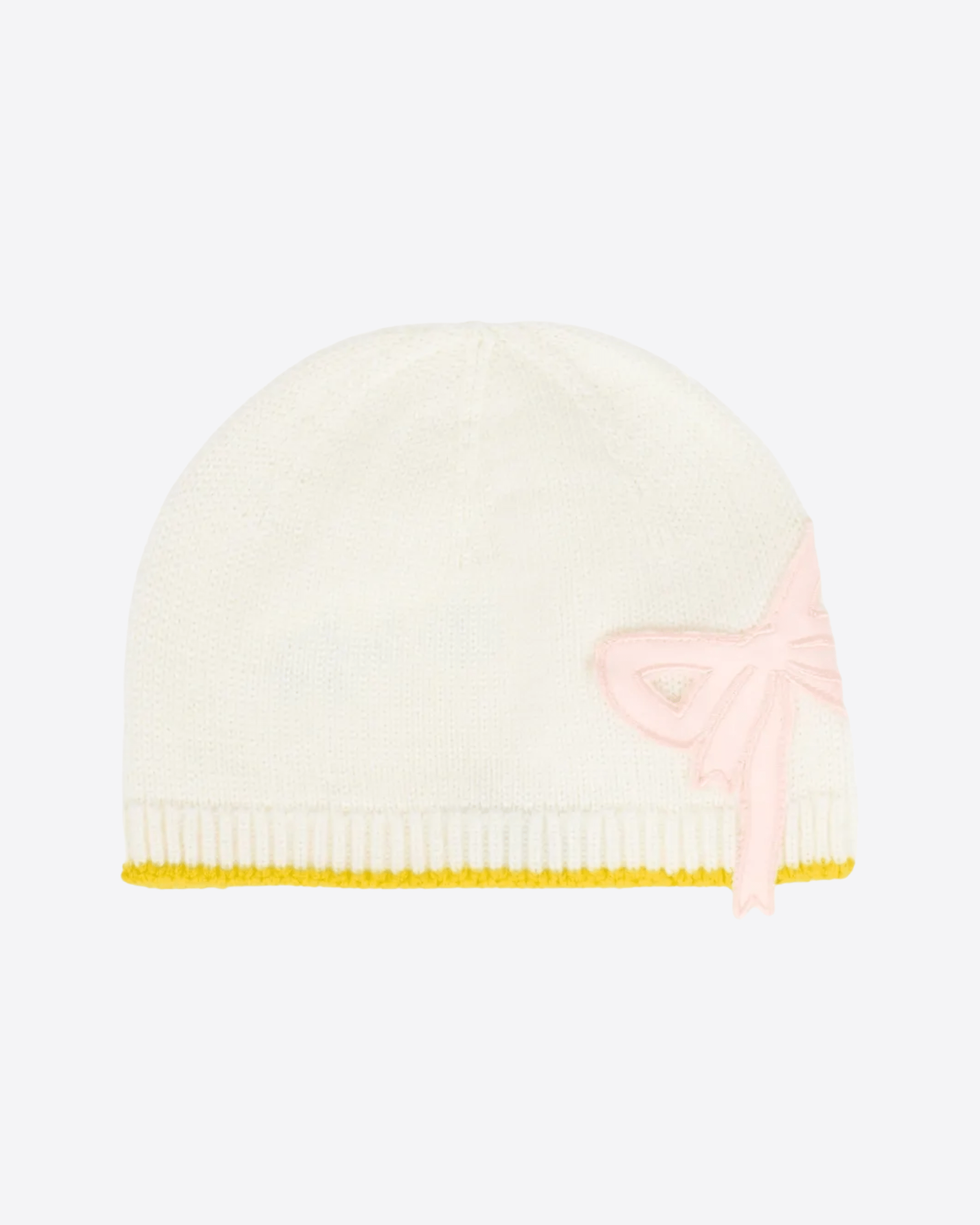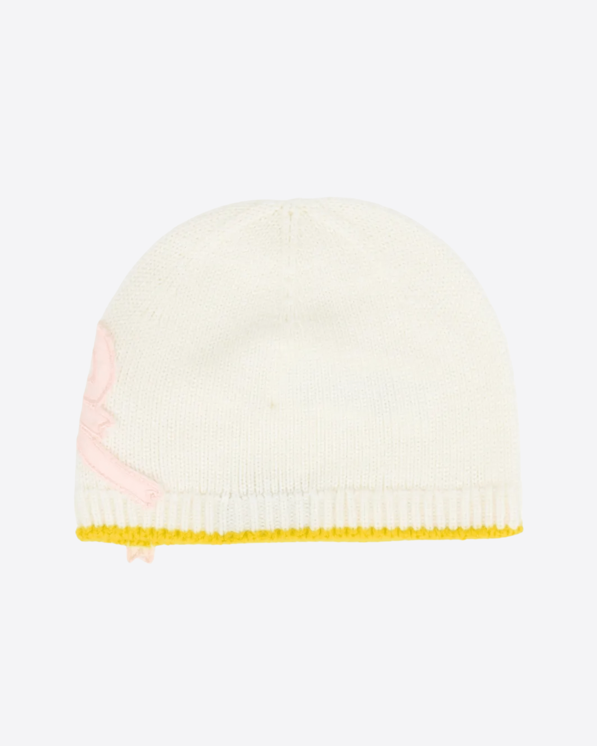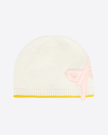 Cappello realizzato in lana con applicazione fiocco e linea gialla al borso, caratteristica del brand Gensami