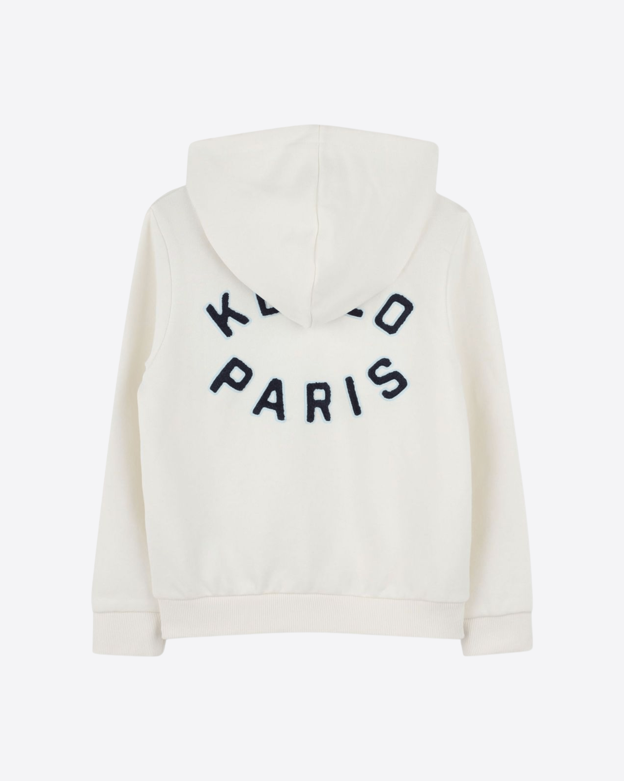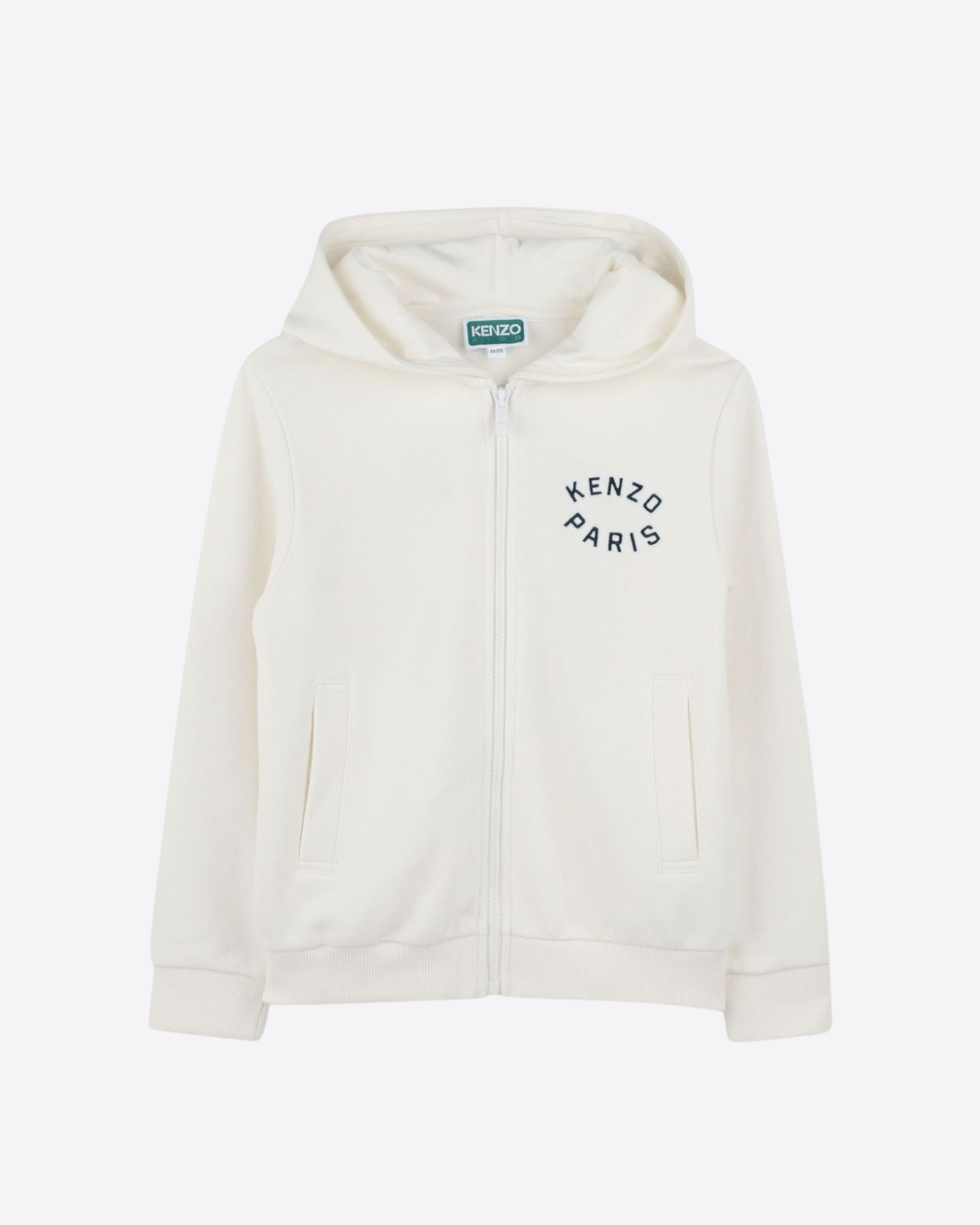 Off-white cotton T-shirt embroidered logo on the chest embroidered logo on the back front zip classic hood long sleeves two side welt pockets ribbed cuffs and hem.