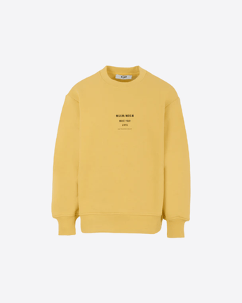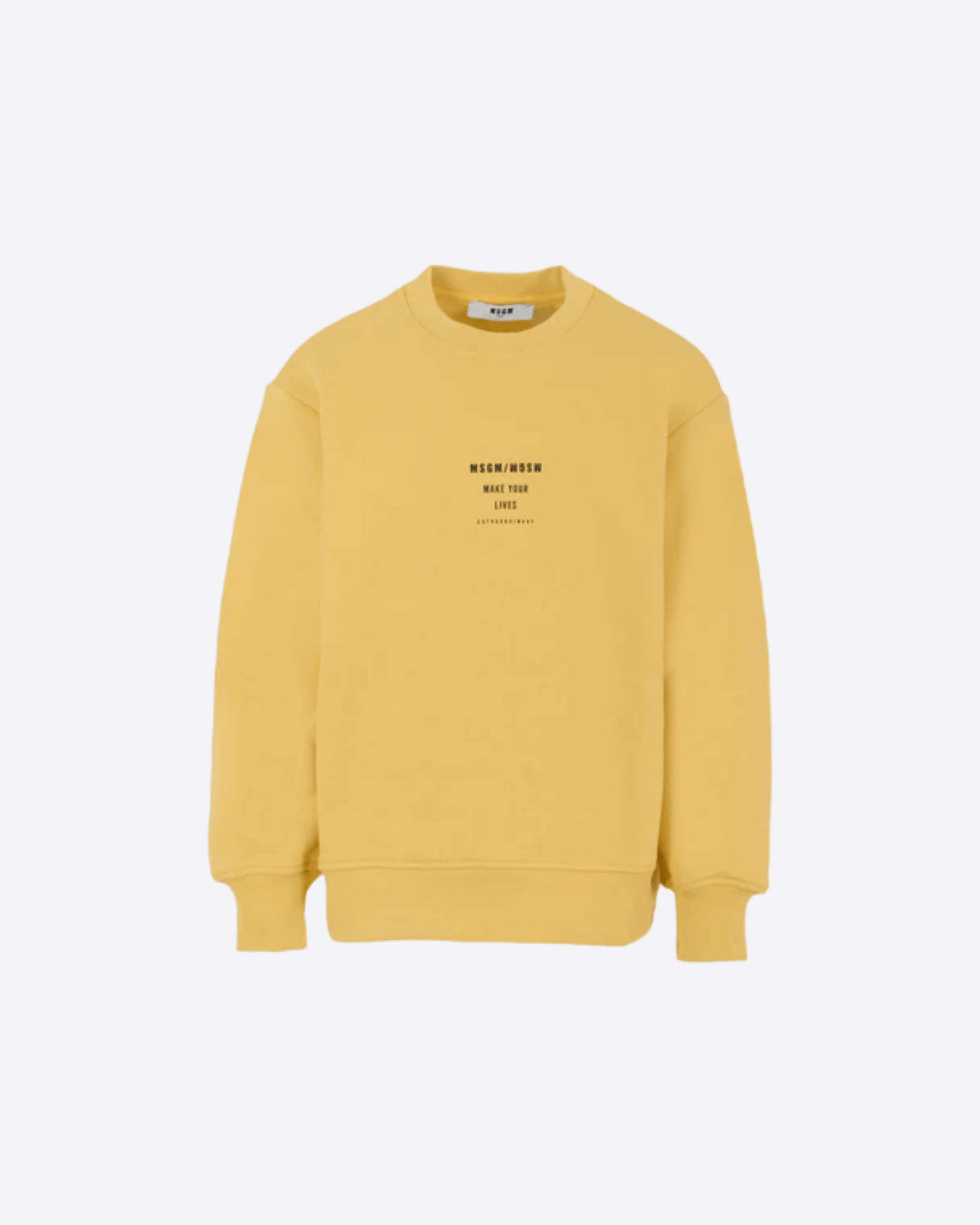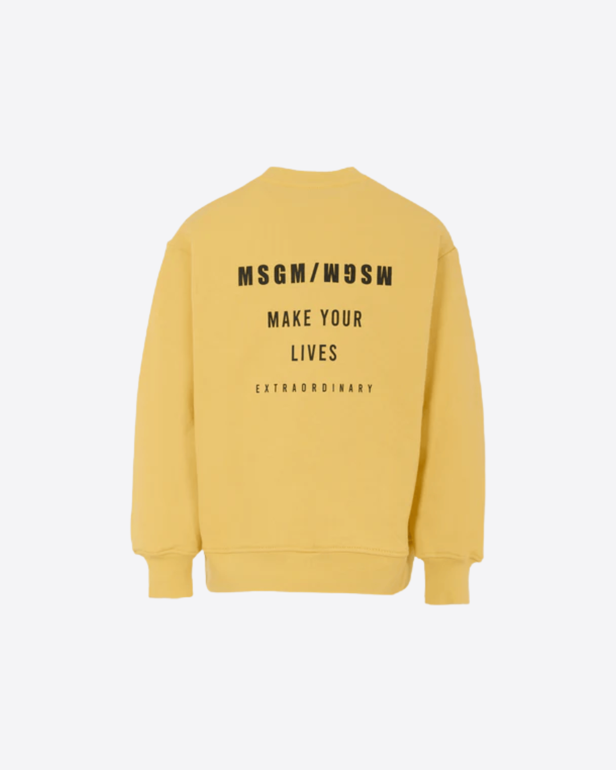 Felpa gialla senza cappuccio, realizzata in morbido cotone per massimo comfort. Presenta logo a contrasto sia sul davanti che sul retro, con taglio dritto e polsini e orlo elasticizzati per una vestibilità comoda. Perfetta per un look casual e moderno, semplice ma distintiva.