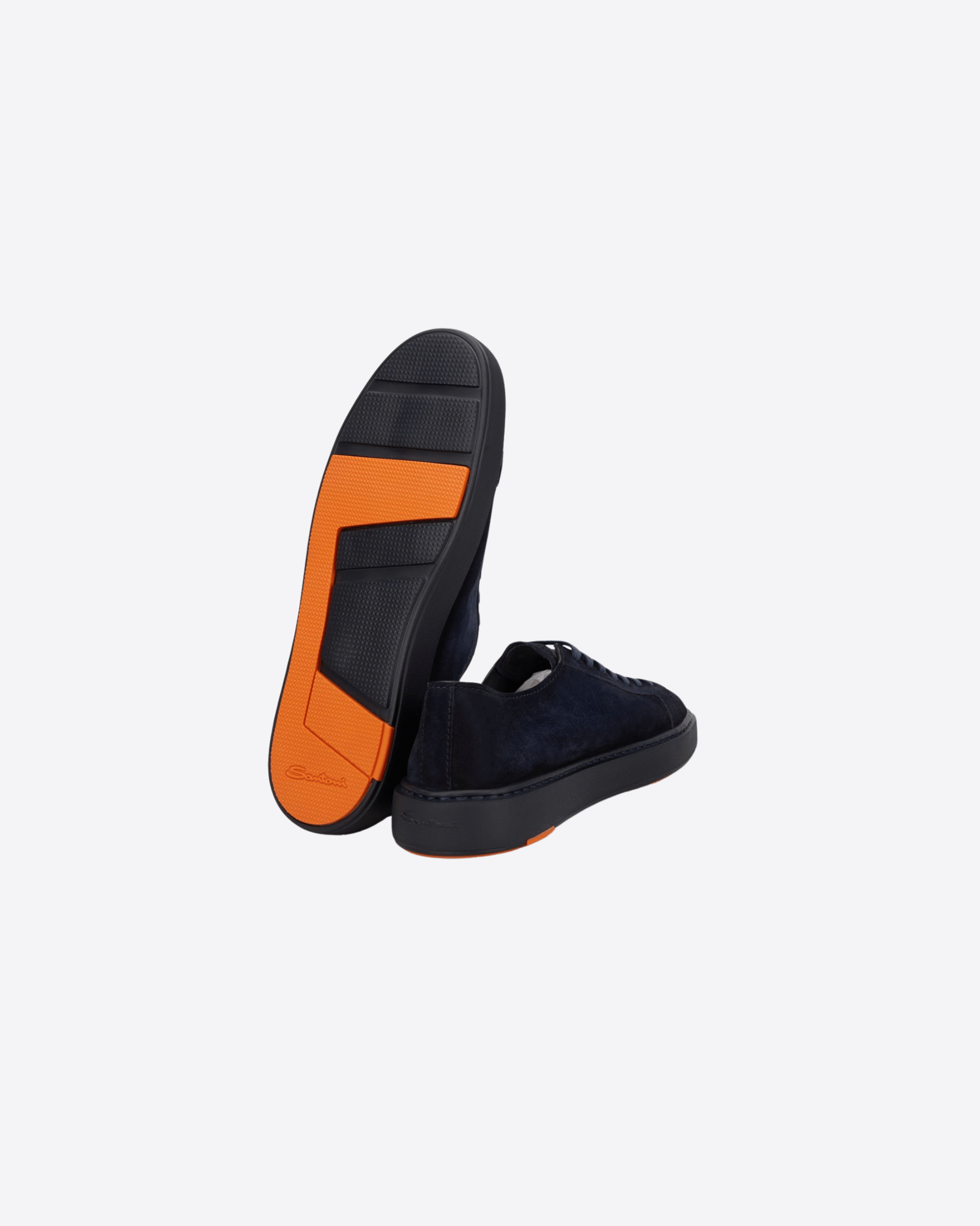 Sneakers Santoni "Ford" da uomo, realizzate in pelle scamosciata blu notte e trattate con termoformatura per un look sofisticato e durevole. Presentano lacci in cotone piatti tono su tono, battistrada arancio logato, punta tonda e impunture a vista. La suola in gomma da 3,5 cm garantisce comfort e stabilità. Dotate di custodia singola in tessuto per ciascuna scarpa. Calzata regolare. Made in Italy.
