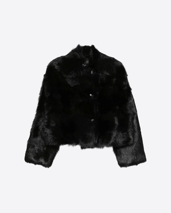 Giacca crop in pelliccia nera Alberta Ferretti, caratterizzata da un design elegante e contemporaneo. Il modello presenta una chiusura frontale con abbottonatura, colletto classico e maniche lunghe, elementi che conferiscono al capo un’estetica sofisticata e senza tempo. La linea cropped valorizza la silhouette, rendendola ideale per completare look ricercati e femminili, sia da giorno che da sera.