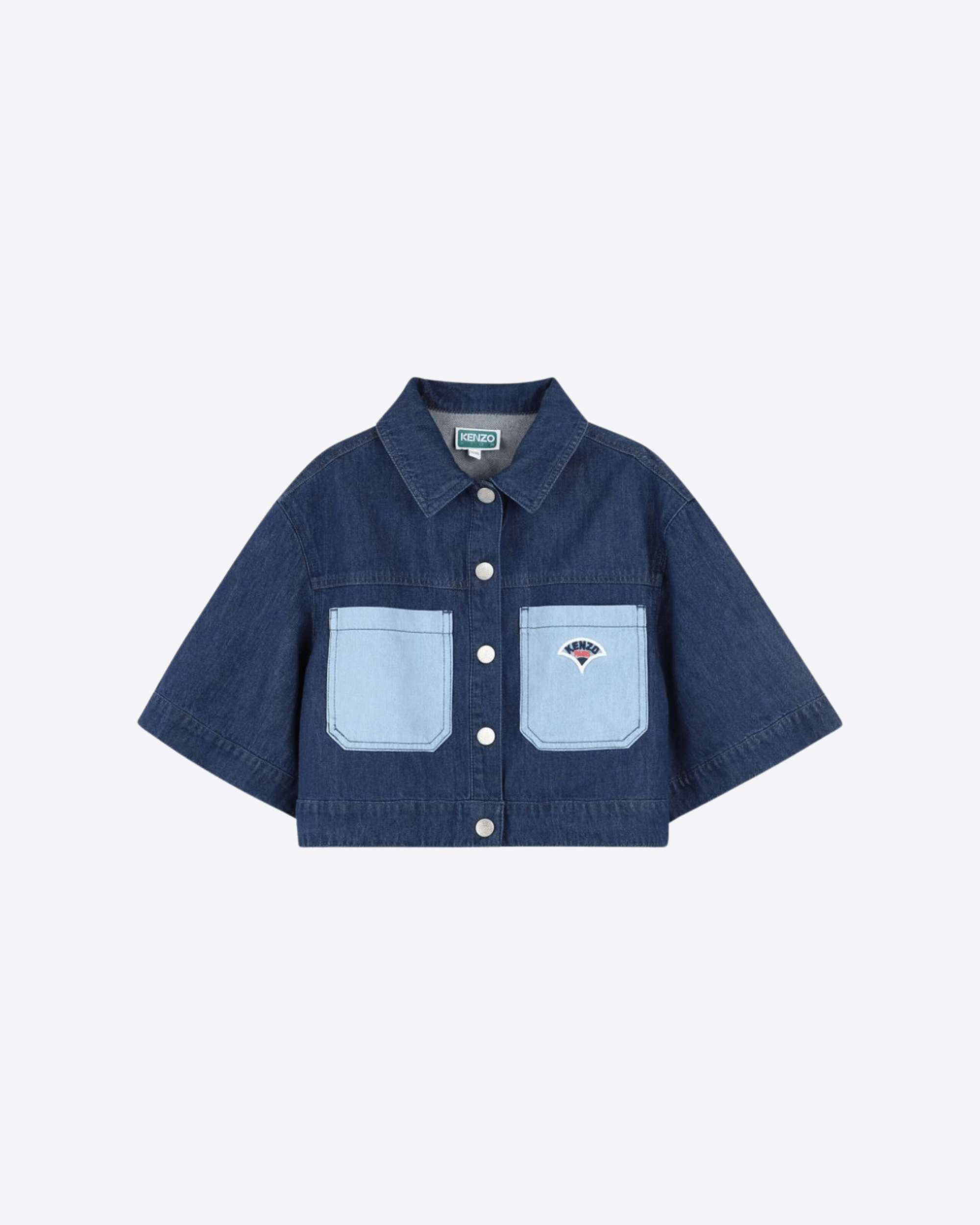 Navy blue cotton denim jacket with Boke Flower motif. French collar, button closure and two patch pockets on the chest. Straight hem for a modern and functional design.