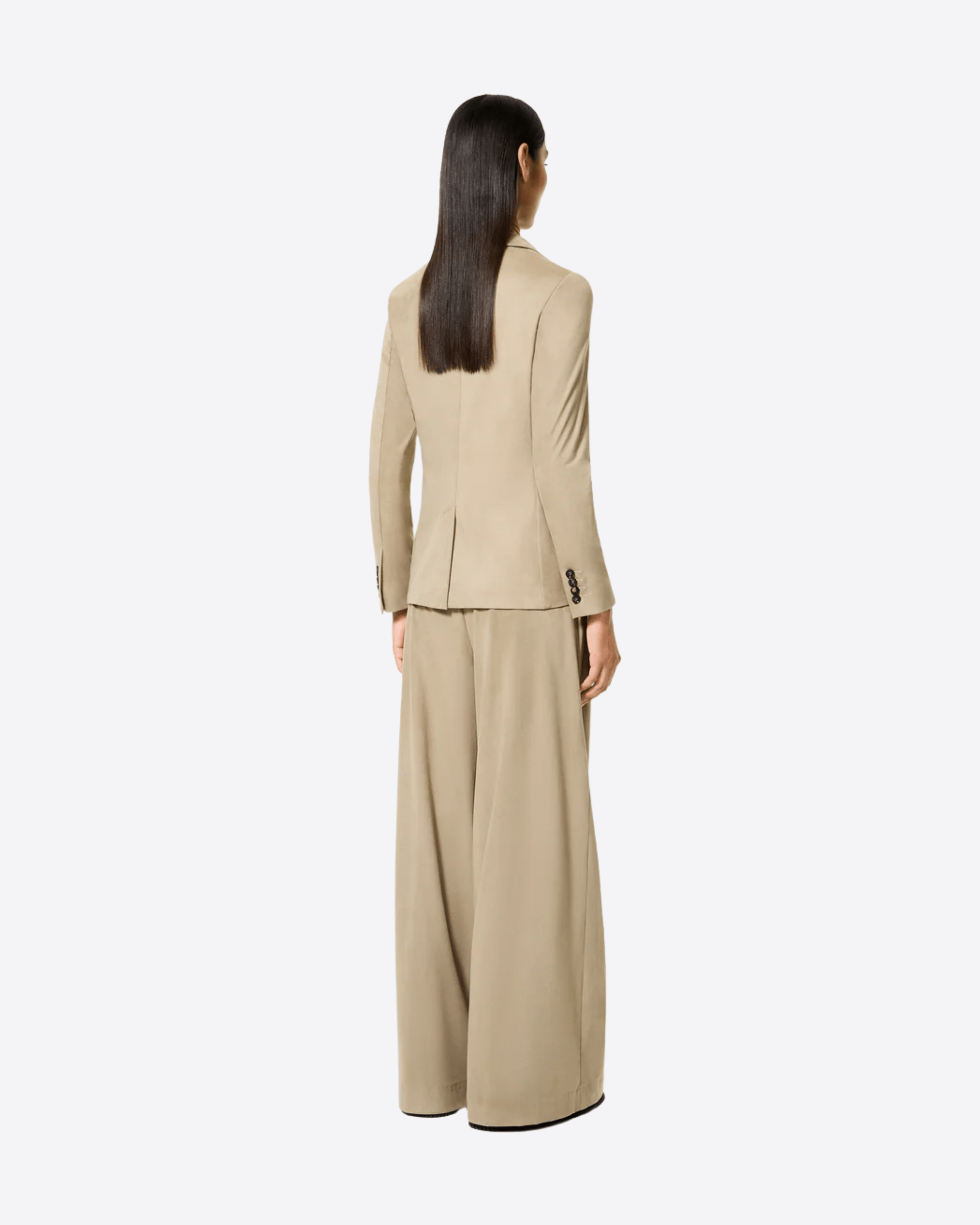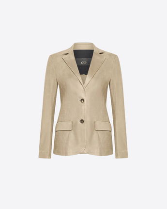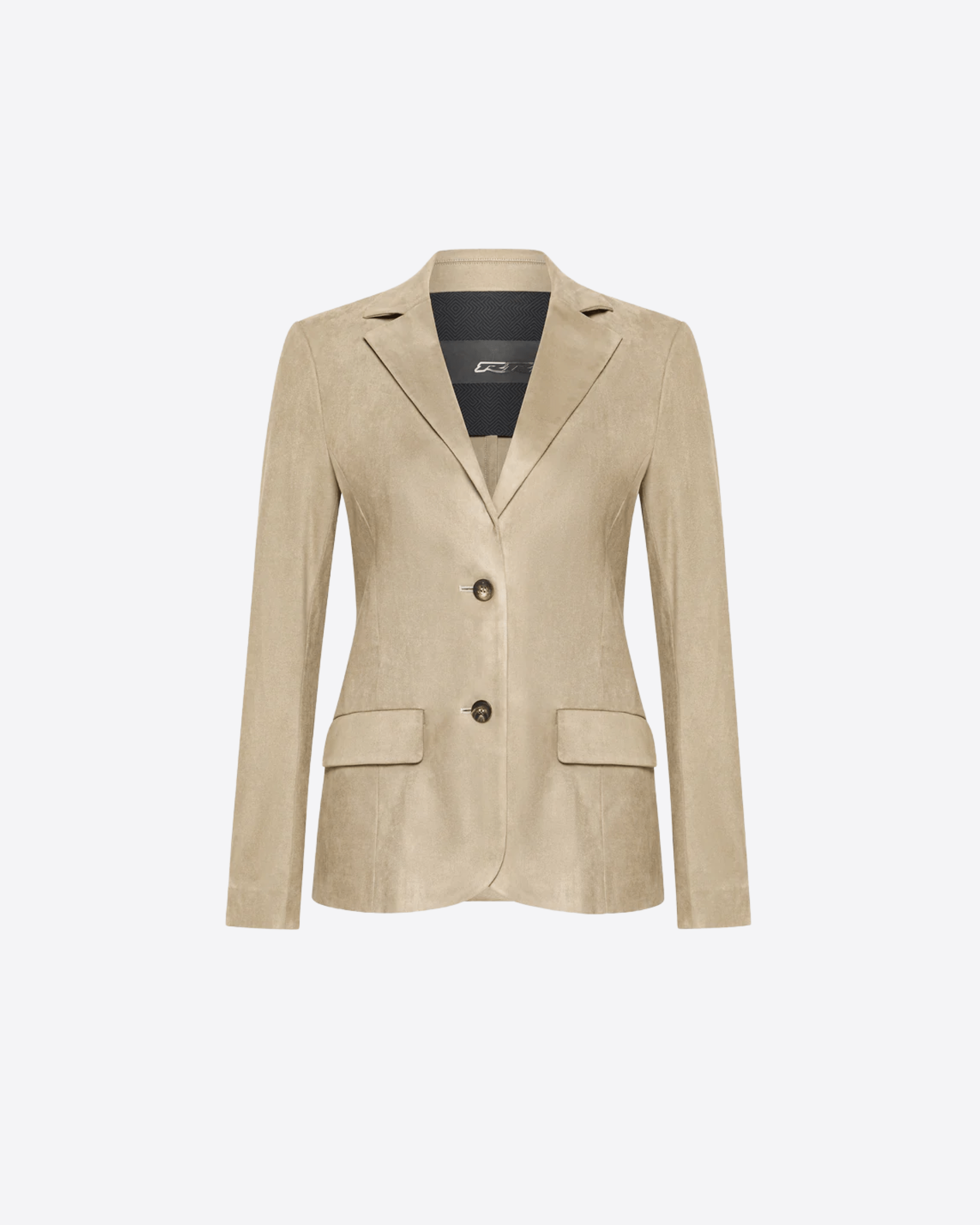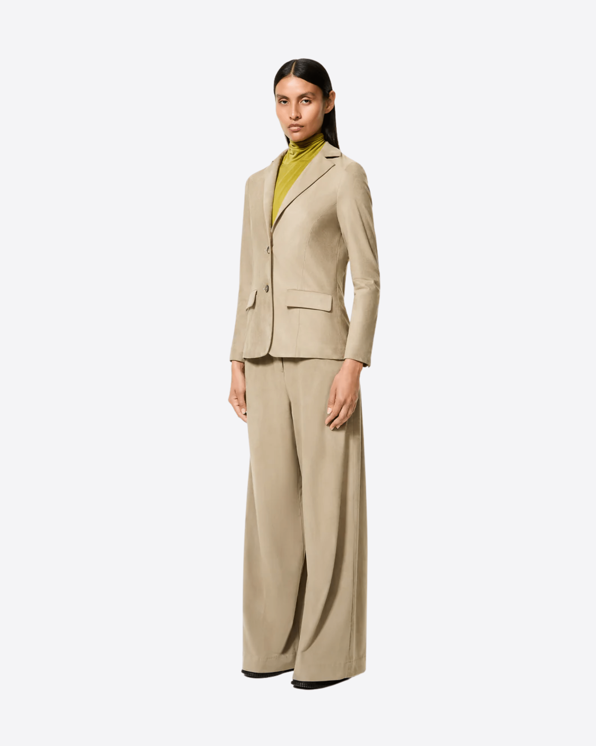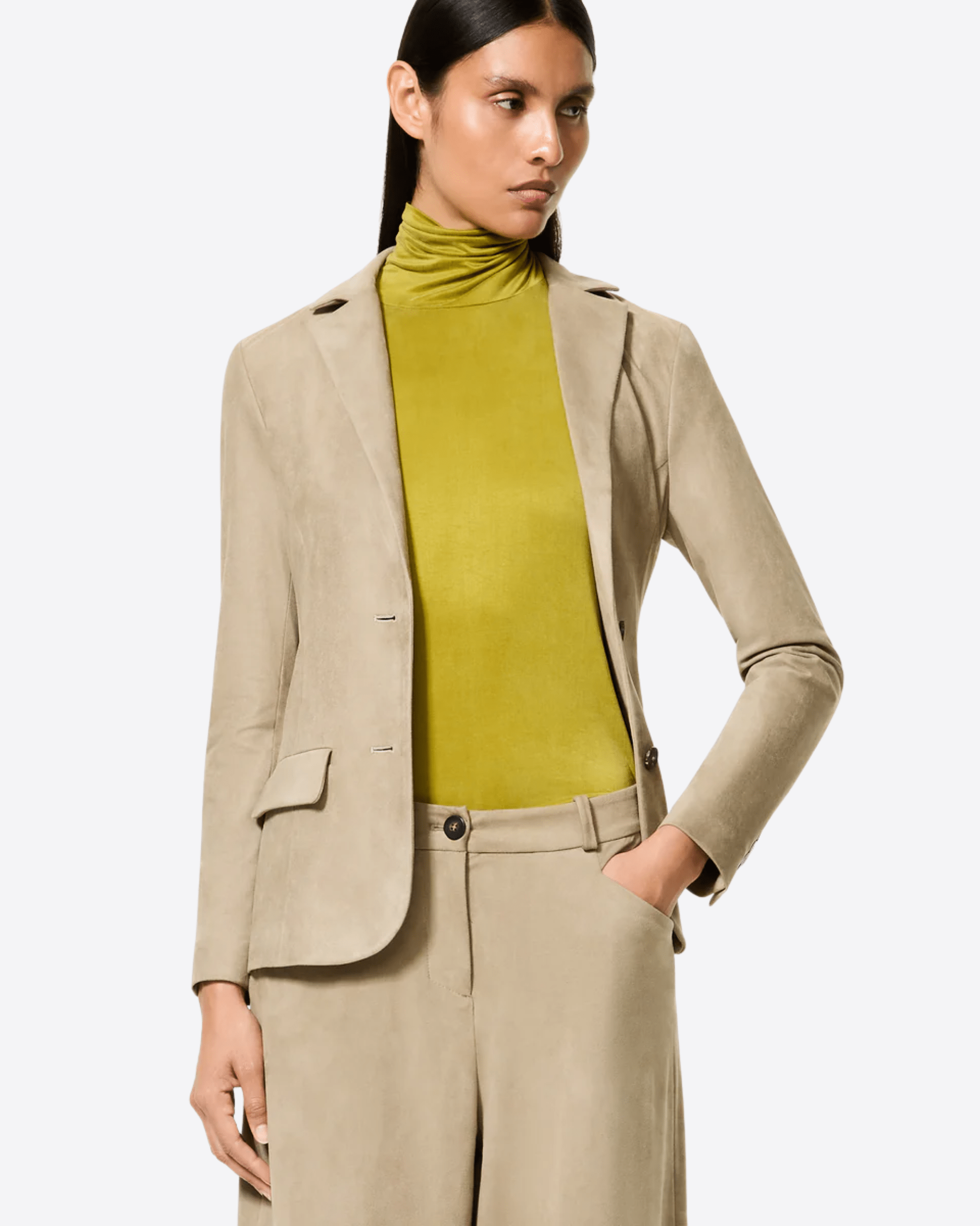 Questo blazer monopetto, realizzato in morbida eco suede che coniuga eleganza e attenzione alla sostenibilità, reinterpreta i codici del guardaroba formale con uno spirito contemporaneo. Il design rivela un equilibrio armonioso tra influenze maschili e dettagli dal gusto femminile, in un gioco di contrasti raffinati. La silhouette è valorizzata dalla sciancratura in vita e dai revers sottili dalle linee nette, mentre le tasche con pattina aggiungono un accento di sobria sofisticazione. Versatile e ricco di personalità, si presta a molteplici interpretazioni: indossato con un pantalone cargo dal taglio asciutto, dà vita a un look urban chic che unisce con naturalezza praticità e ricercatezza.